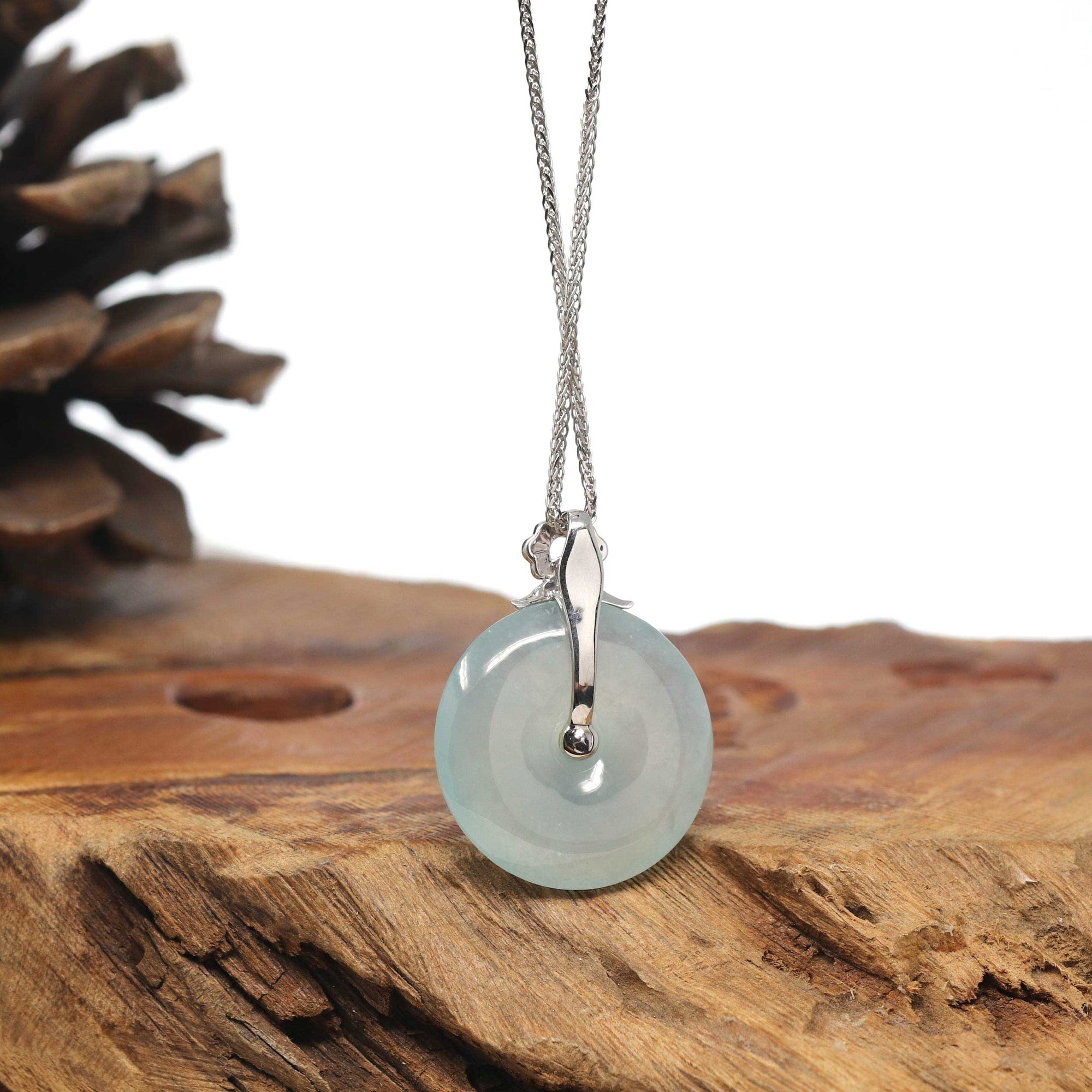 18K White Gold "Good Luck Button" Necklace Ice Light Blue Jadeite Jade Pendant Necklace