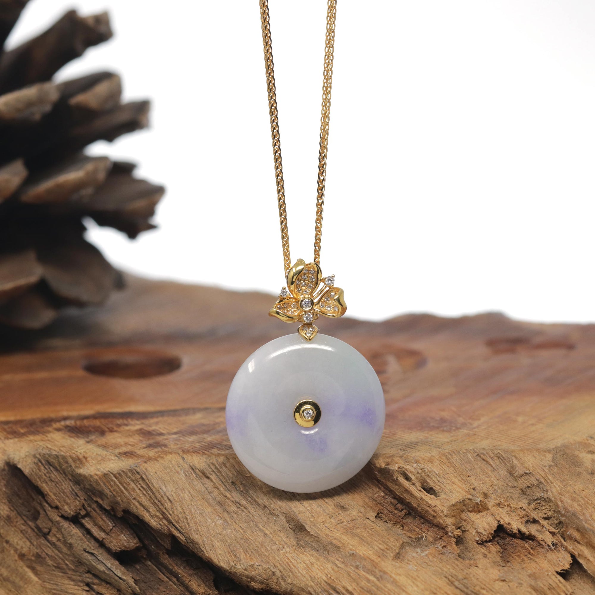 "Good Luck Button" Lavender Jadeite Jade Lucky KouKou Pendant With 14K Yellow Gold Diamond Bail