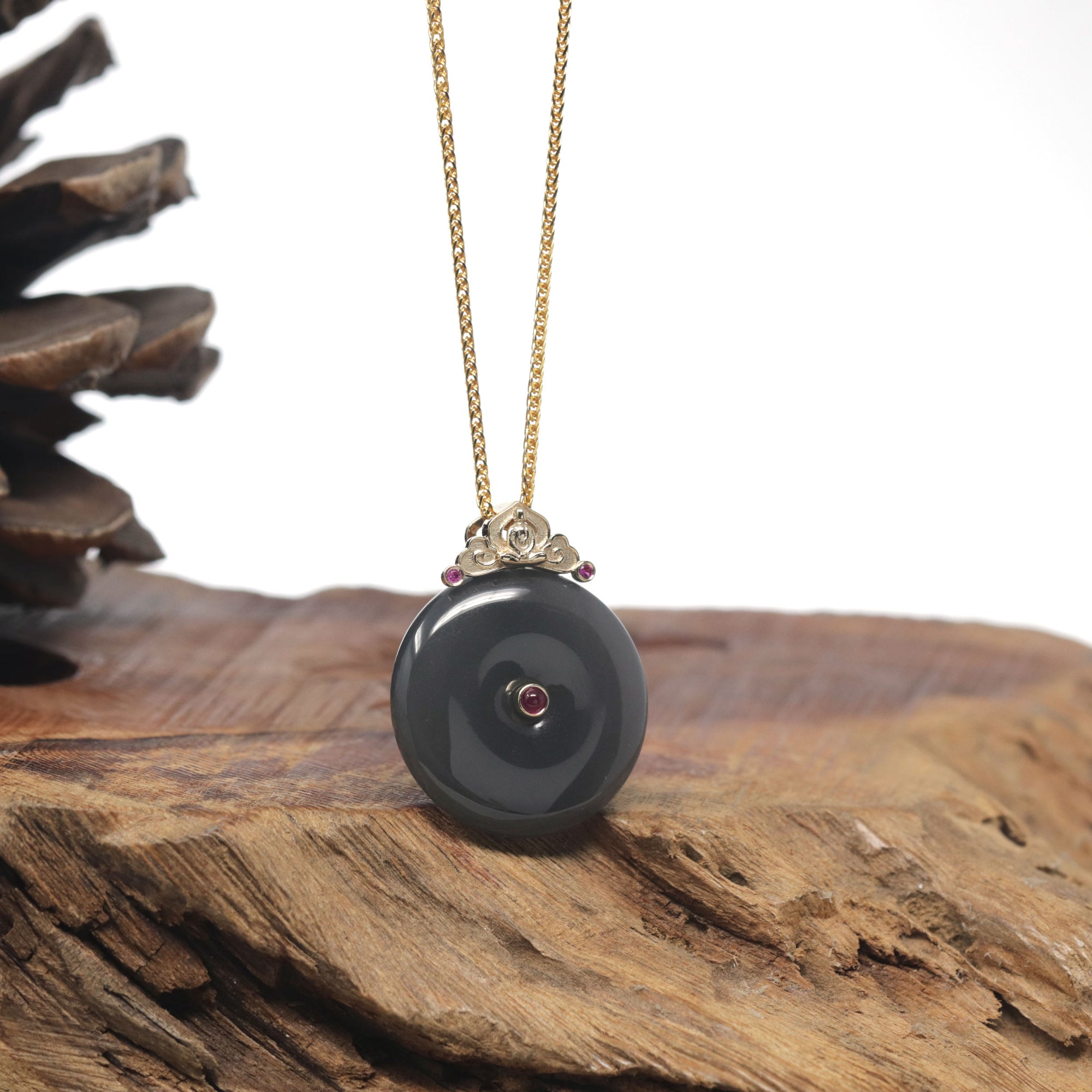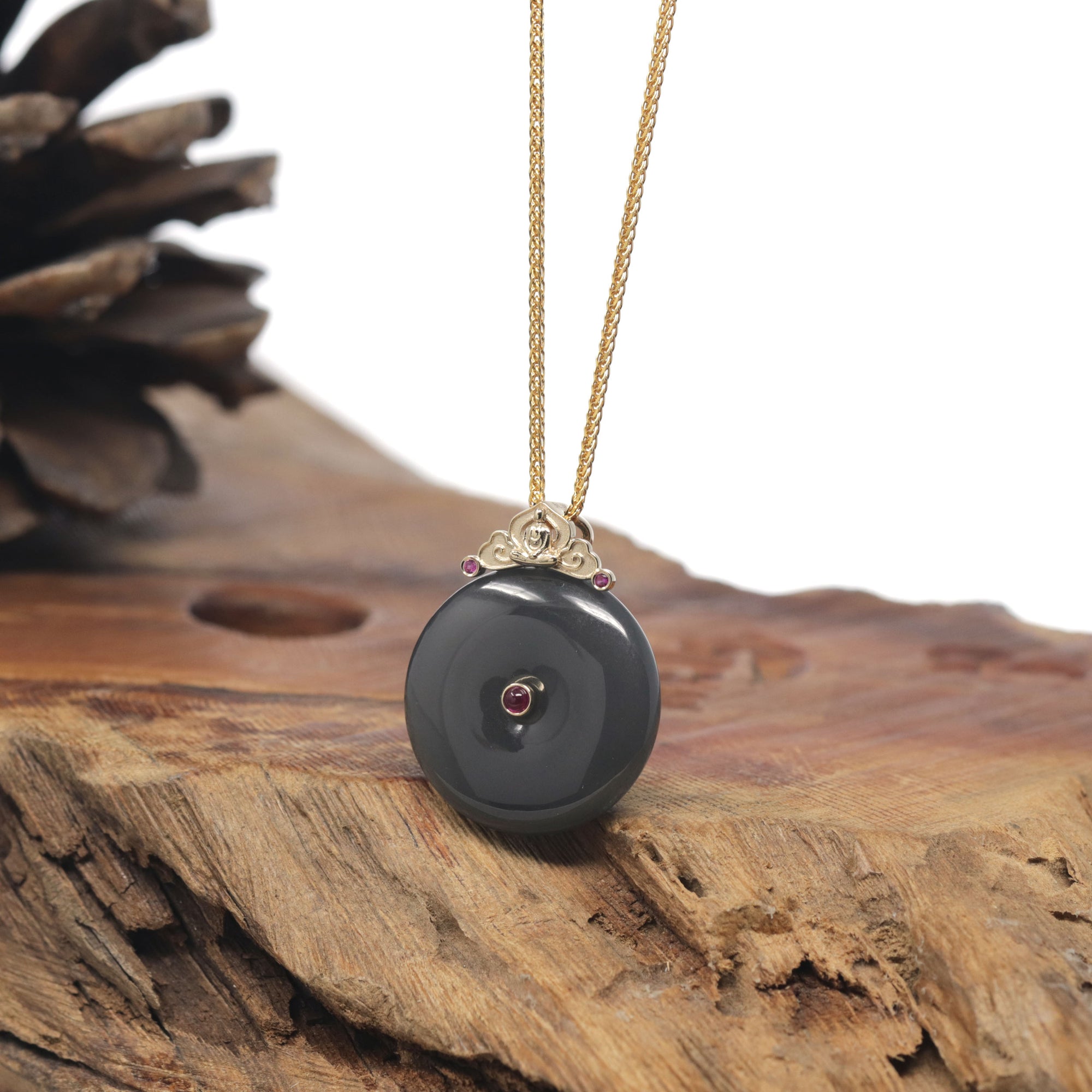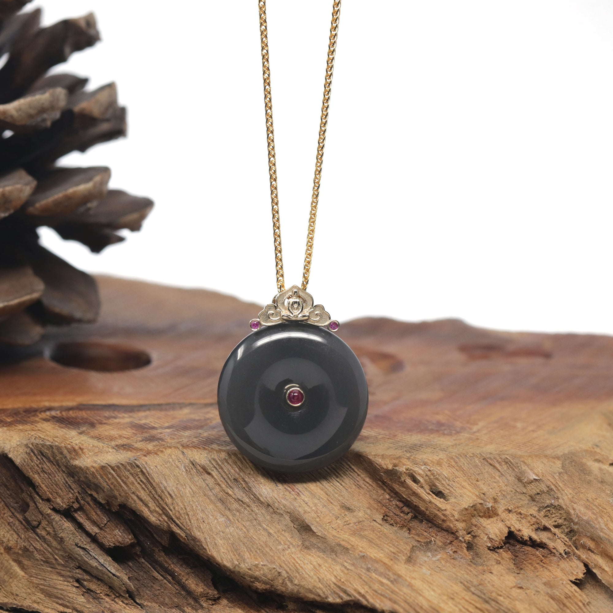 18k Rose Gold Genuine Burmese Jadeite Lucky Kou Kou Pendant Necklace With AA Ruby
