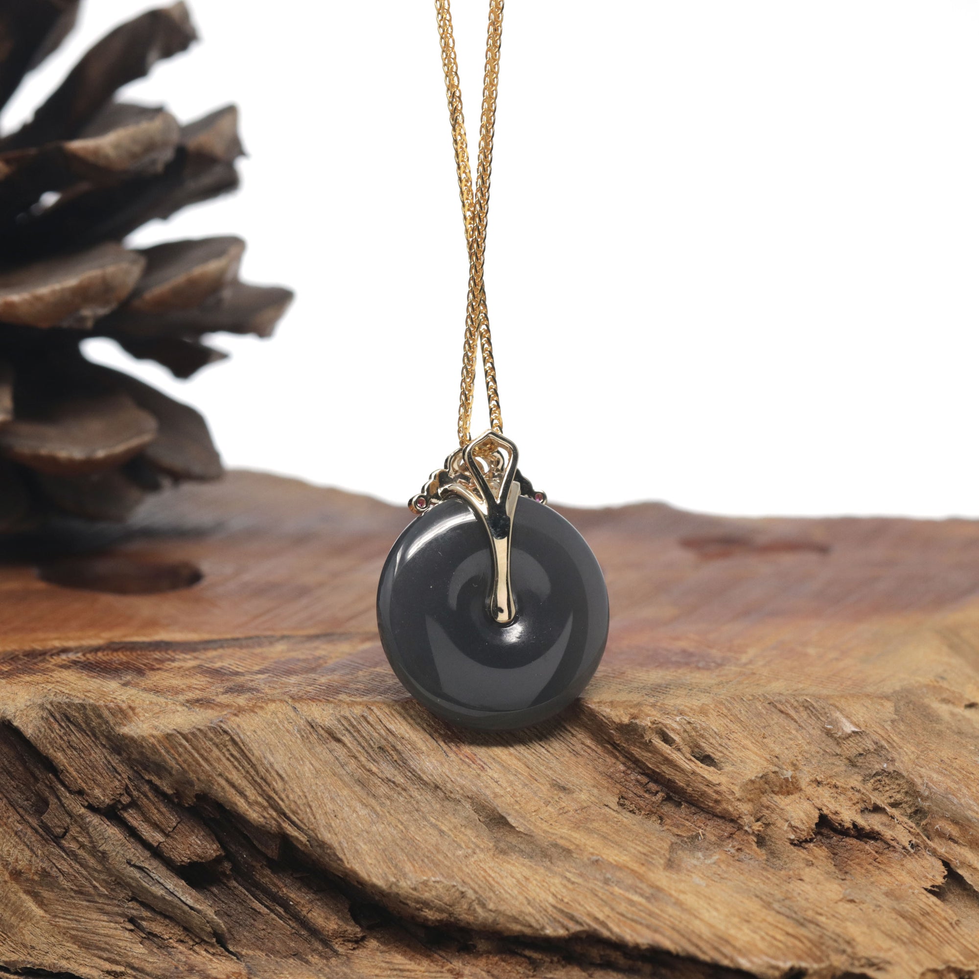 18K Yellow Gold "Good Luck Button" Necklace Forest Green Jadeite Jade Pendant Necklace