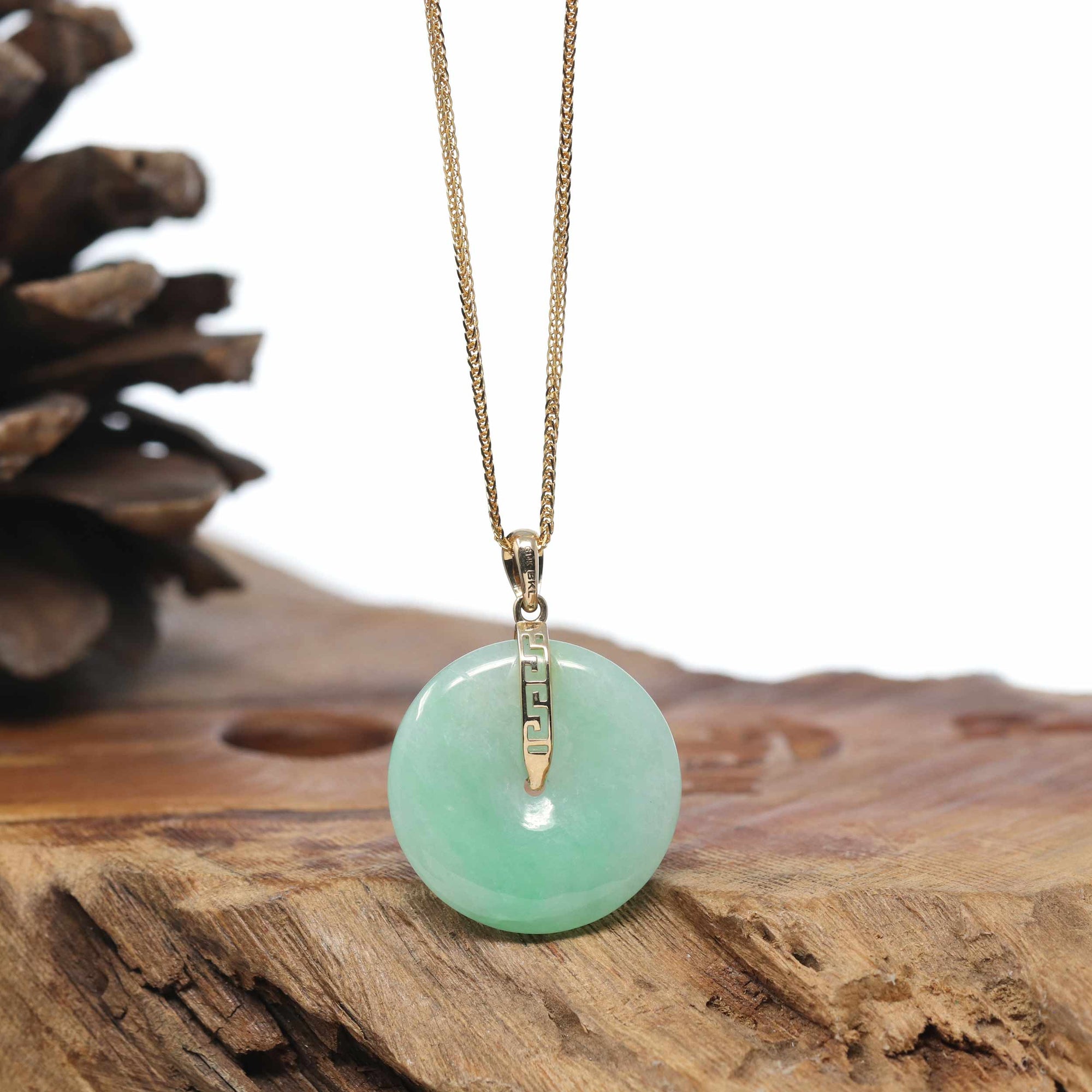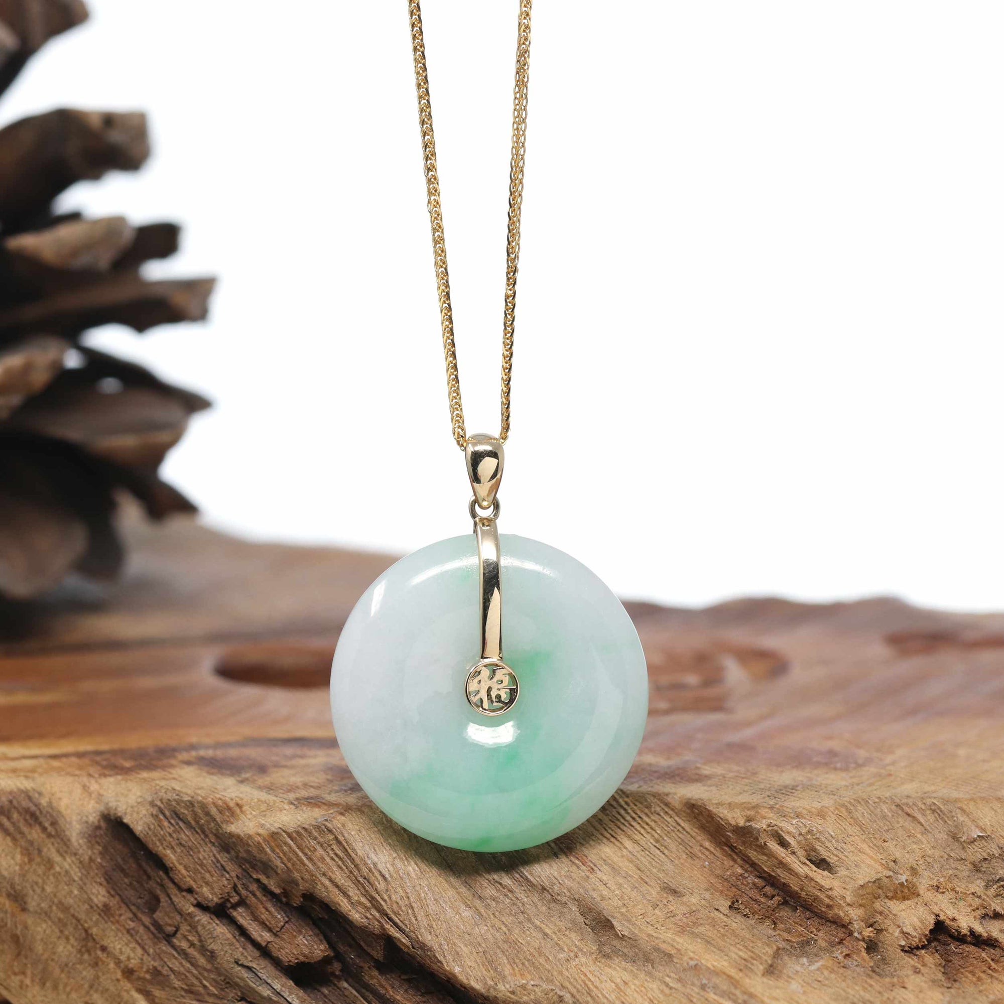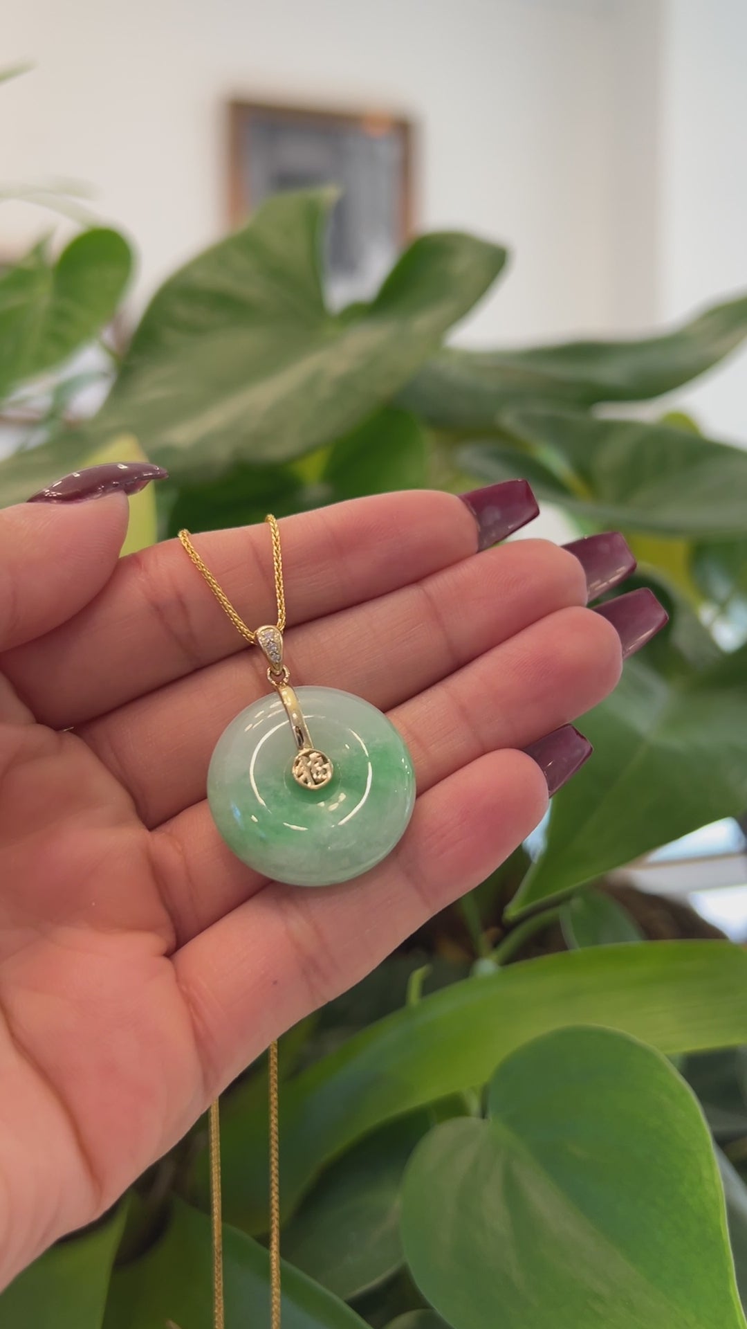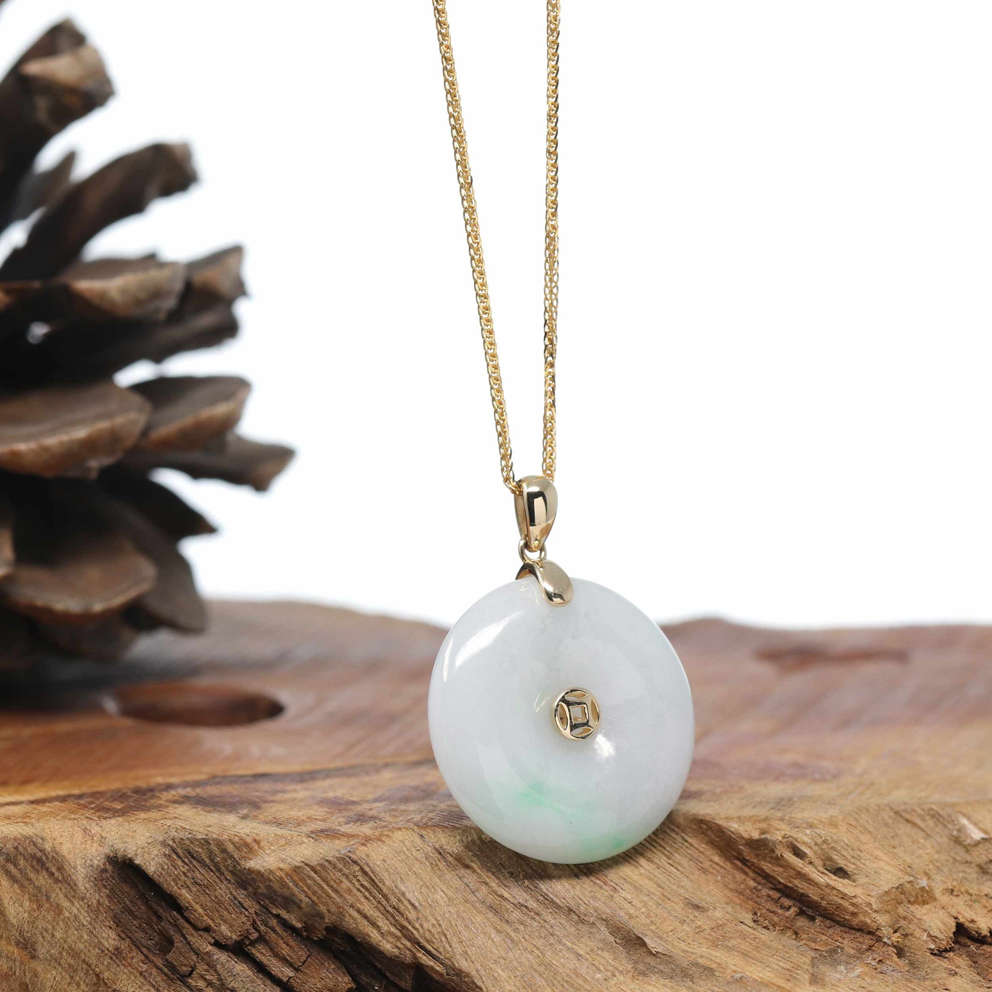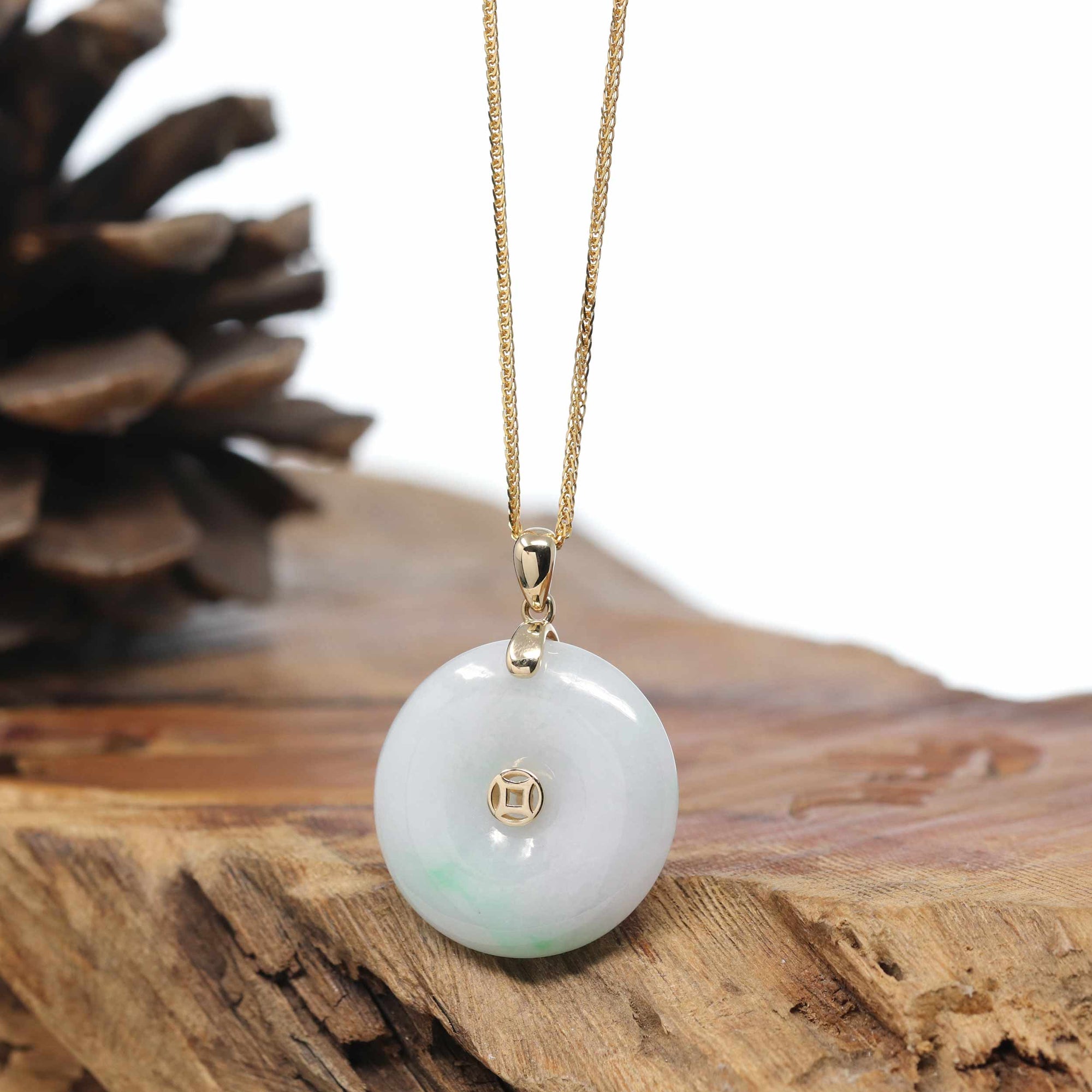 14K Gold "Good Luck Button" Necklace Ice Green Jadeite Jade Lucky KouKou Pendant Necklace