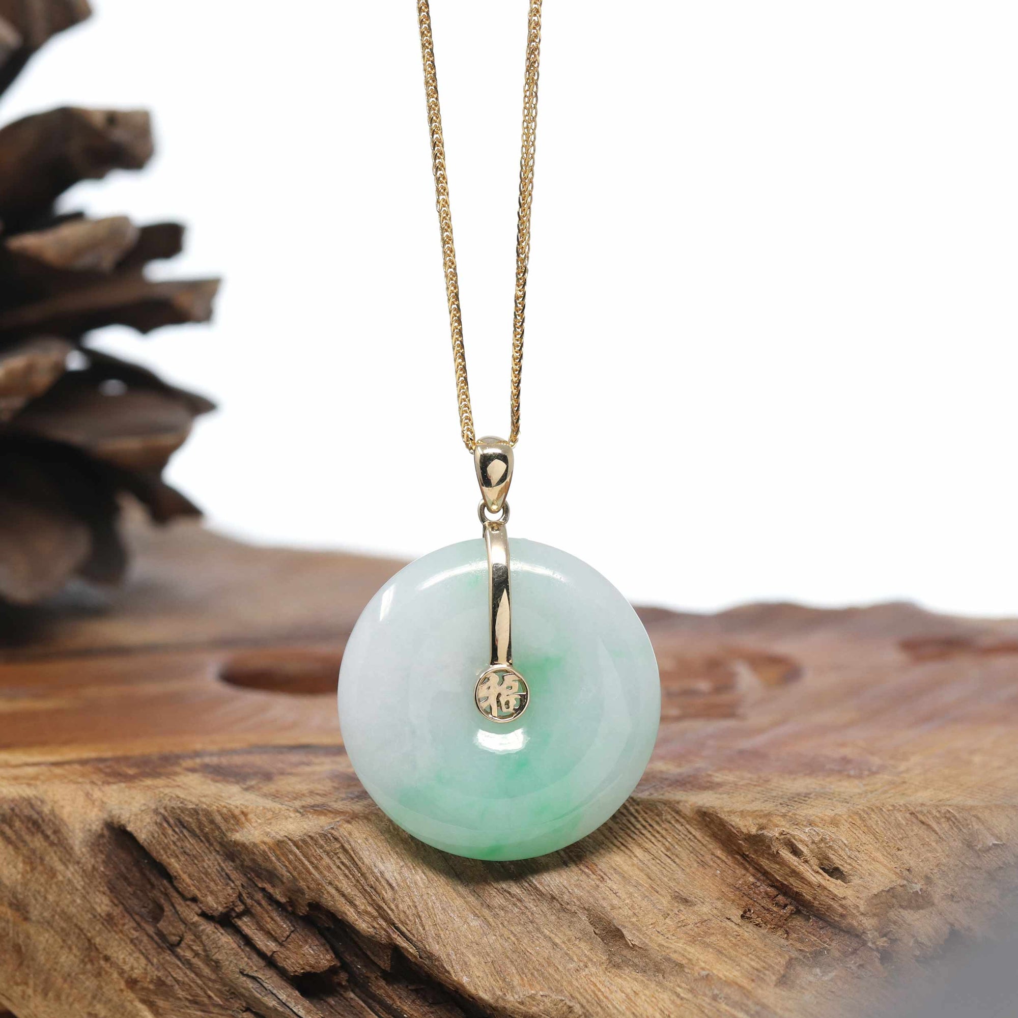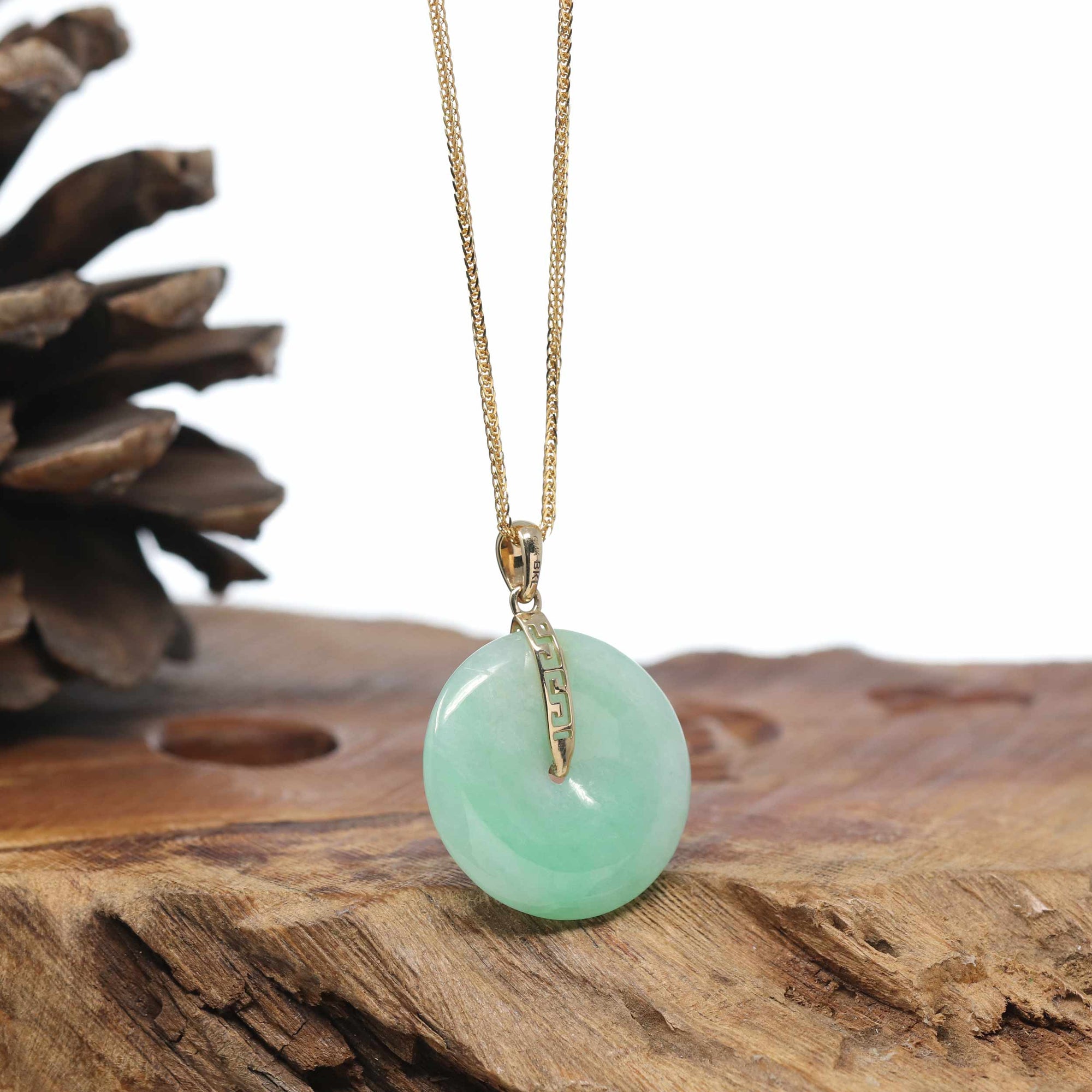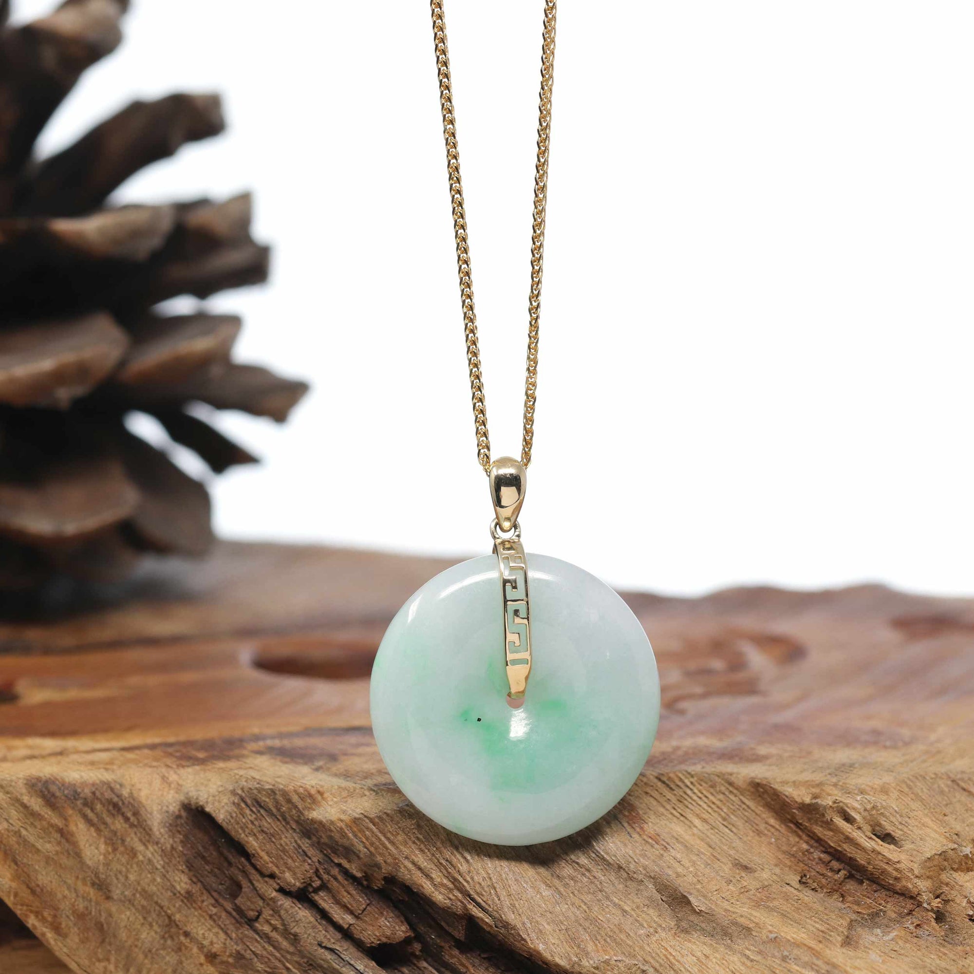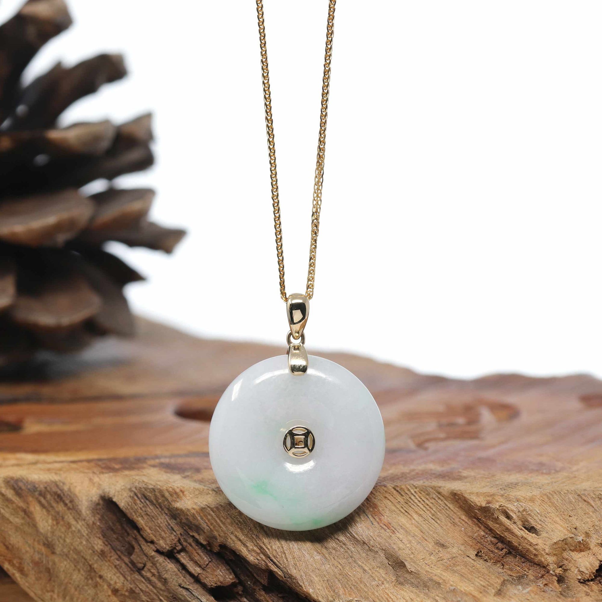 14K Gold "Good Luck Button" Necklace Ice Green Jadeite Jade Lucky KouKou Pendant Necklace