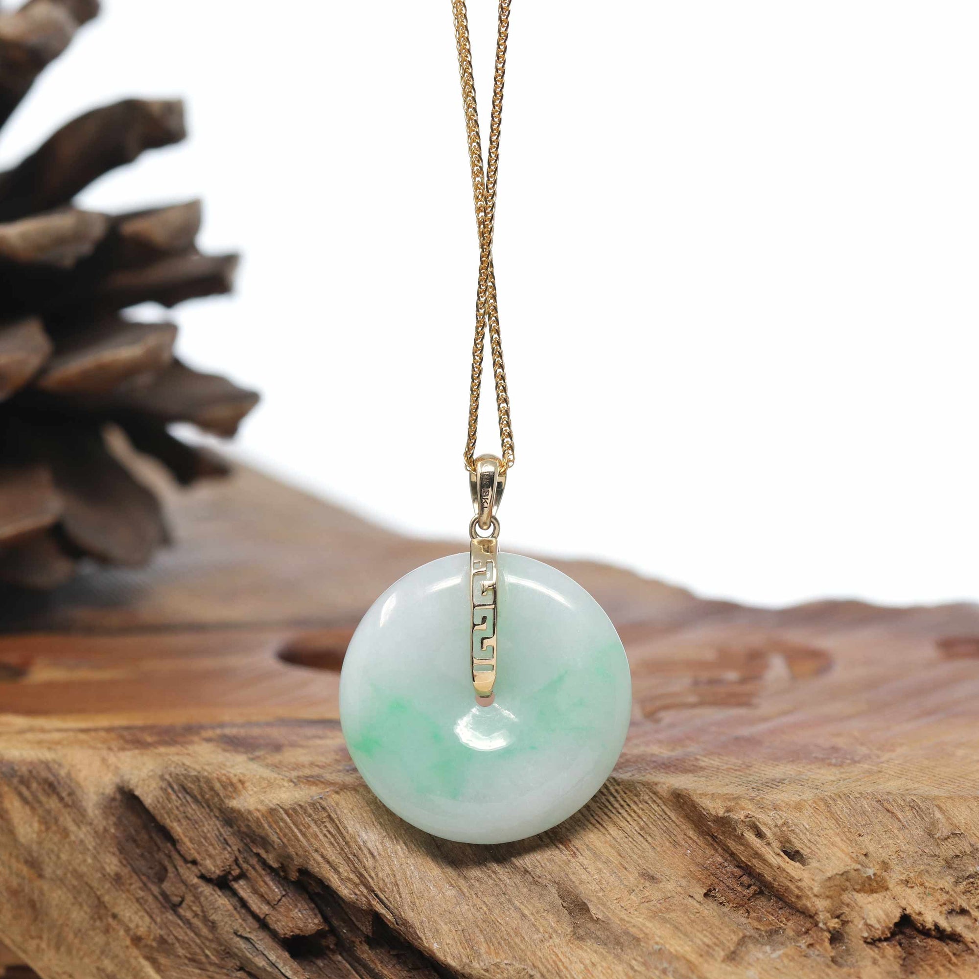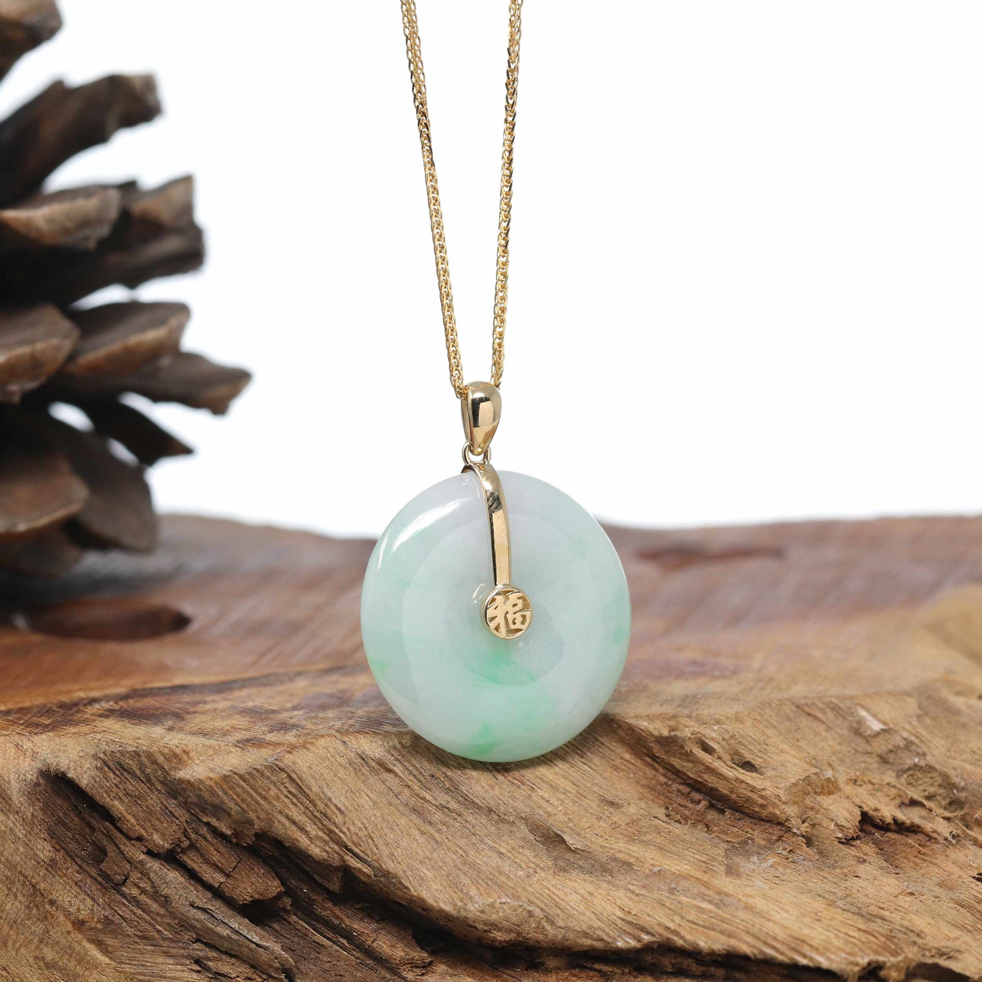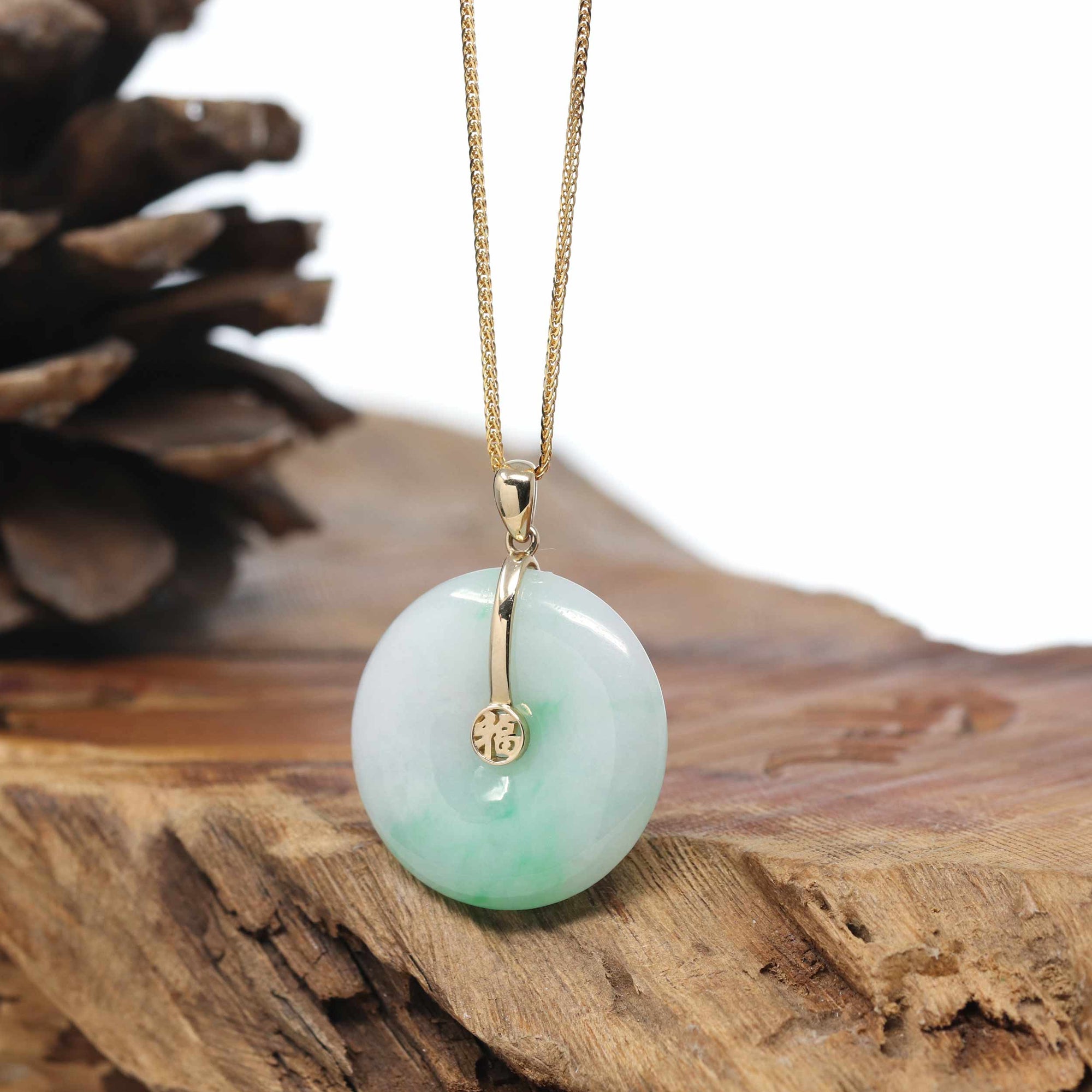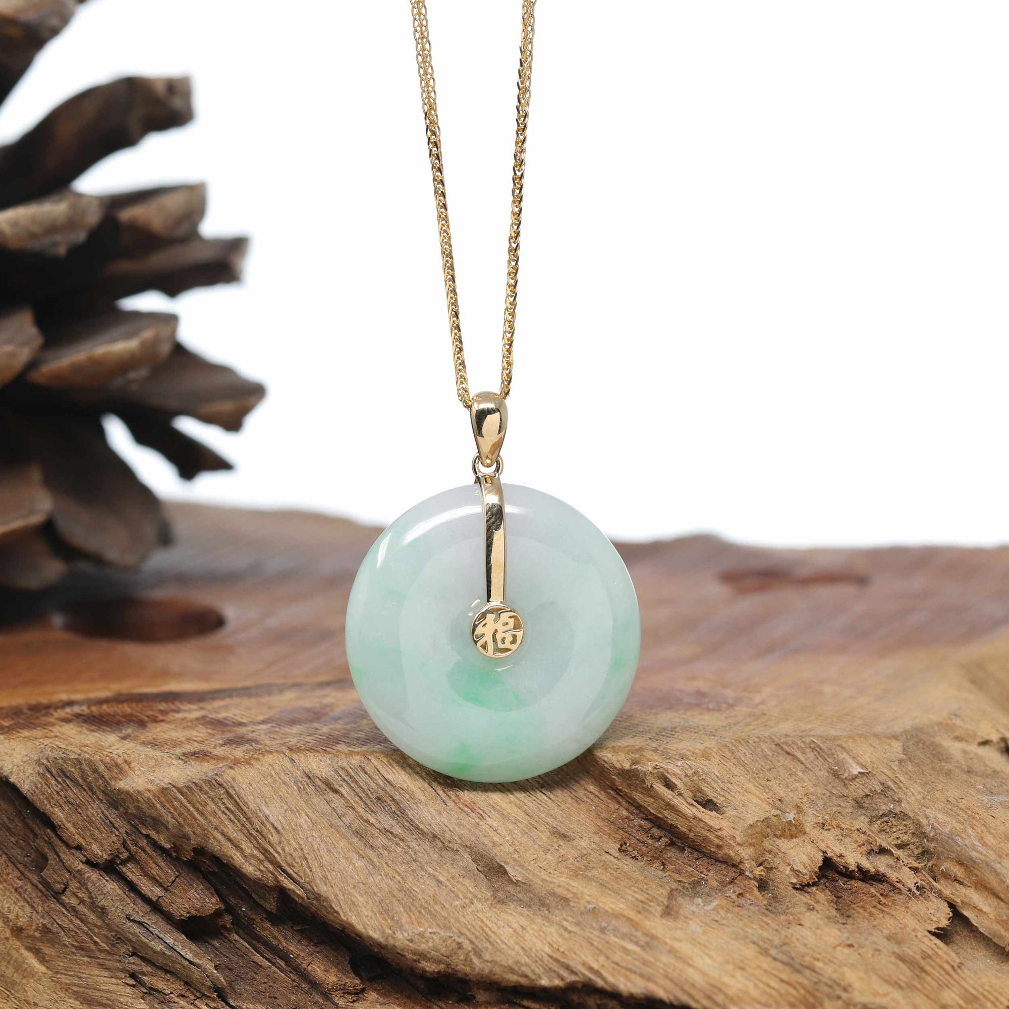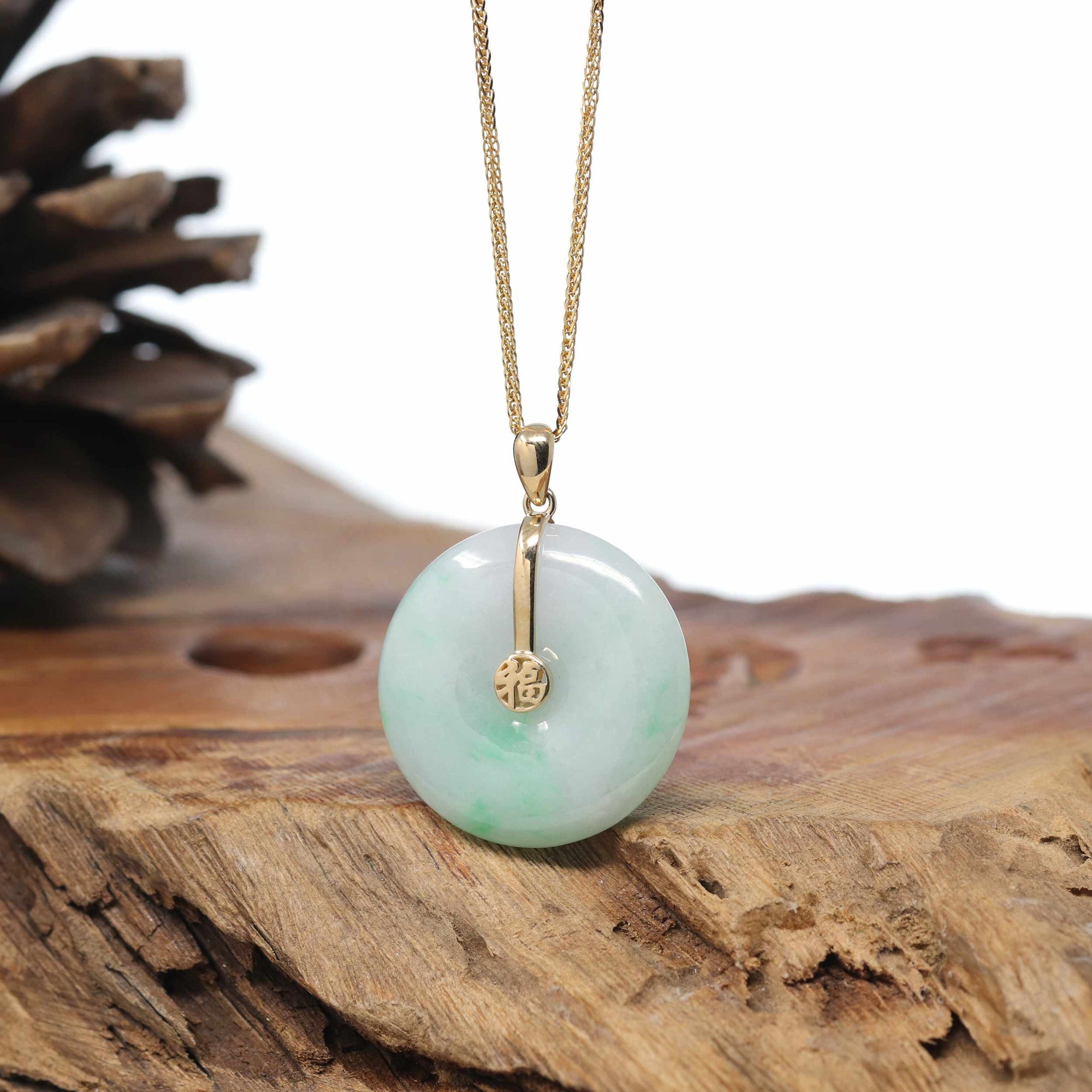14K Gold "Good Luck Button" Necklace Ice Green Jadeite Jade Lucky KouKou Pendant Necklace