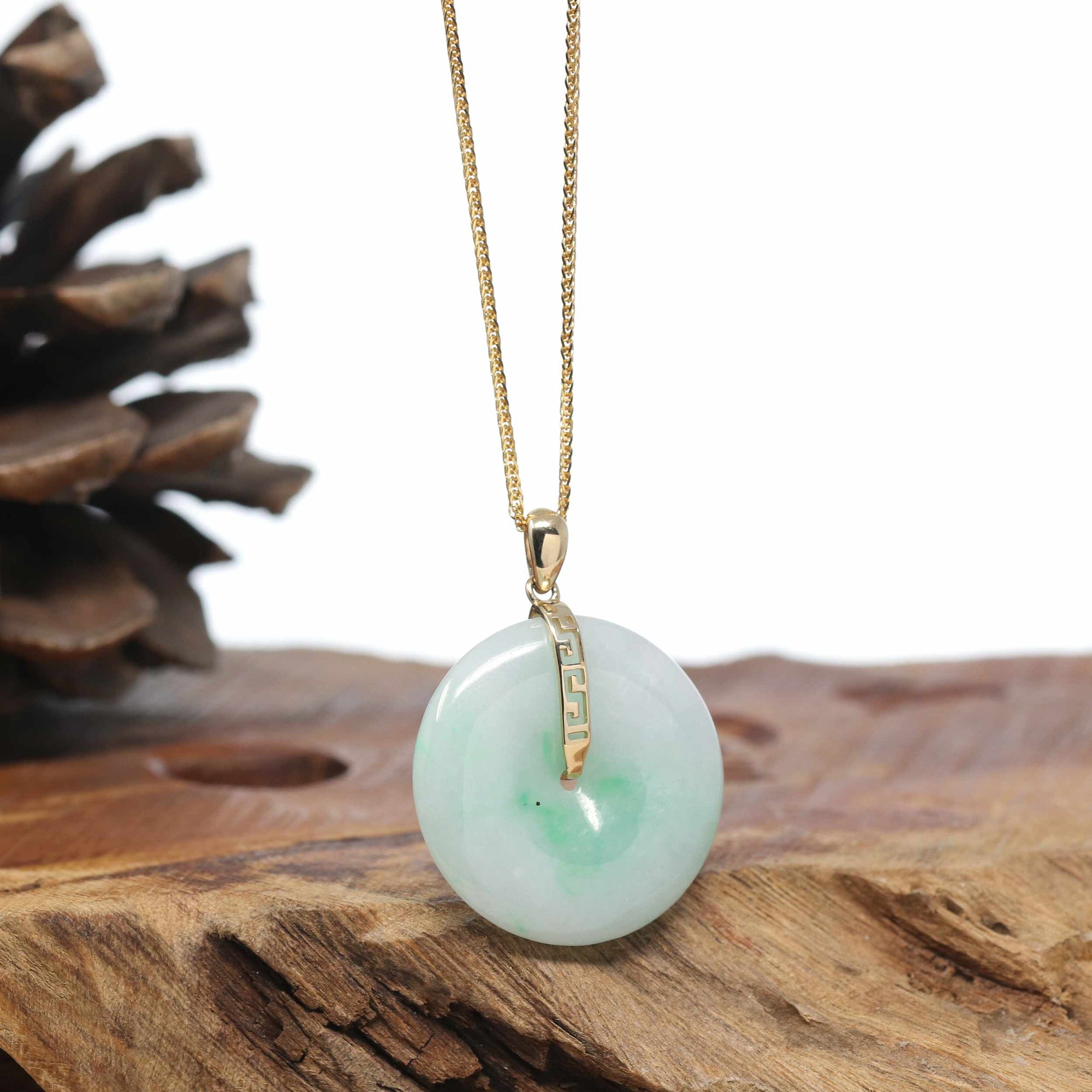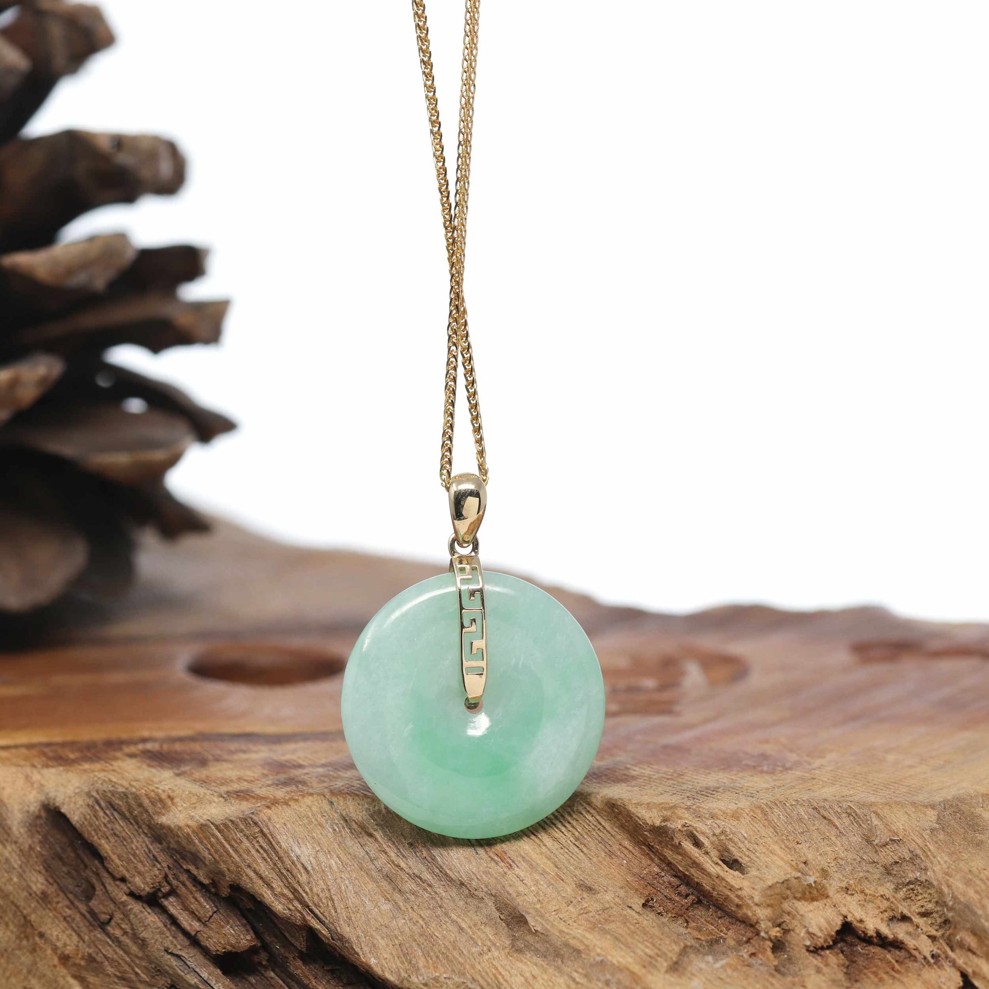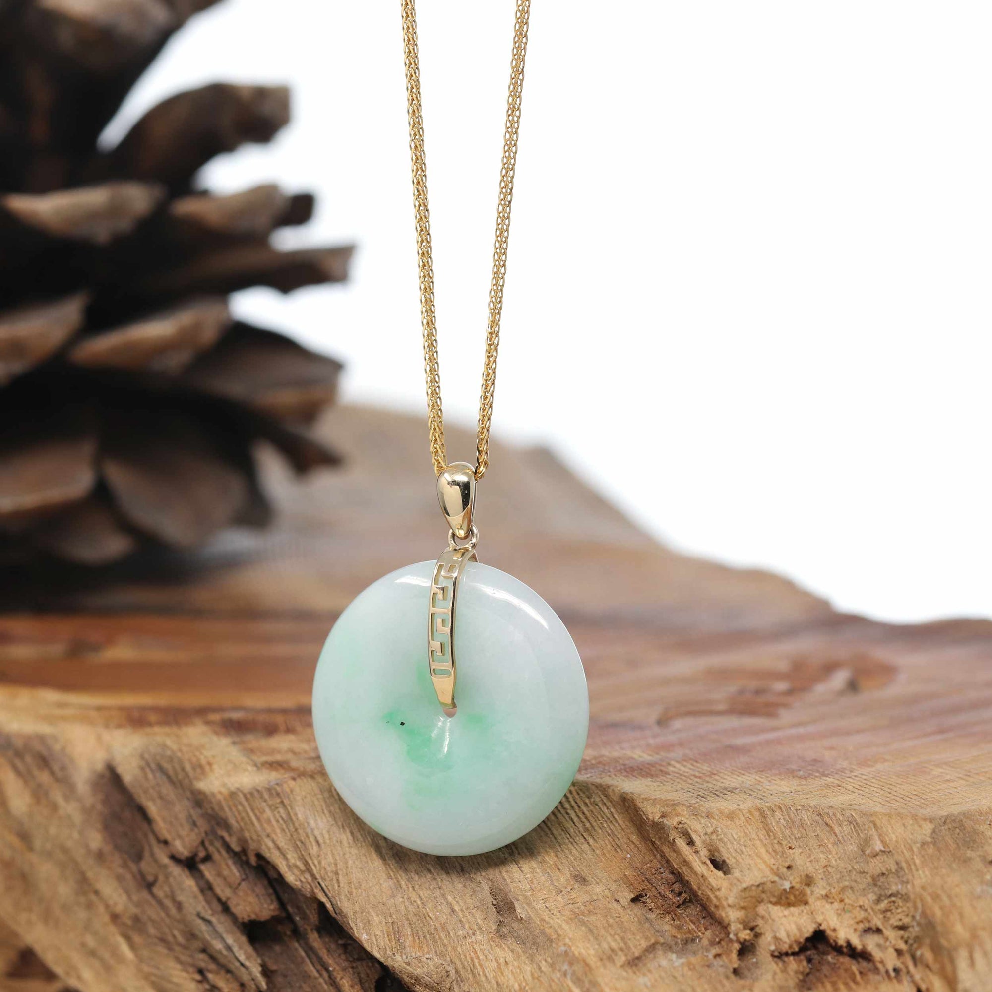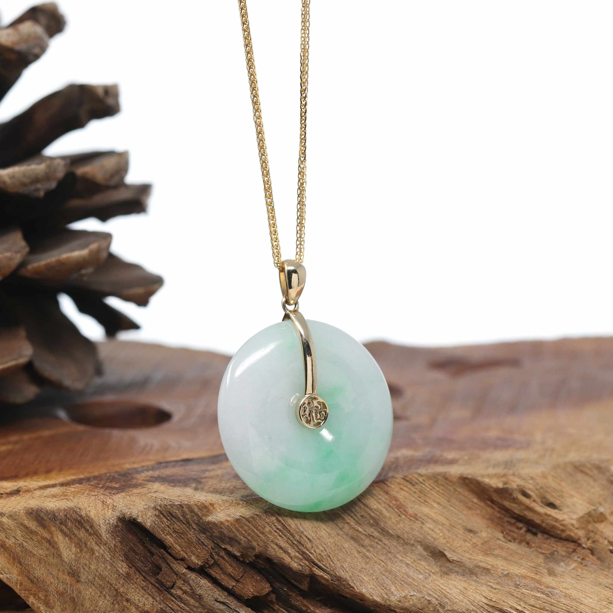 14K Yellow Gold "Good Luck Button" Necklace Ice Green Jadeite Jade Lucky KouKou Pendant Necklace