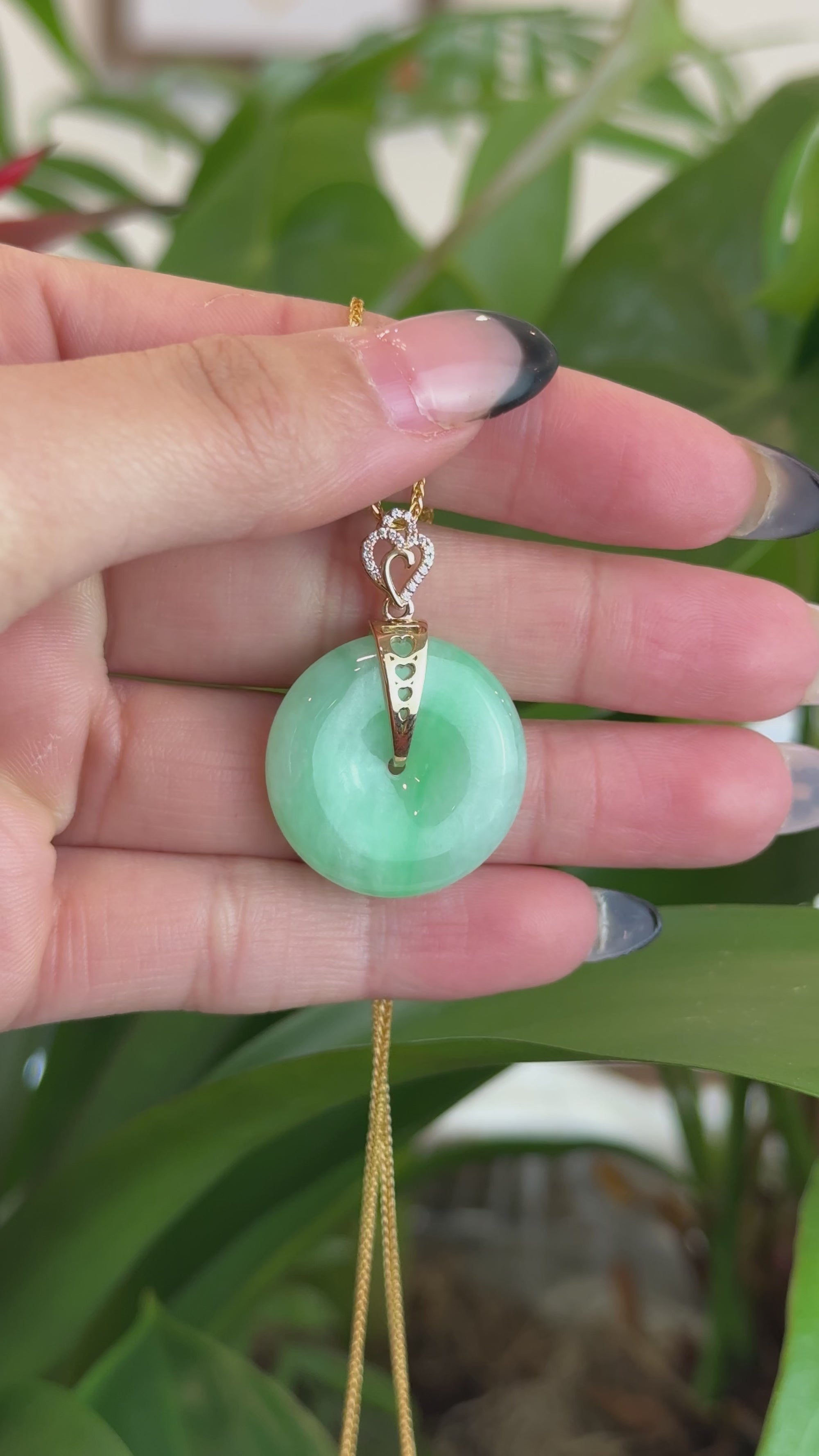 "Good Luck Button" Green Jadeite Jade Lucky KouKou Pendant With 14K Yellow Gold Diamond Bail