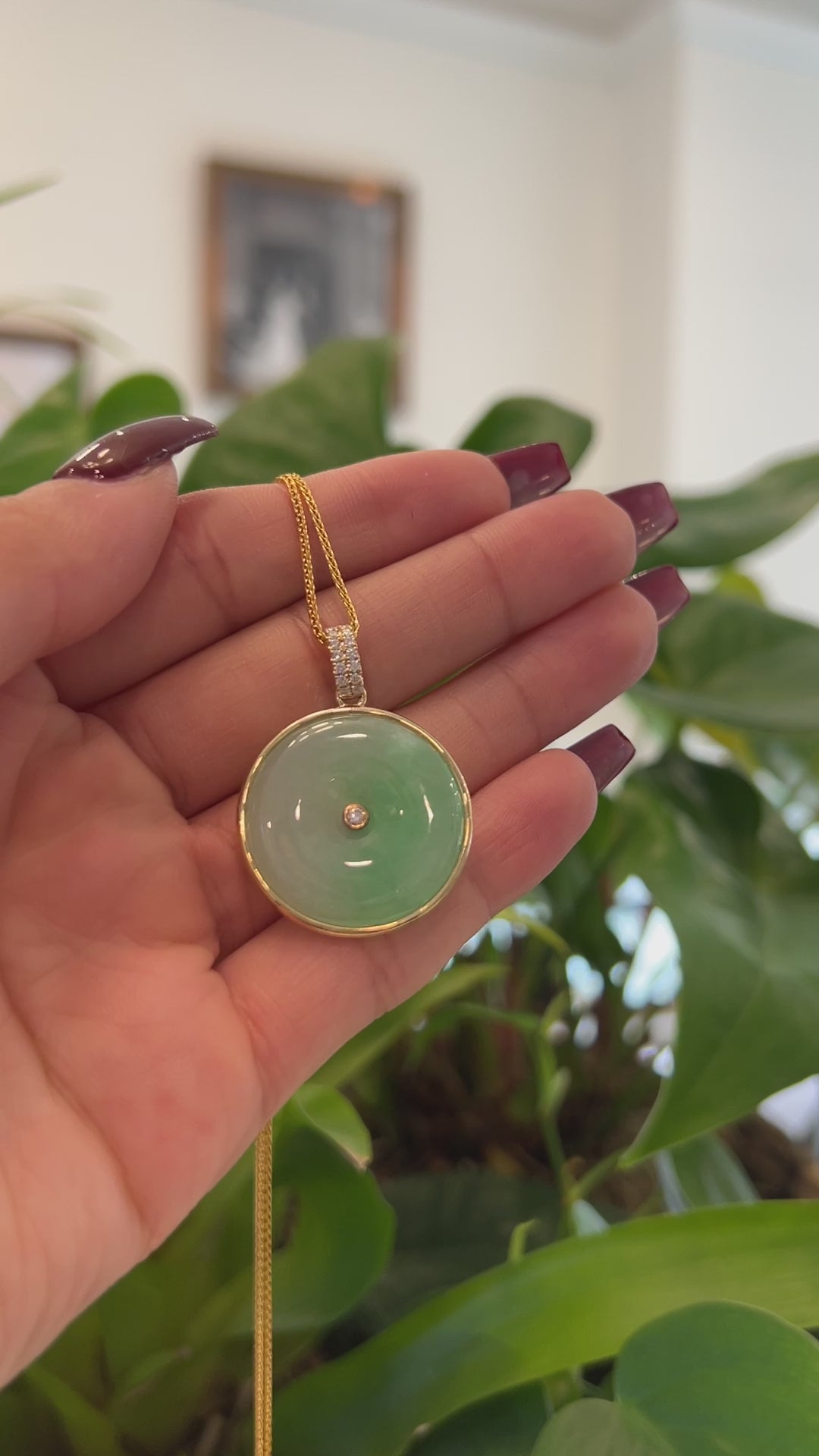 14K Yellow Gold "Good Luck Button" Necklace Ice Green Jadeite Jade Pendant Necklace
