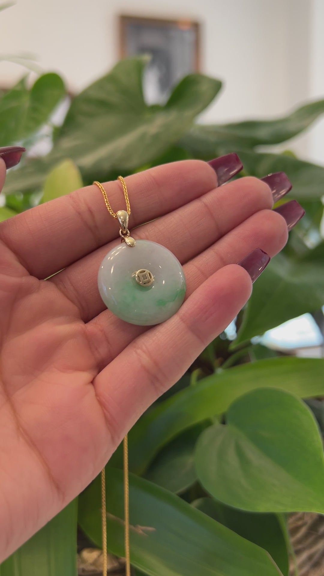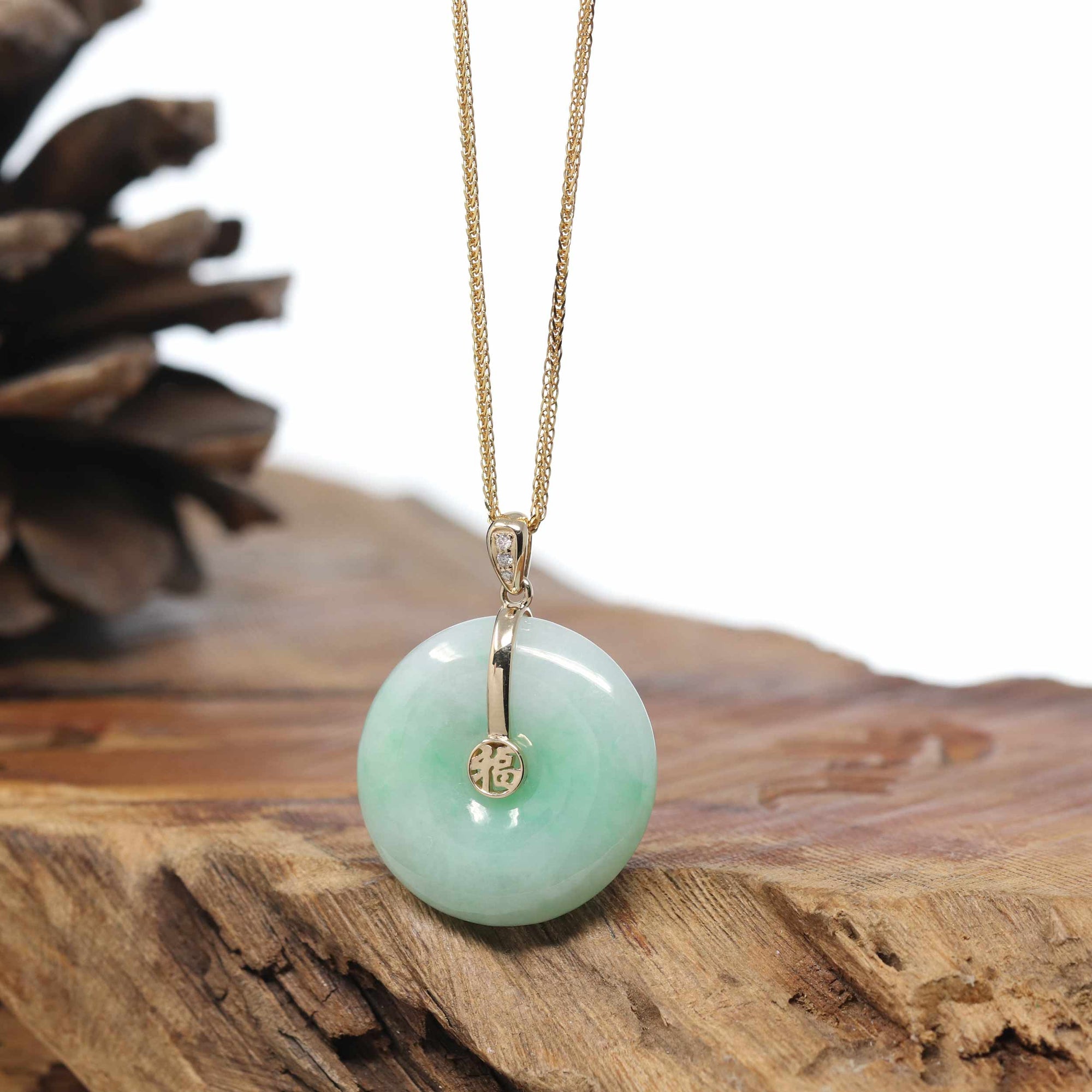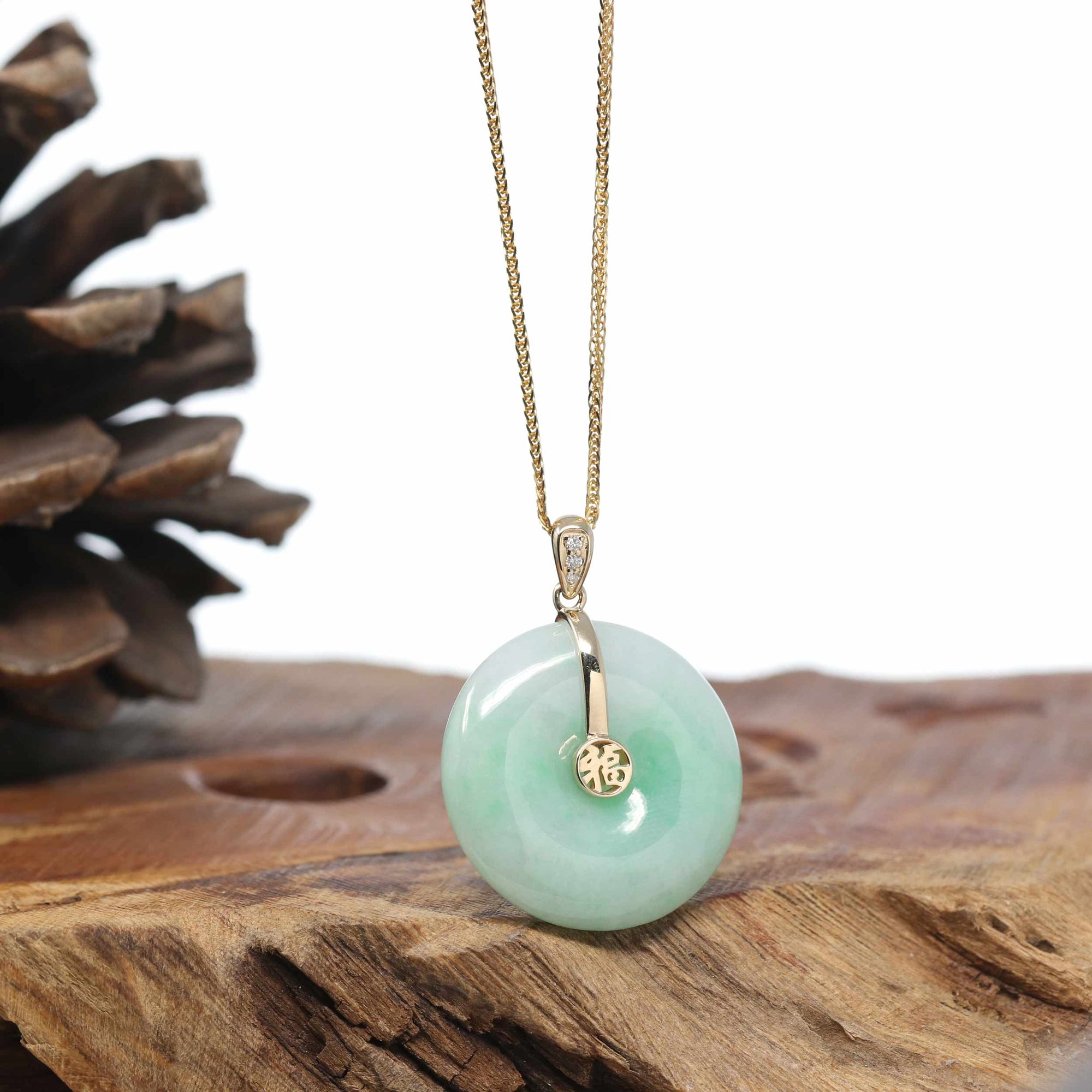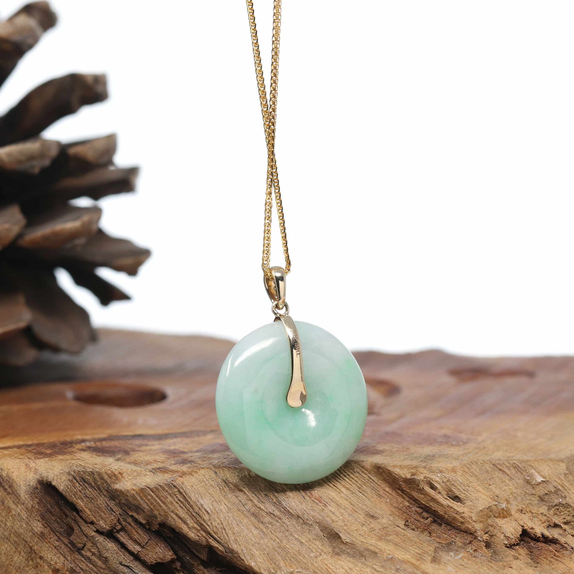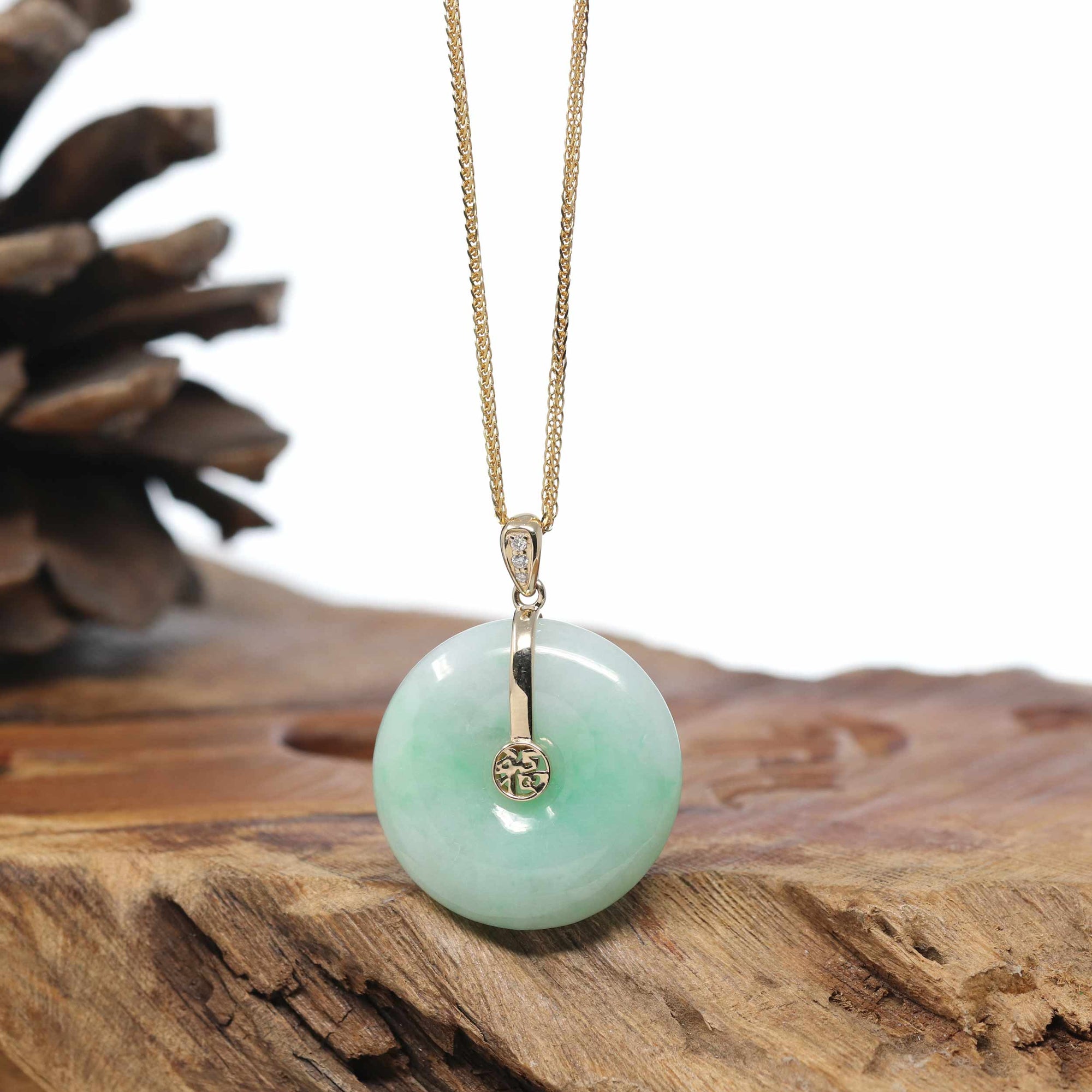 18K Yellow Gold "Good Luck Button" Necklace Green Jadeite Jade Pendant Necklace