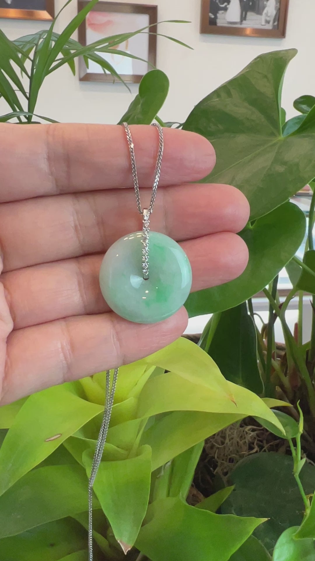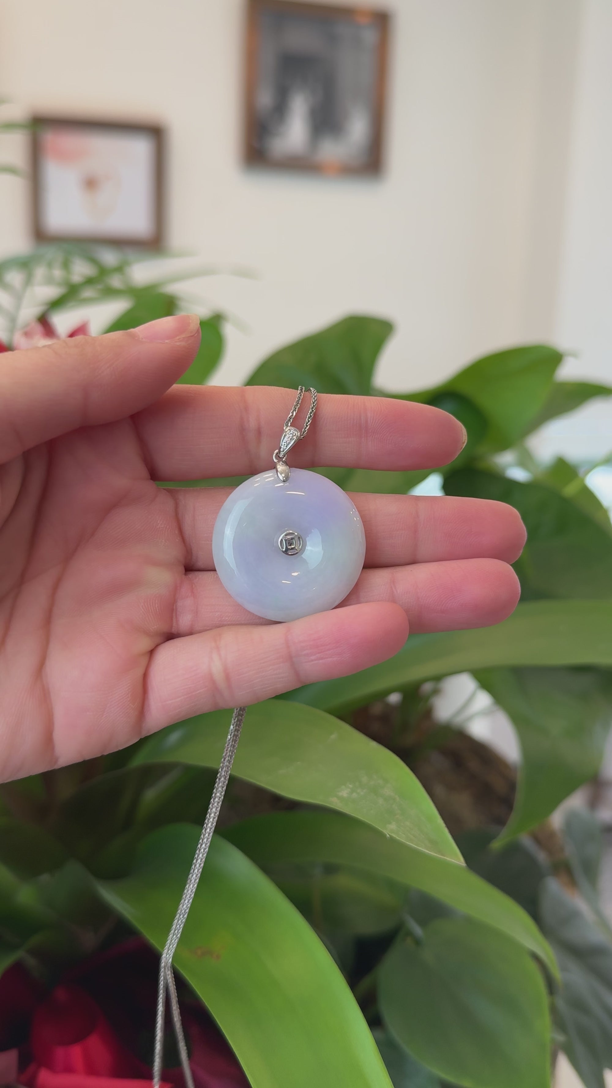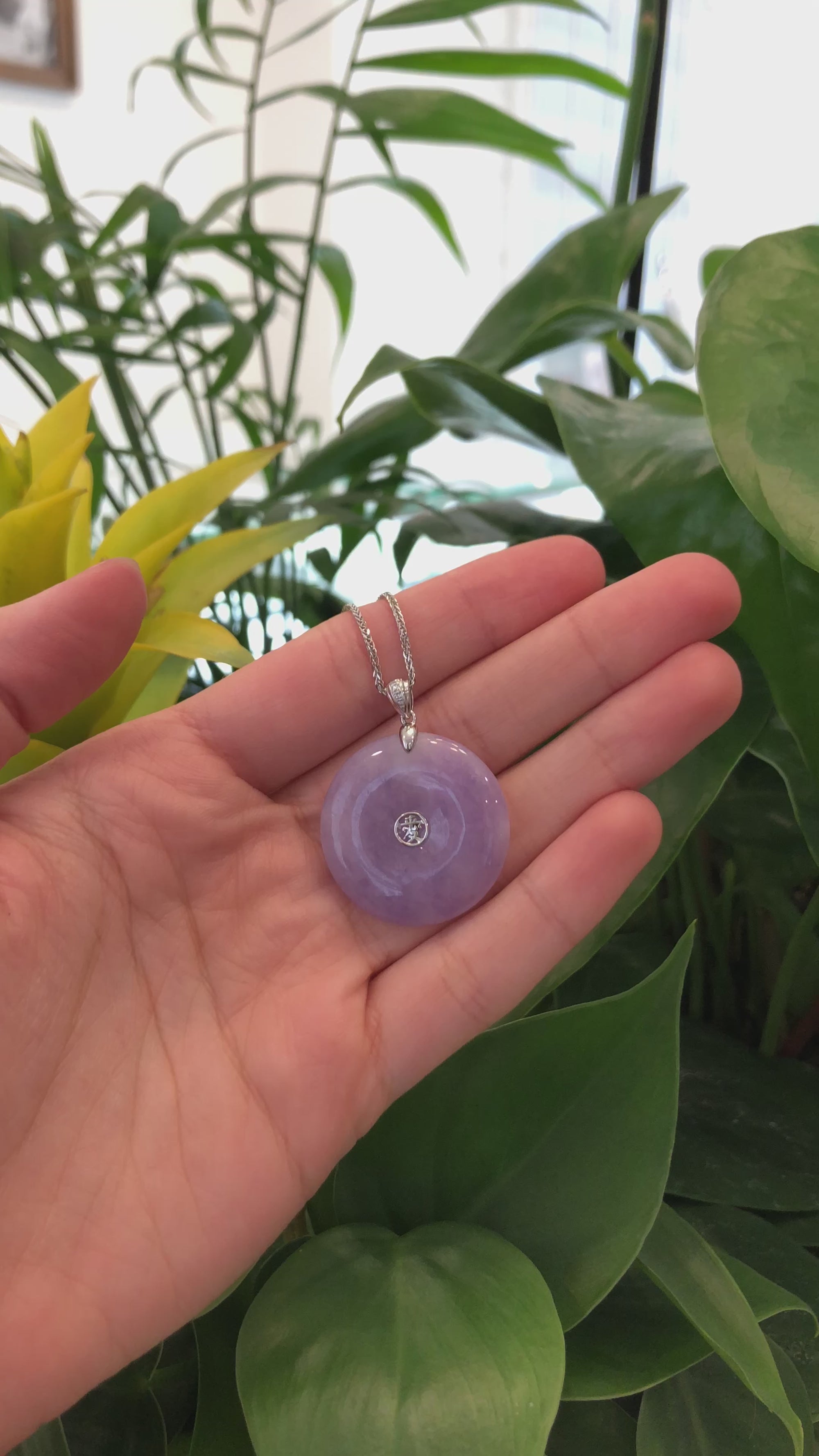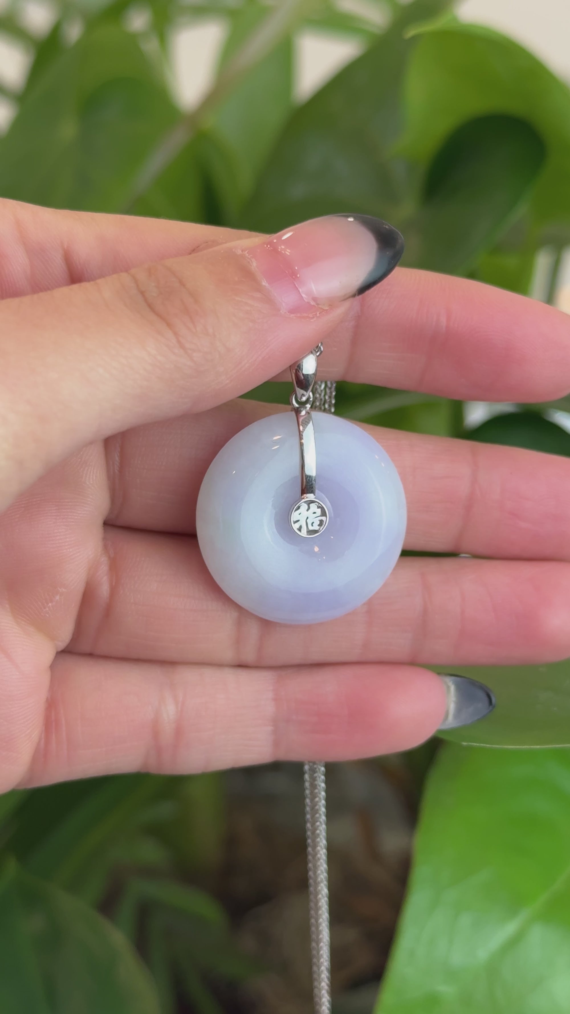 14k White Gold "Ping An Kou" "Love" Light Lavender Green Jadeite Jade Lucky KouKou Pendant Necklace
