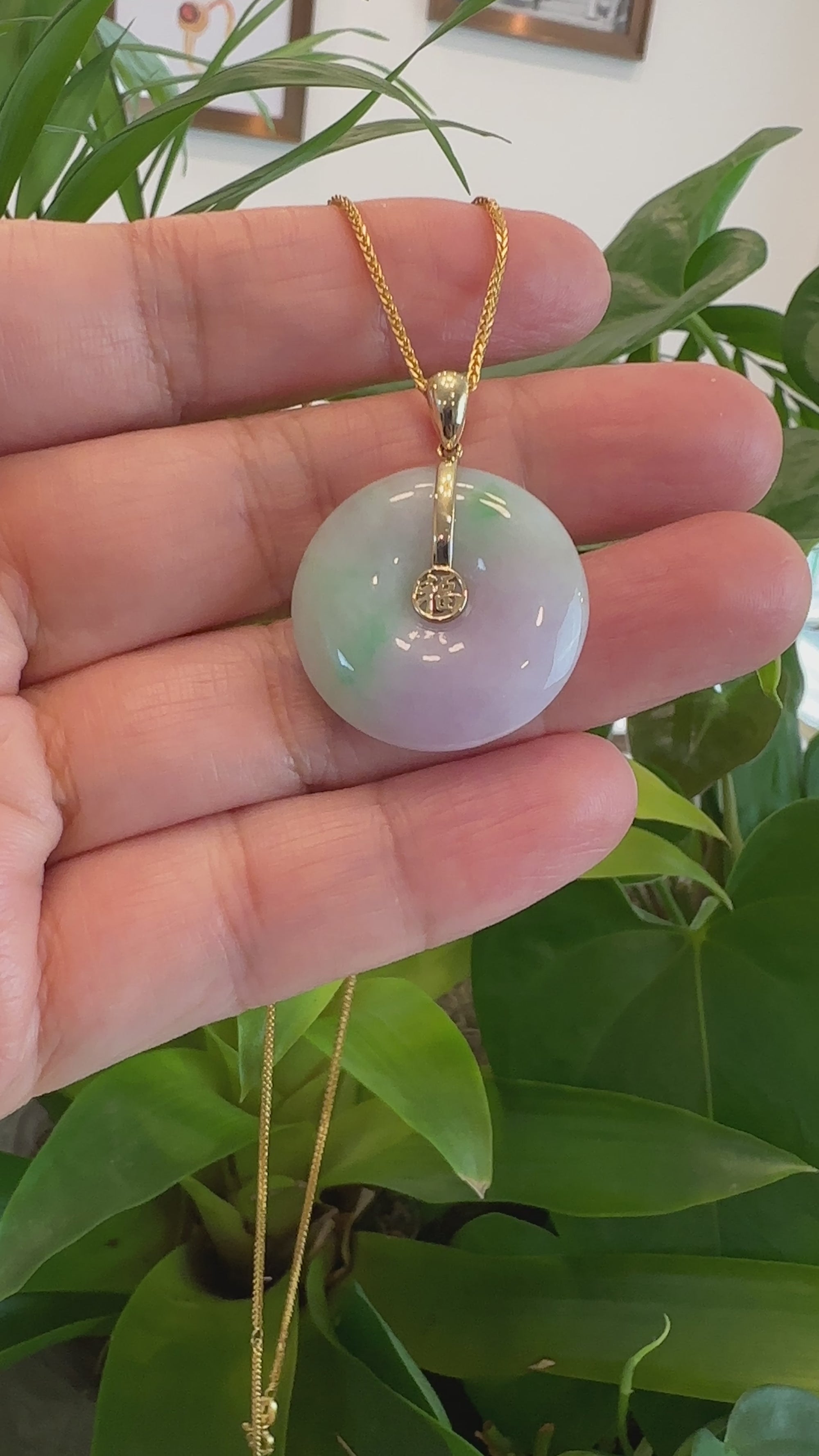 14K Yellow Gold "Good Luck Button" Necklace Lavender Green Jadeite Jade Pendant Necklace