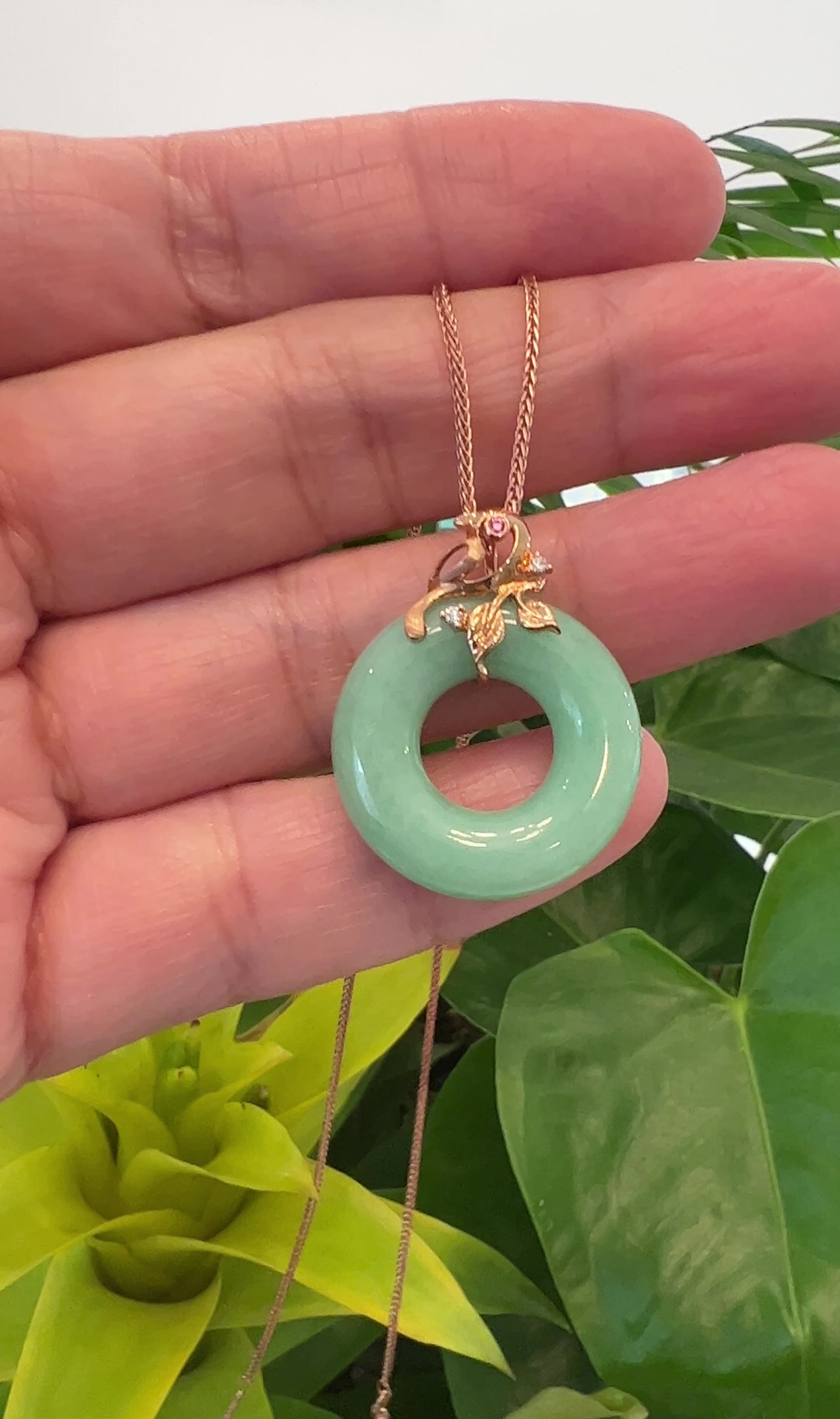 Baikalla Apple Green "Ping An Kou" (Good Luck Button) Genuine Burmese Jadeite Pendant W/ 18k Rose Gold Bail W/ Diamonds and Ruby