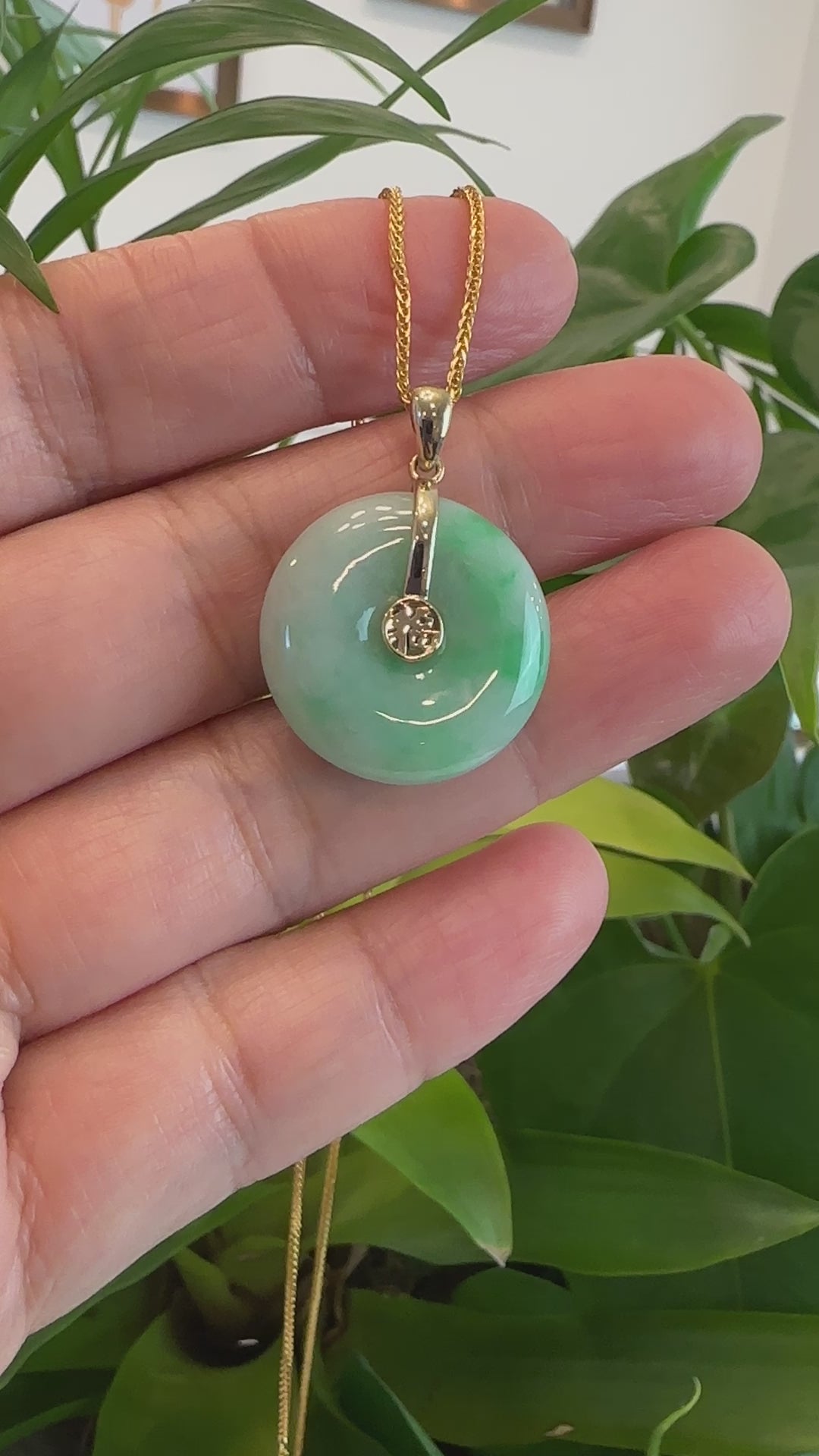 "Good Luck Button" Green Jadeite Jade Lucky KouKou Pendant With 14K Yellow Gold Bail