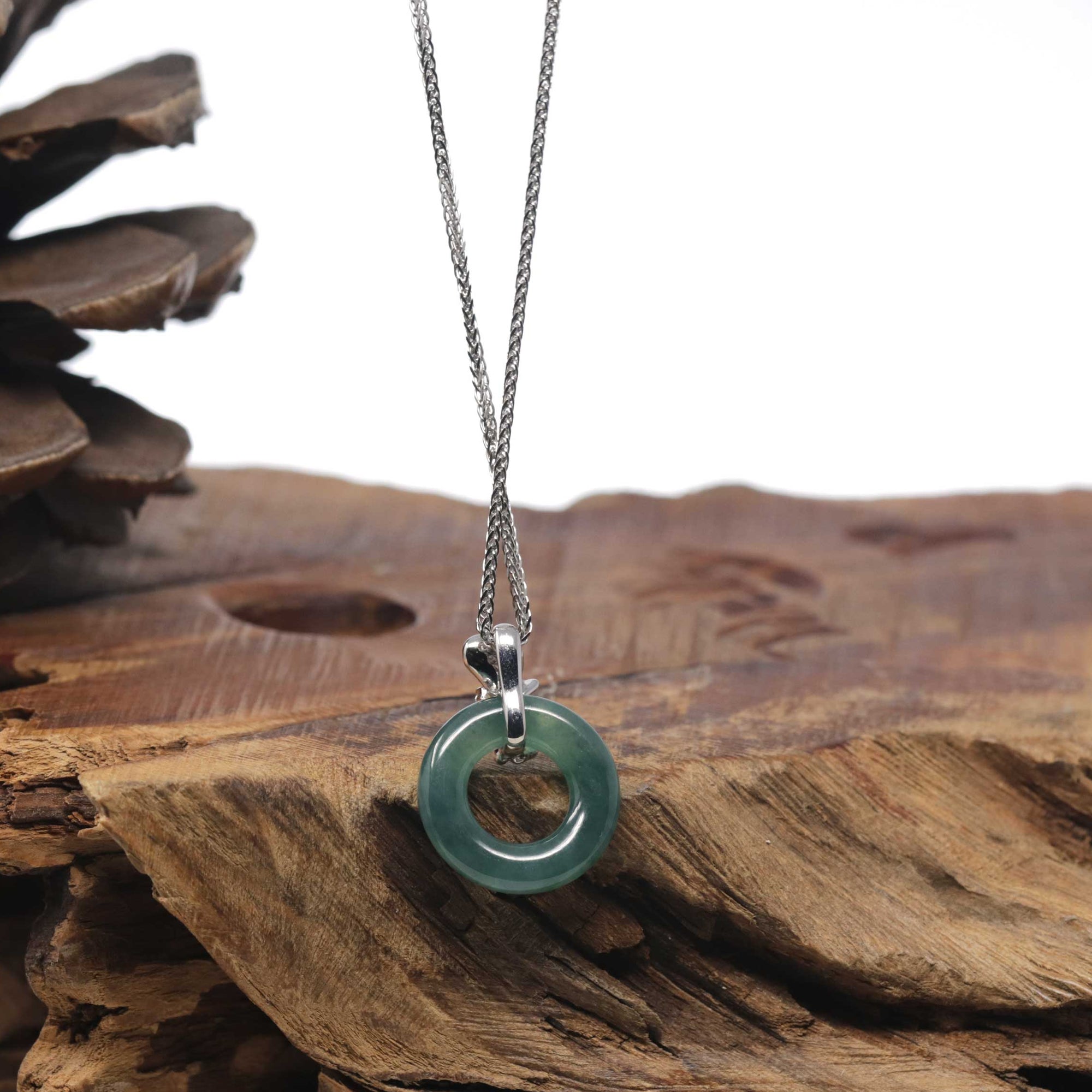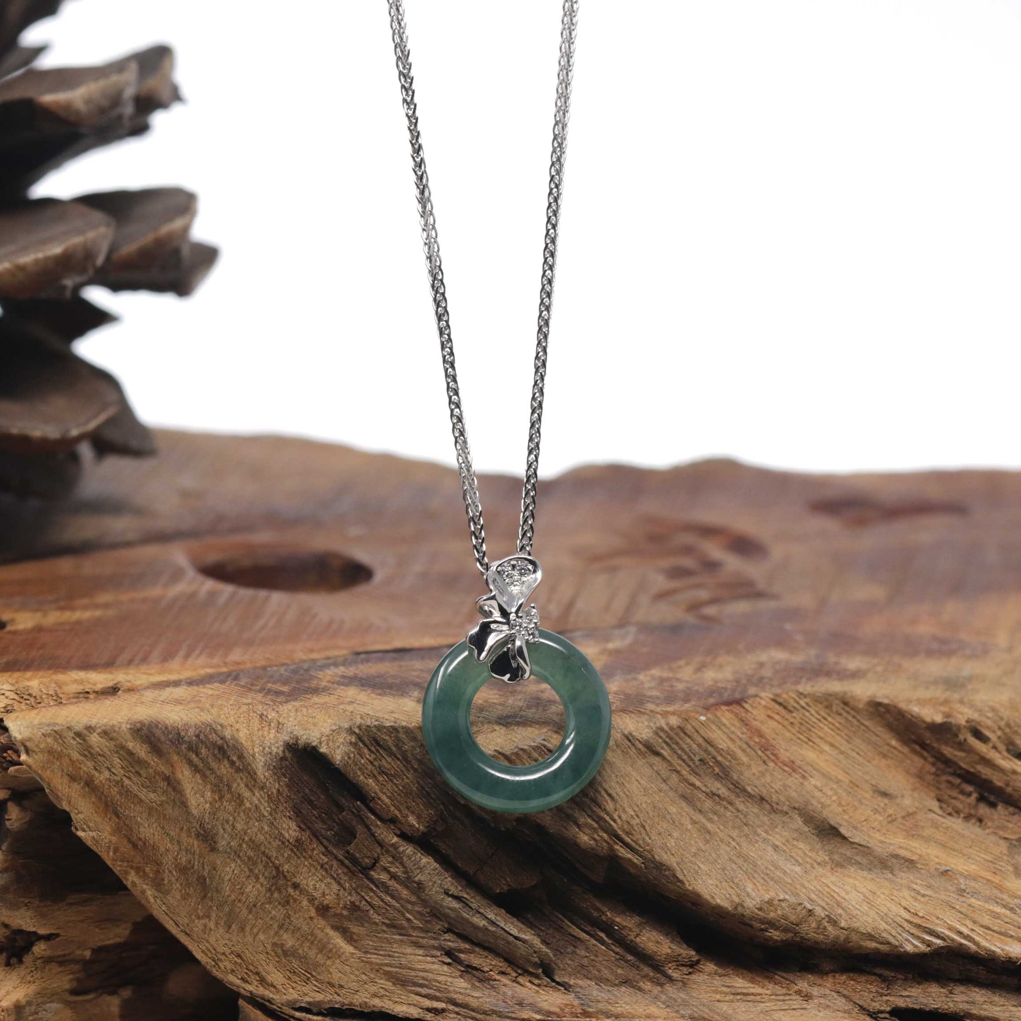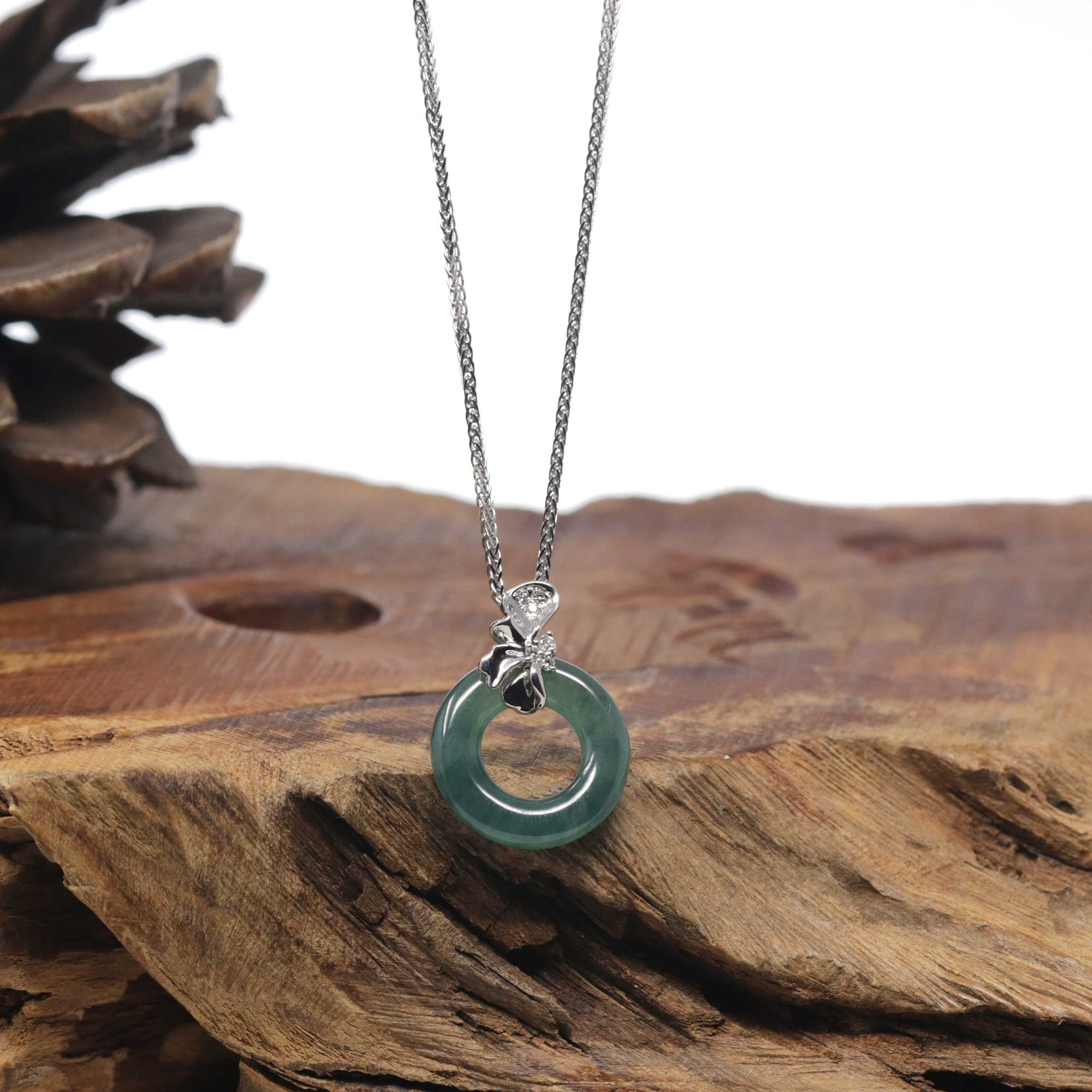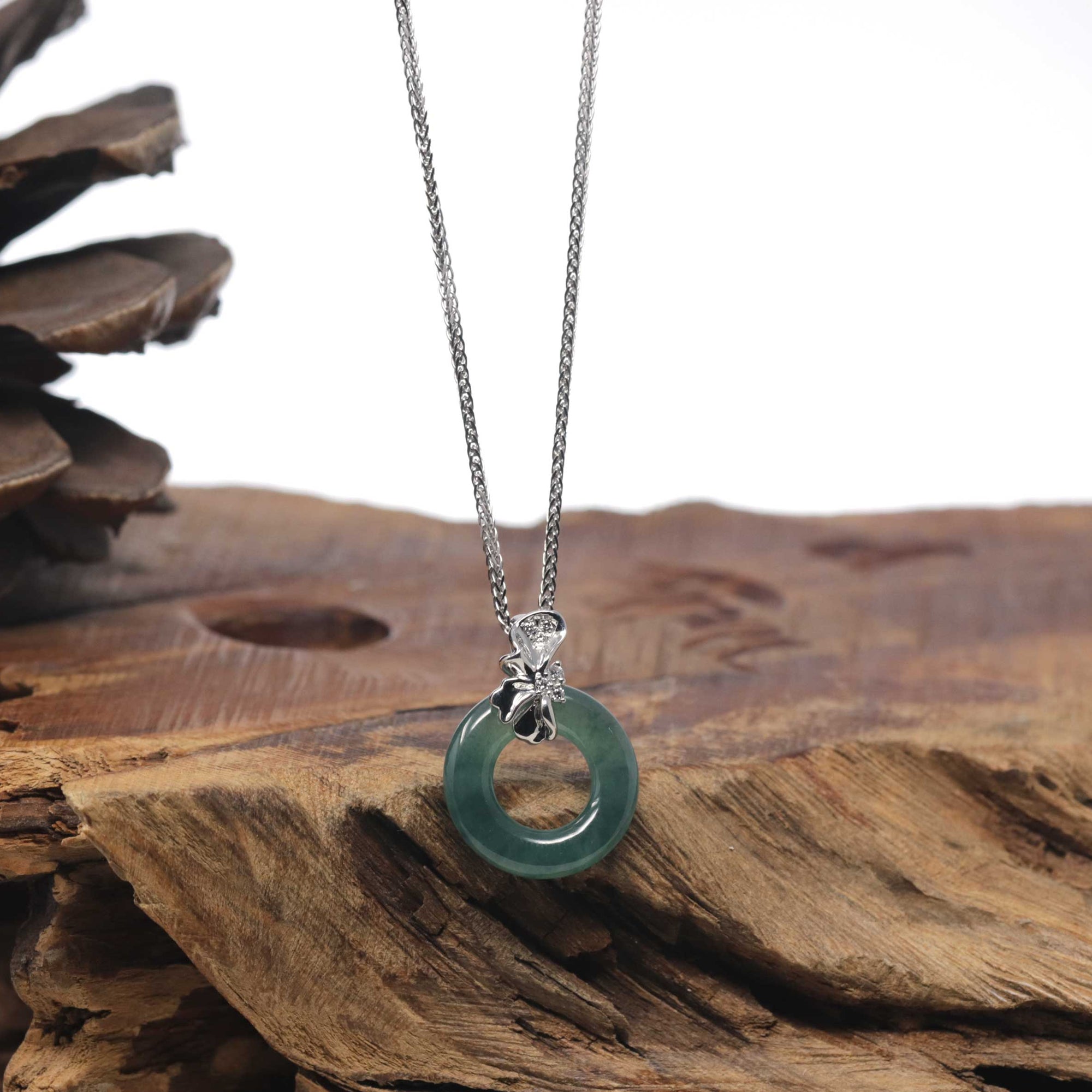 18K White Gold "Good Luck Button" Necklace Icy Green Jadeite Jade Pendant Necklace