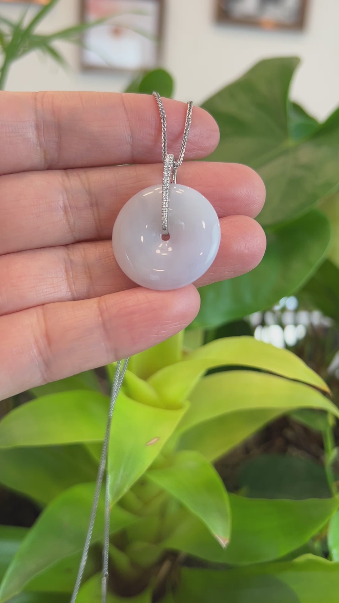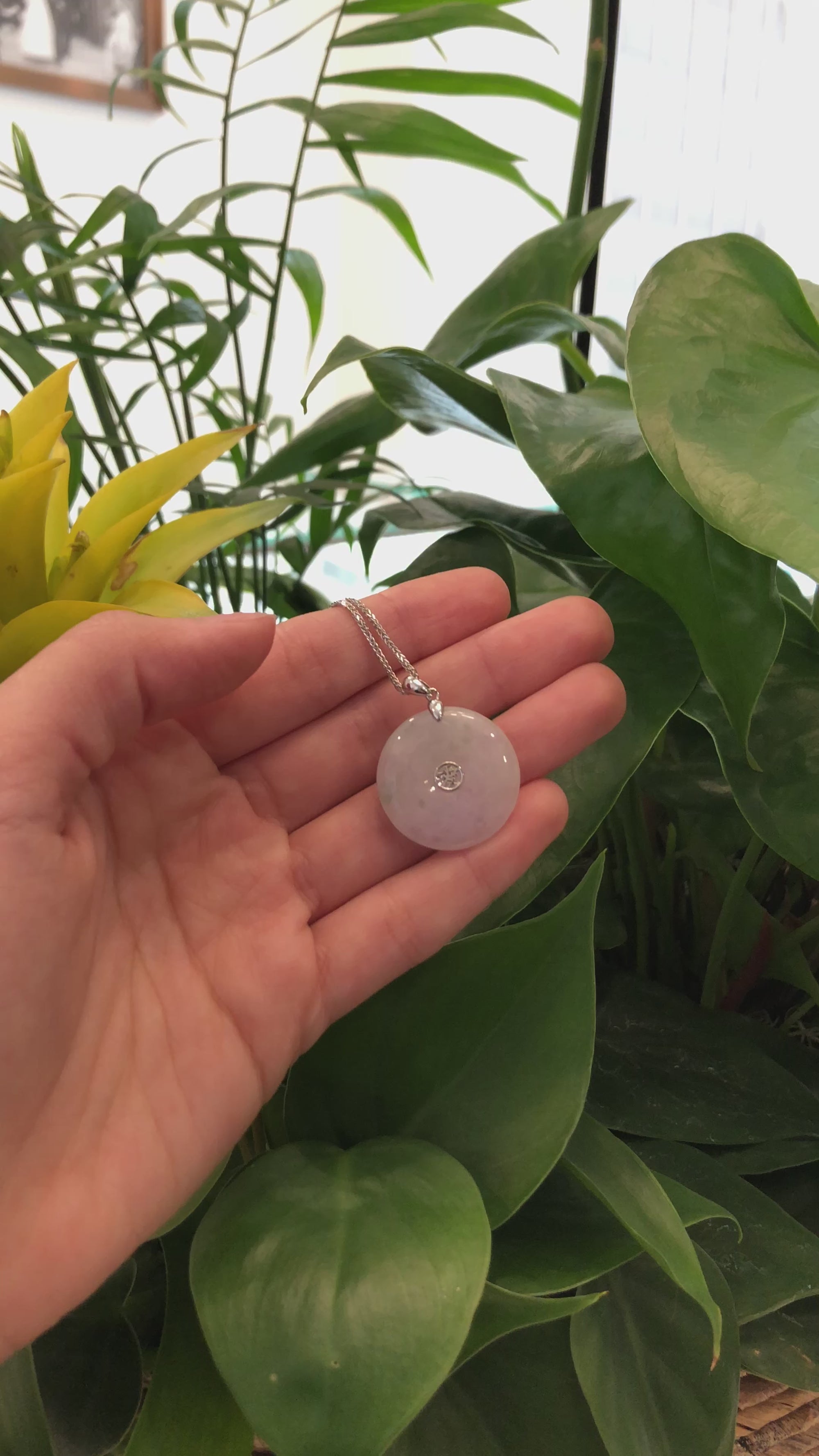 14k White Gold "Ping An Kou" "Love" Light Lavender Green Jadeite Jade Lucky KouKou Pendant Necklace