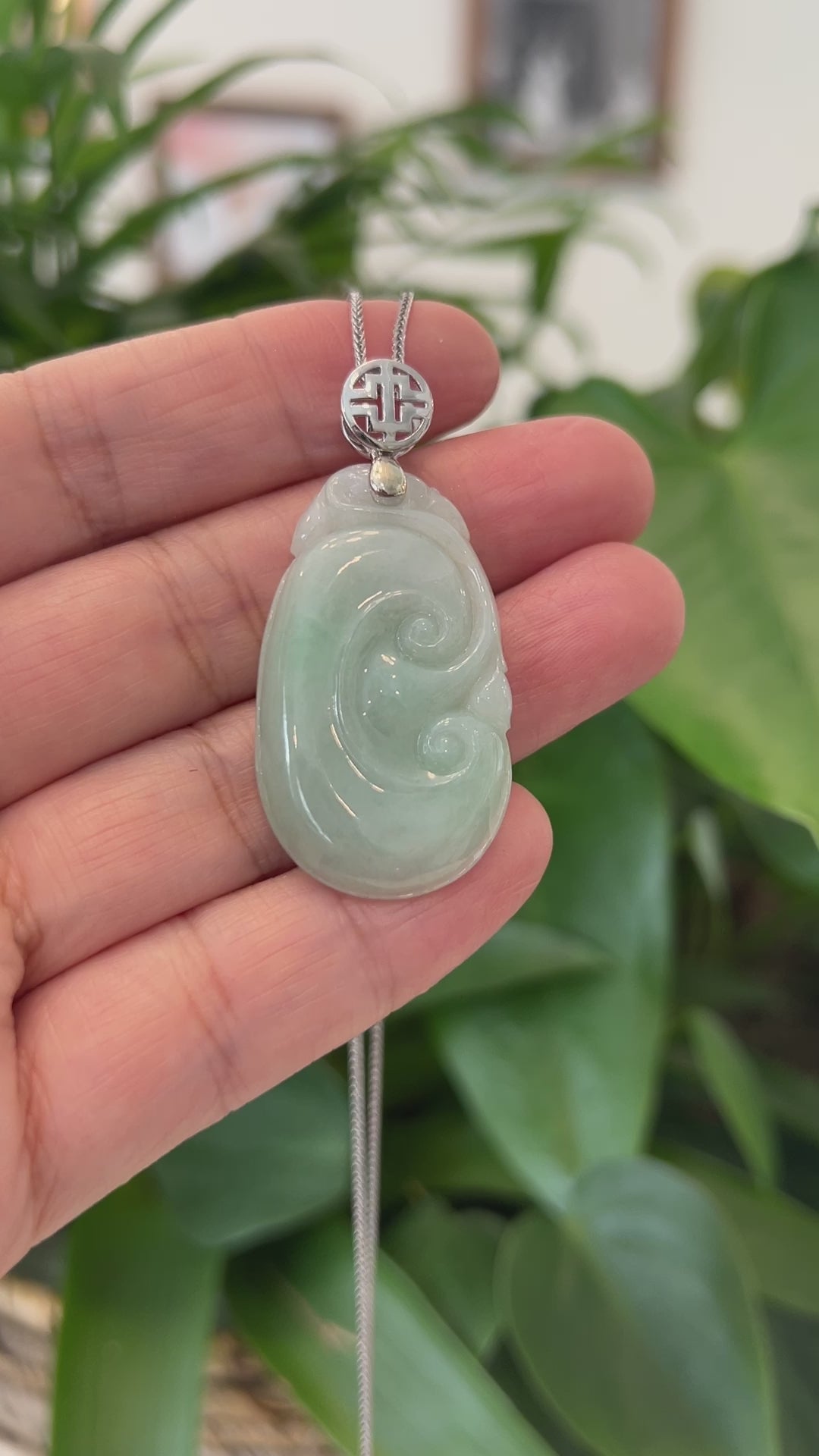 Natural Light Green Jadeite Jade Ru Yi Pendant Necklace With Sterling Silver Bail