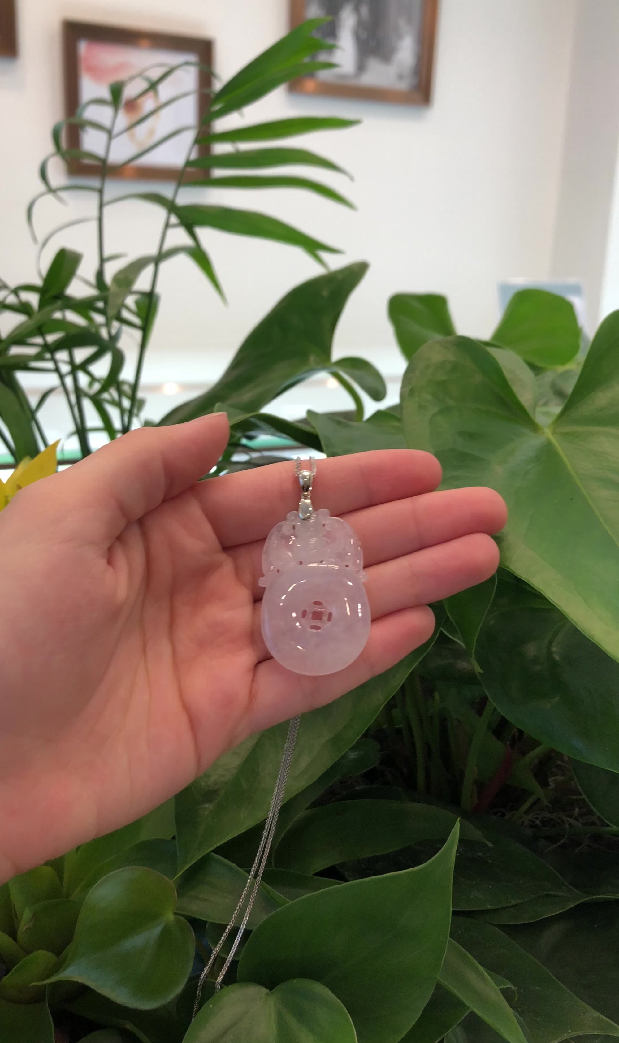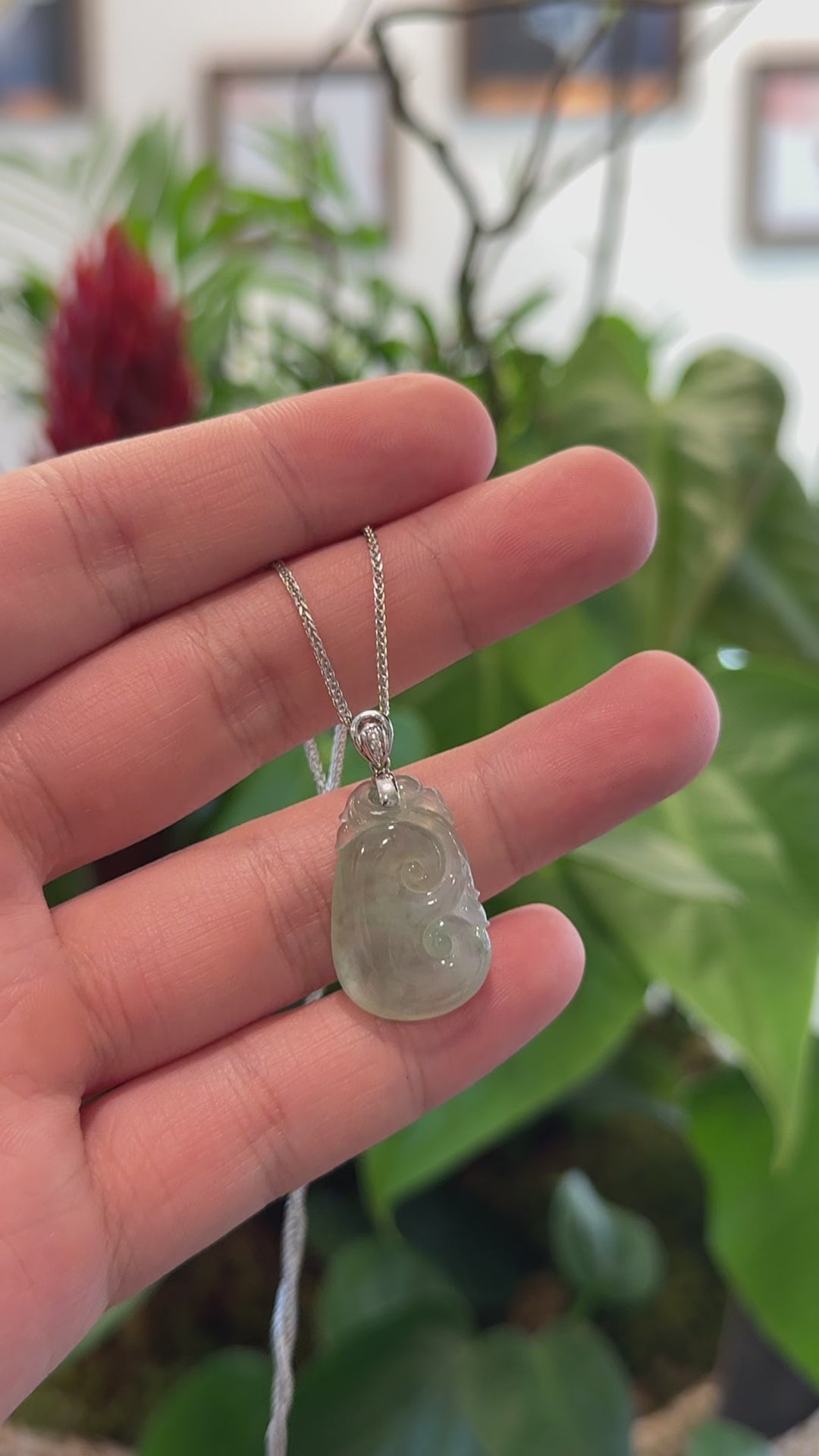 Genuine Ice White Jadeite Jade Fu Zai Yan Qian Pendant Necklace With 14K White Gold Bail