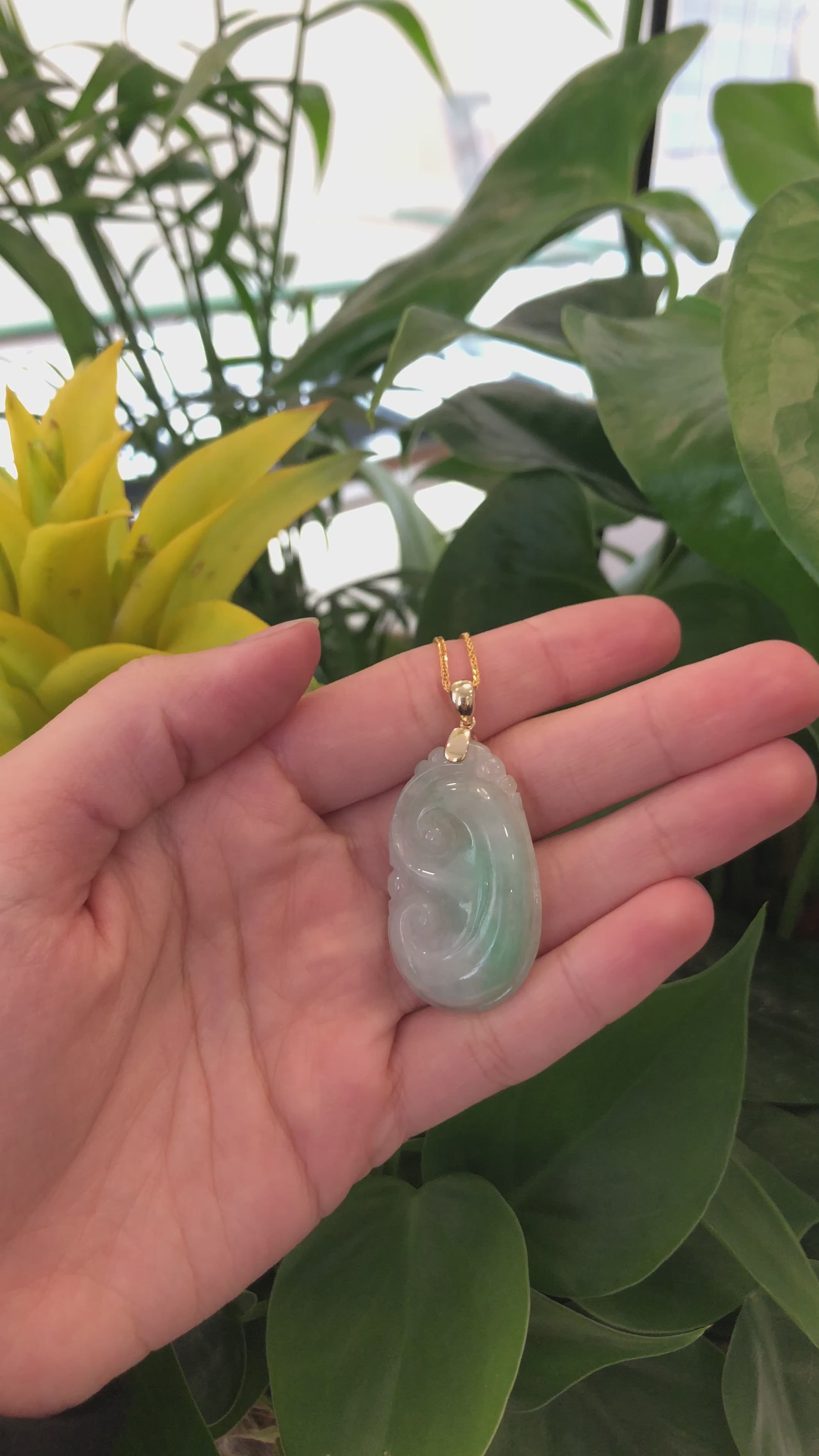 Genuine Green Jadeite Jade RuYi ( Wang Shi Ru Yi ) Pendant Necklace With 14K Yellow Gold Bail