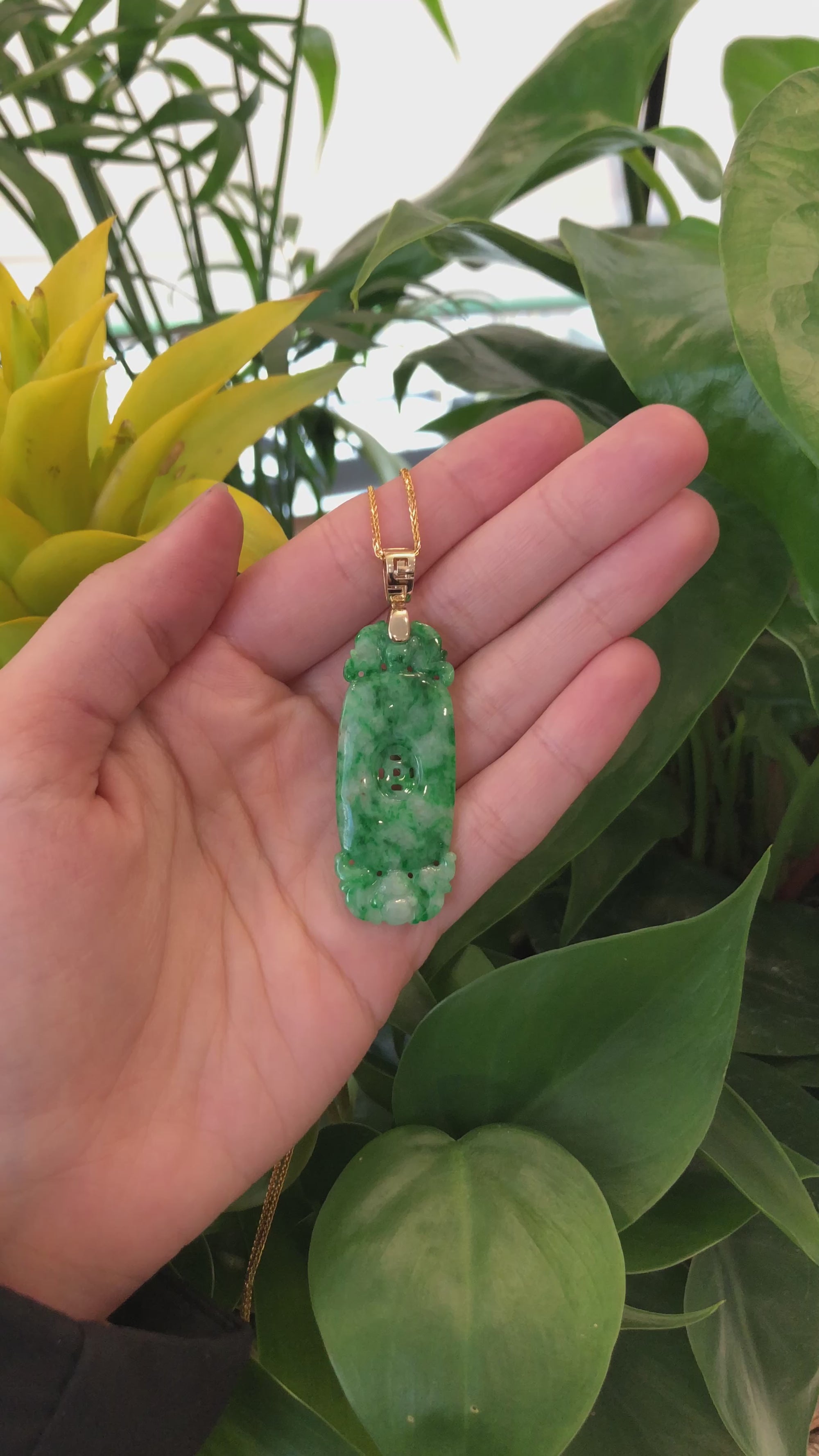 Genuine Apple Green- White Jadeite Jade Fu Zai Yan Qian Pendant Necklace With 14K Yellow Gold Bail