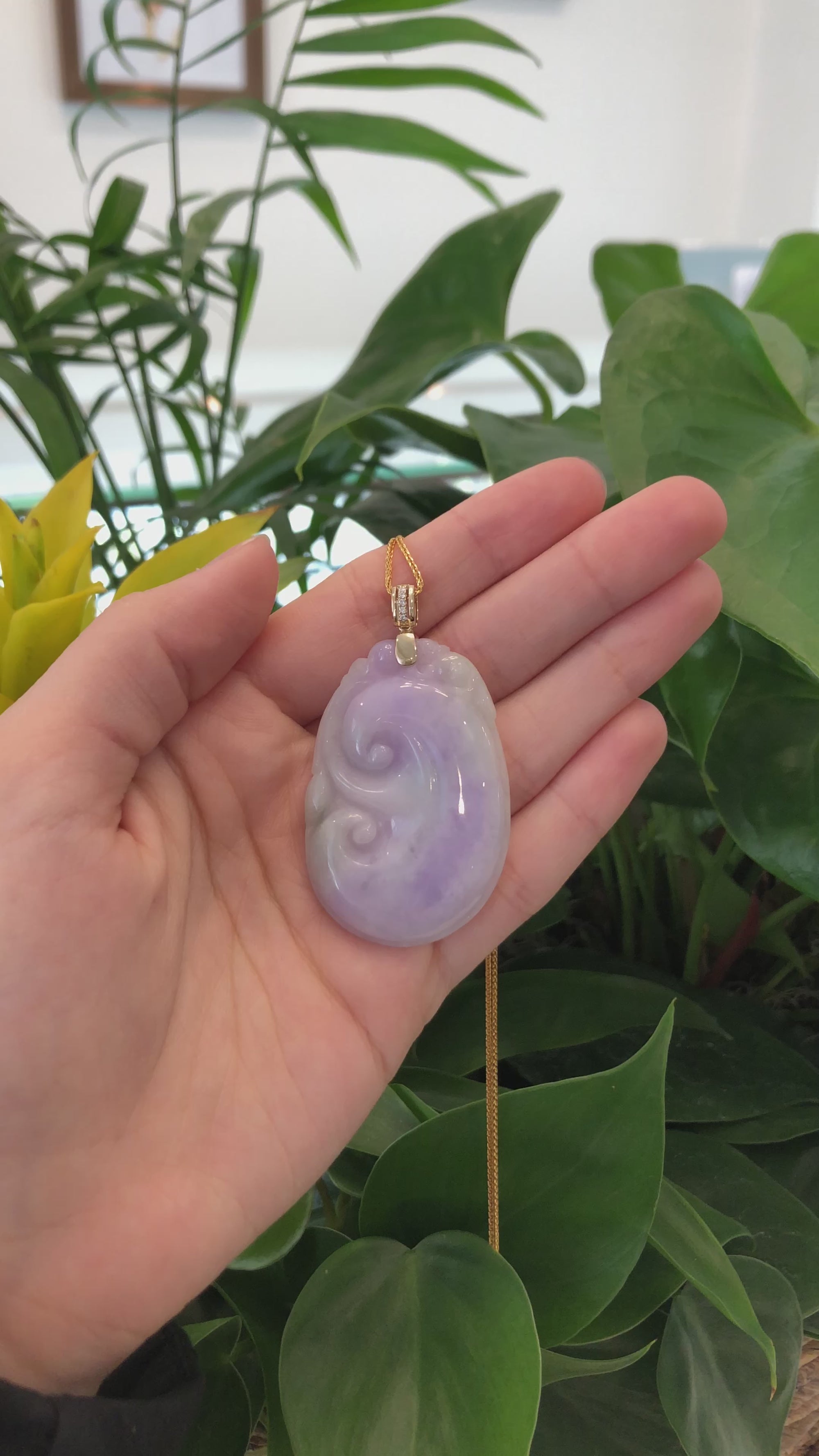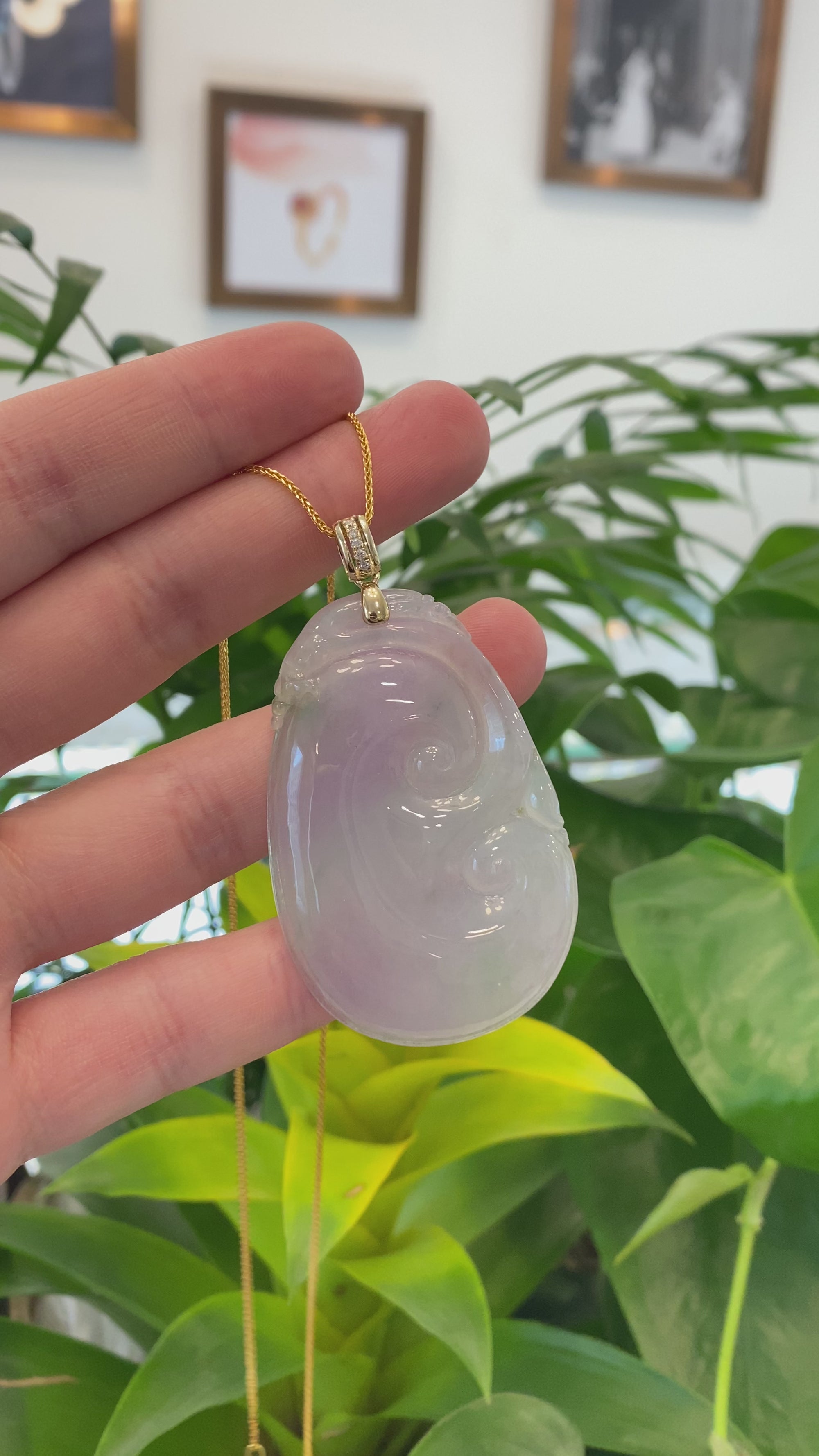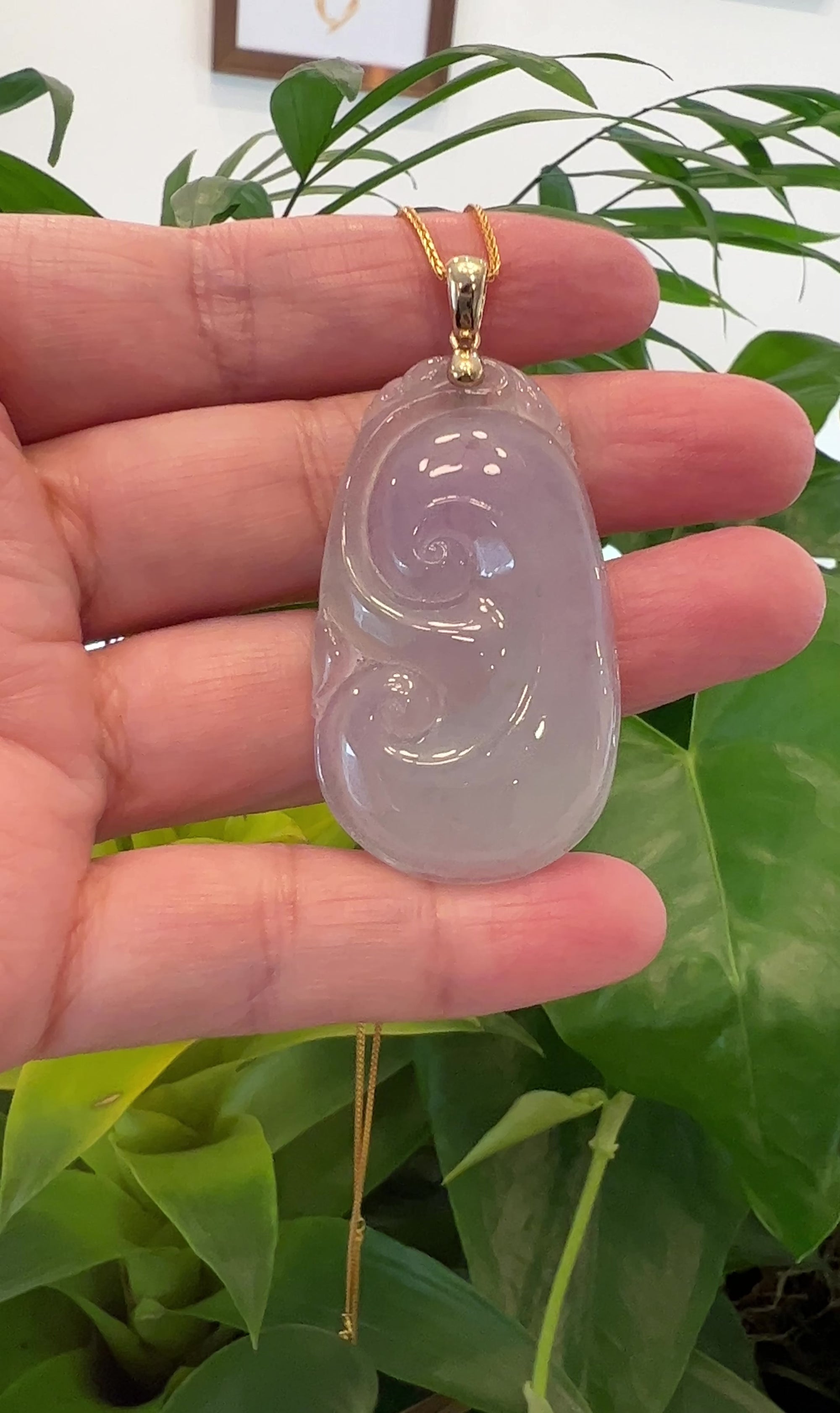 14k Yellow Gold Genuine Burmese Ice Lavender Jadeite Jade RuYi Pendant Necklace