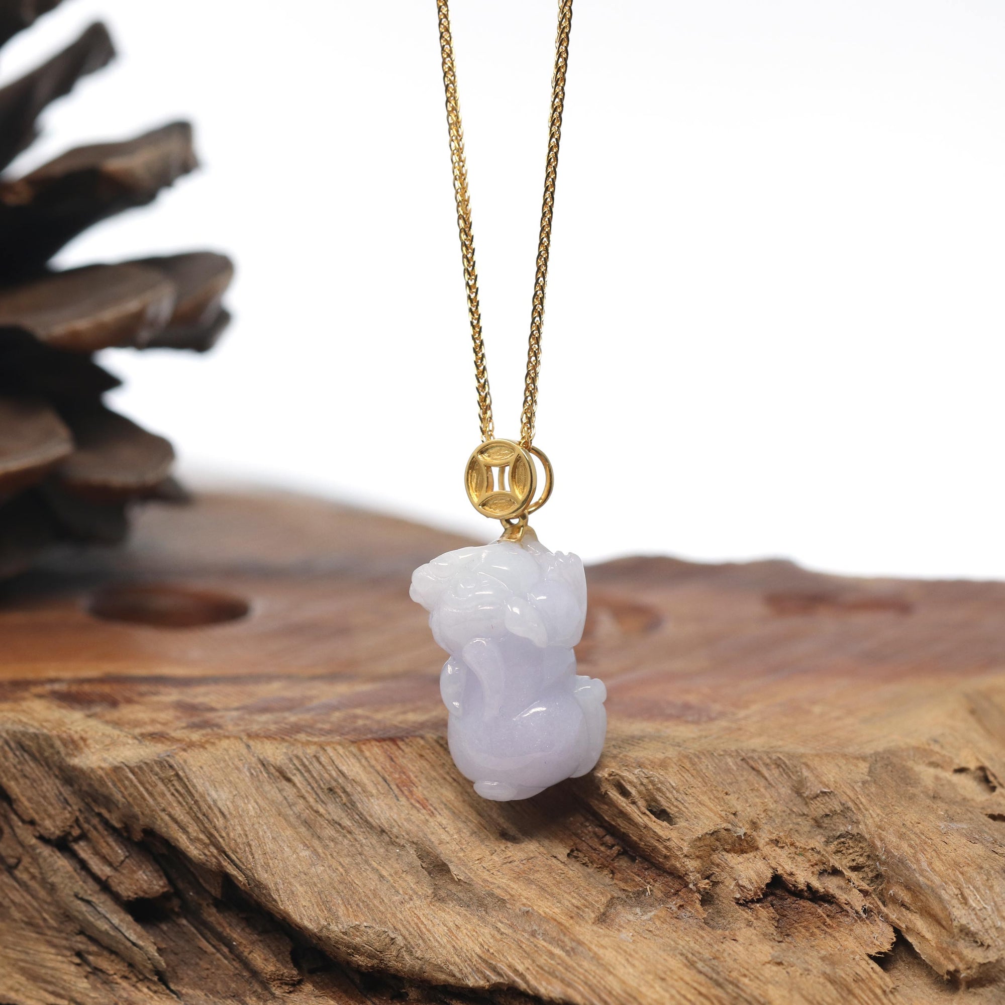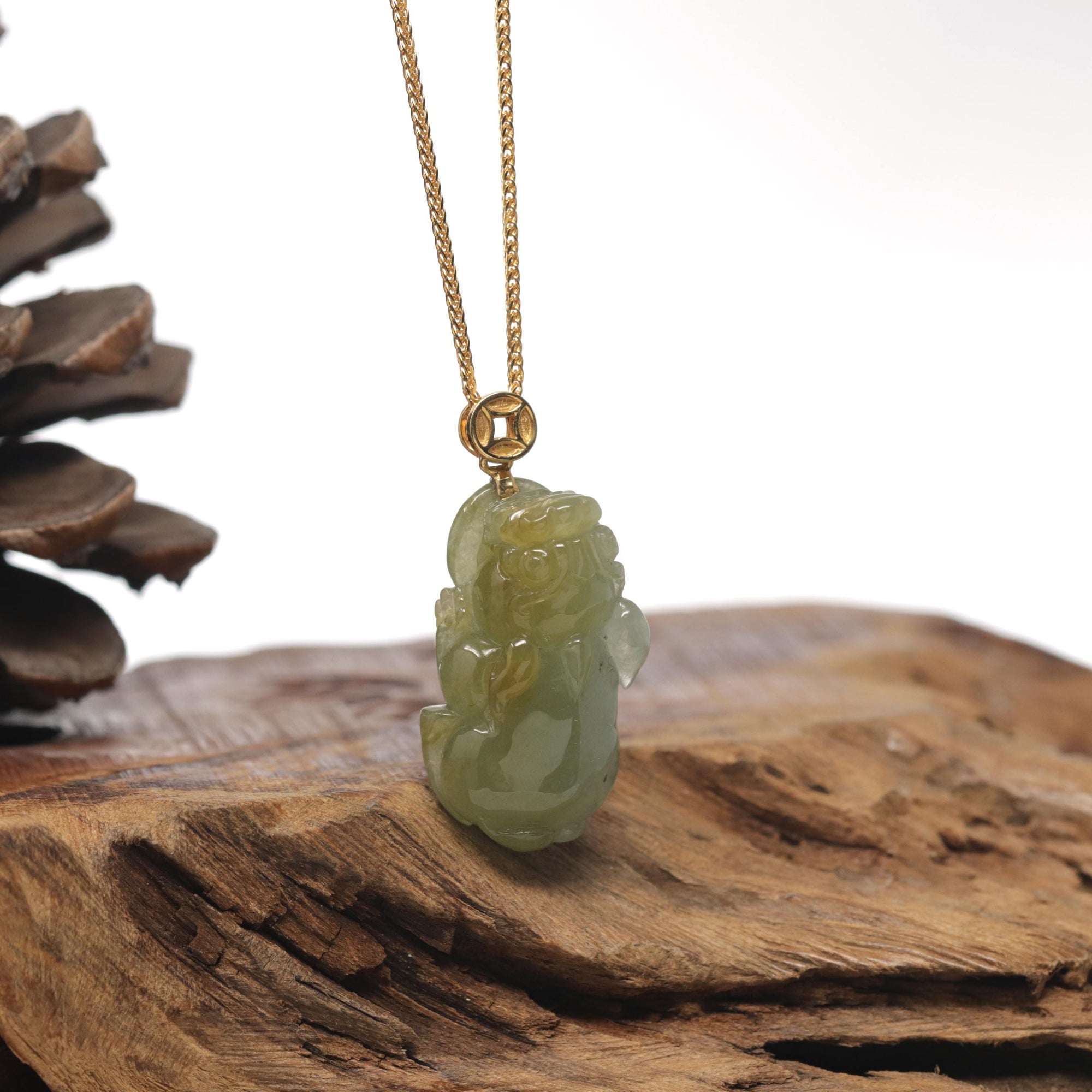 Genuine Burmese Lavender-Green Jadeite Jade PiXiu Pendant Necklace With 14K Gold Bail