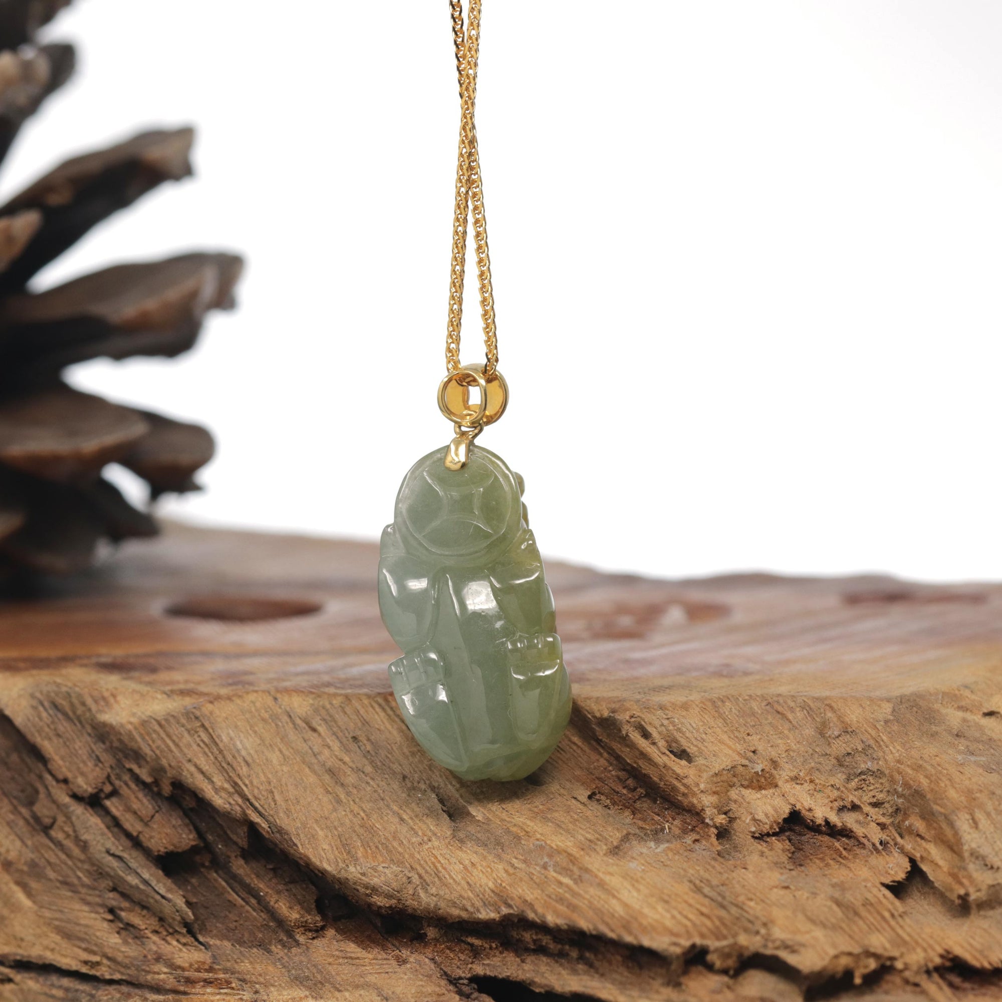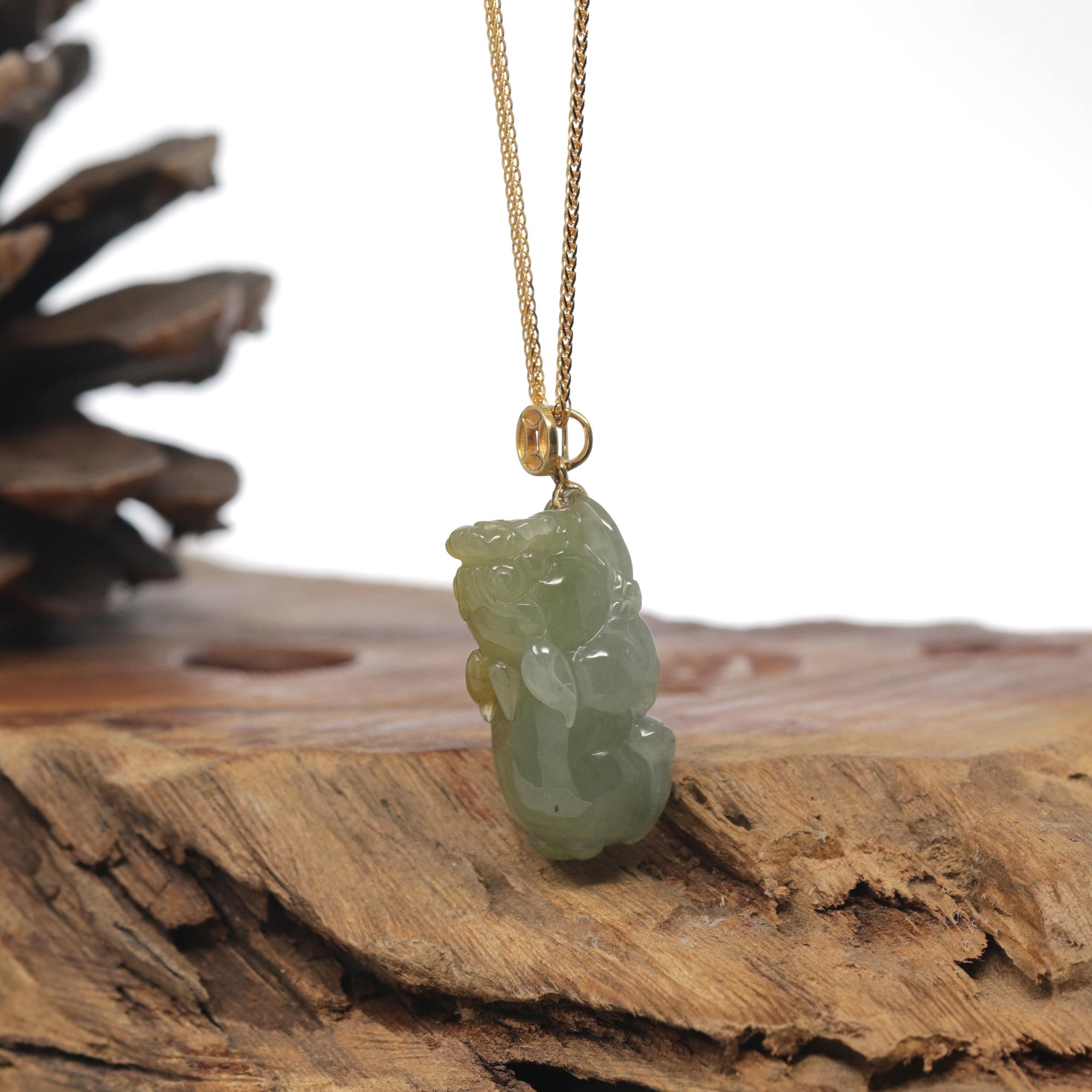 Genuine Burmese Blue-Green Jadeite Jade PiXiu Pendant Necklace With 14K Gold Bail