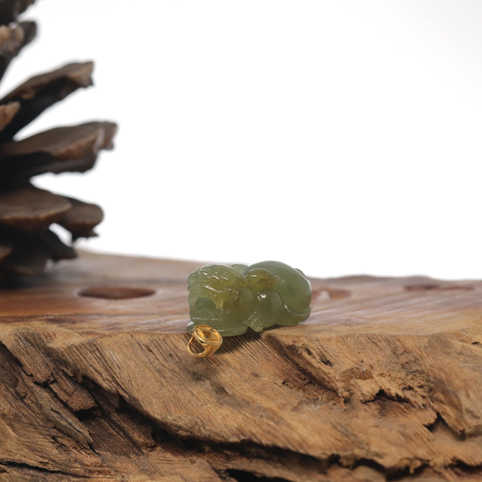 Baikalla Icy Oil-Green & Hazel "PiXiu" (Fortune Beast) Genuine Burmese Jadeite Jade Pendant W/ 18K Yellow Gold Bail