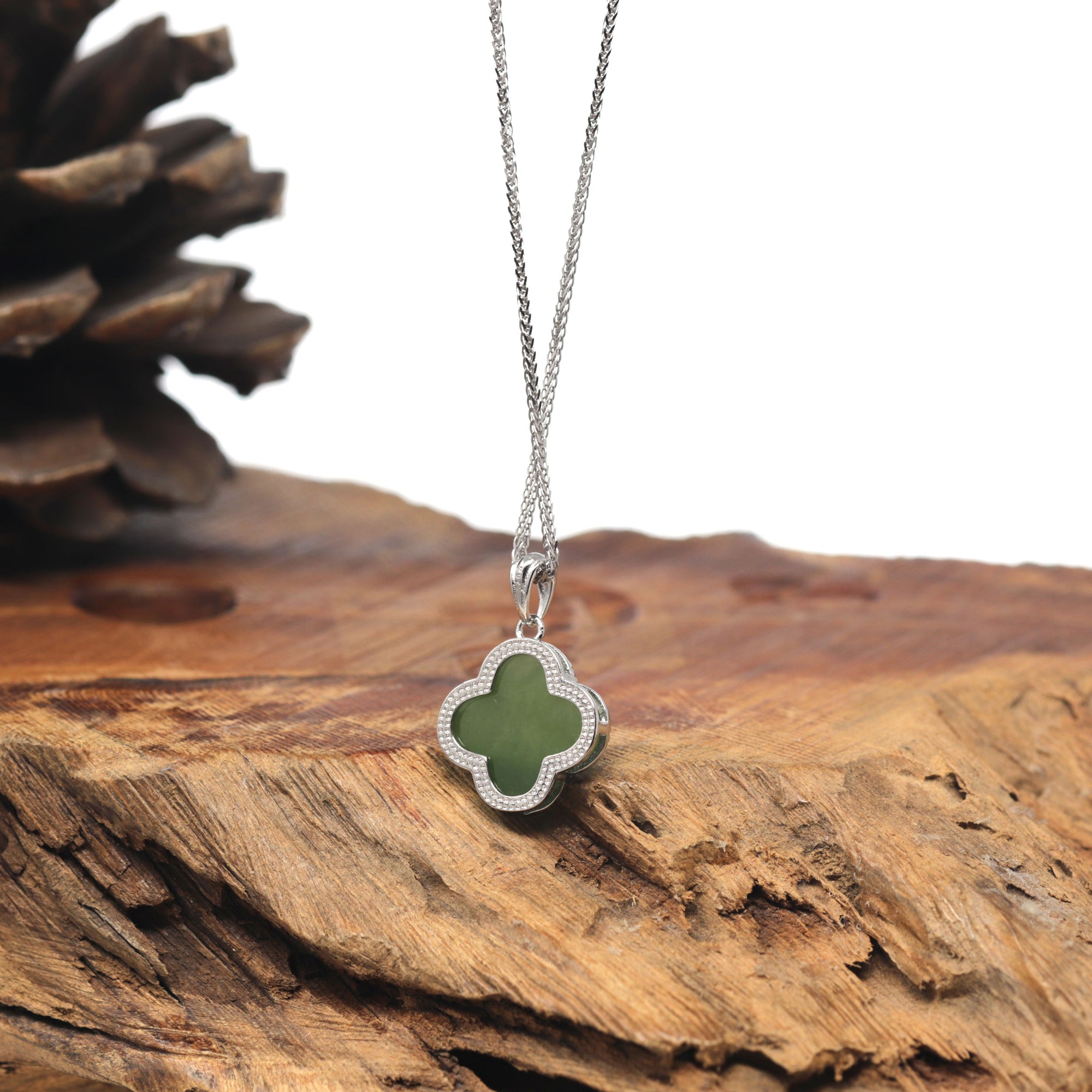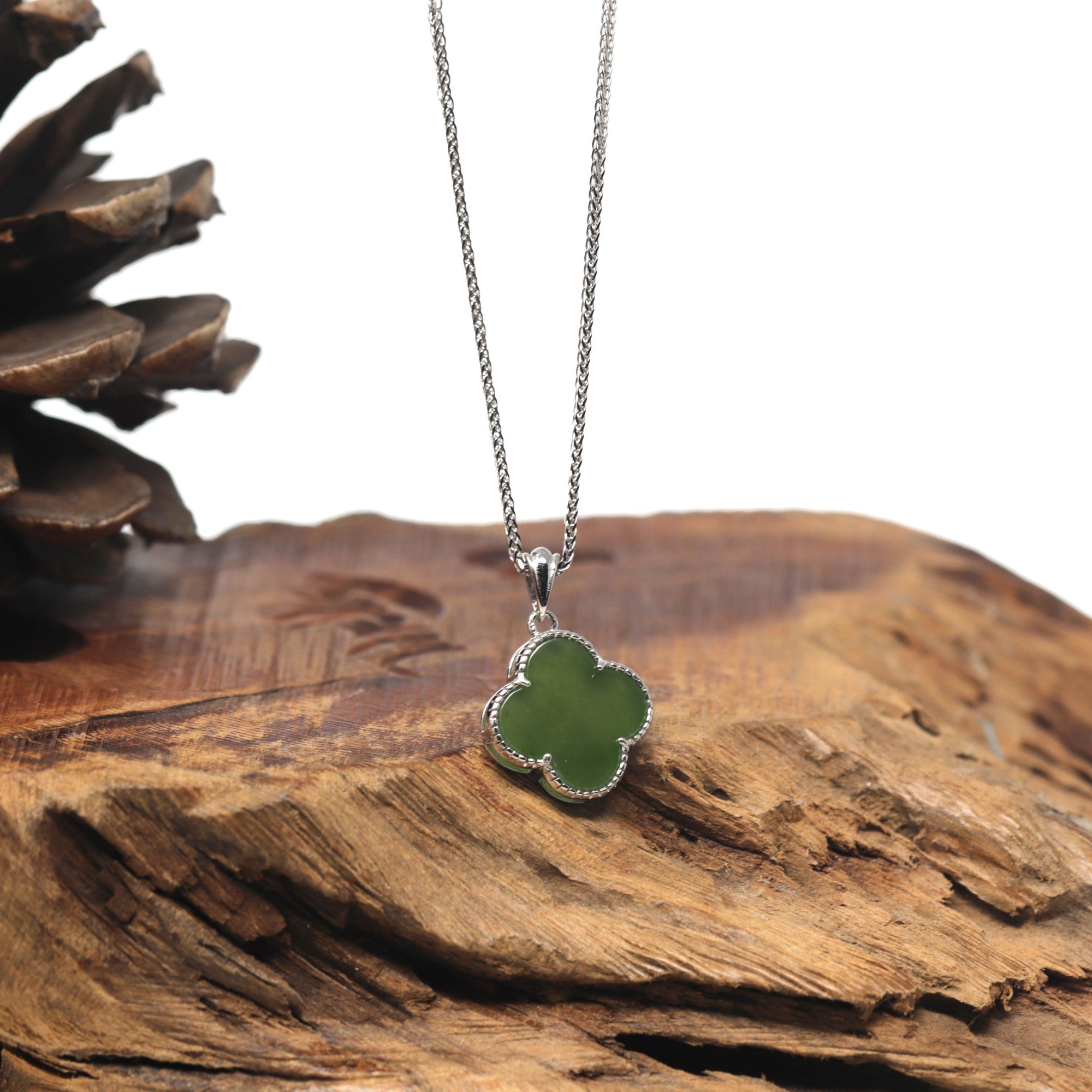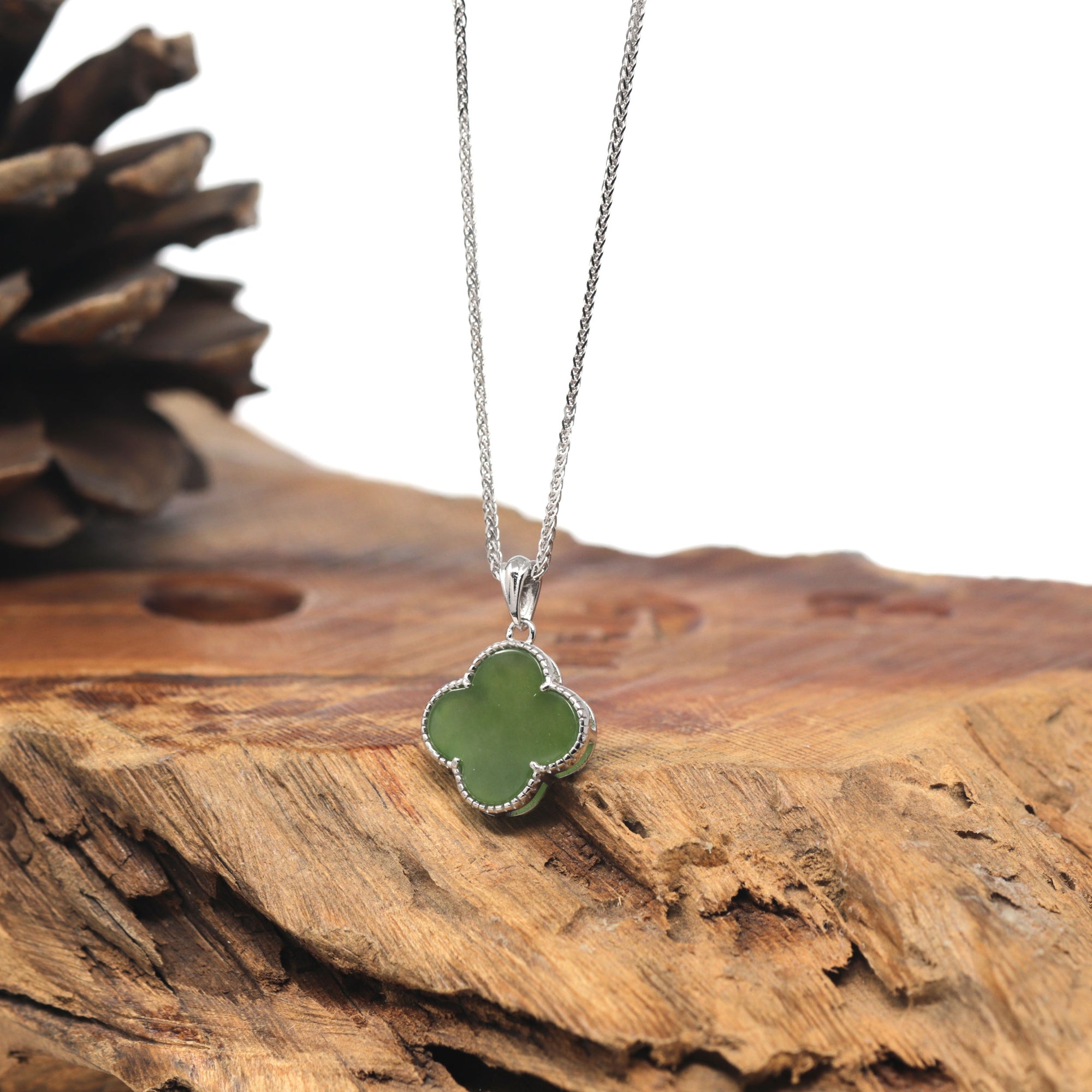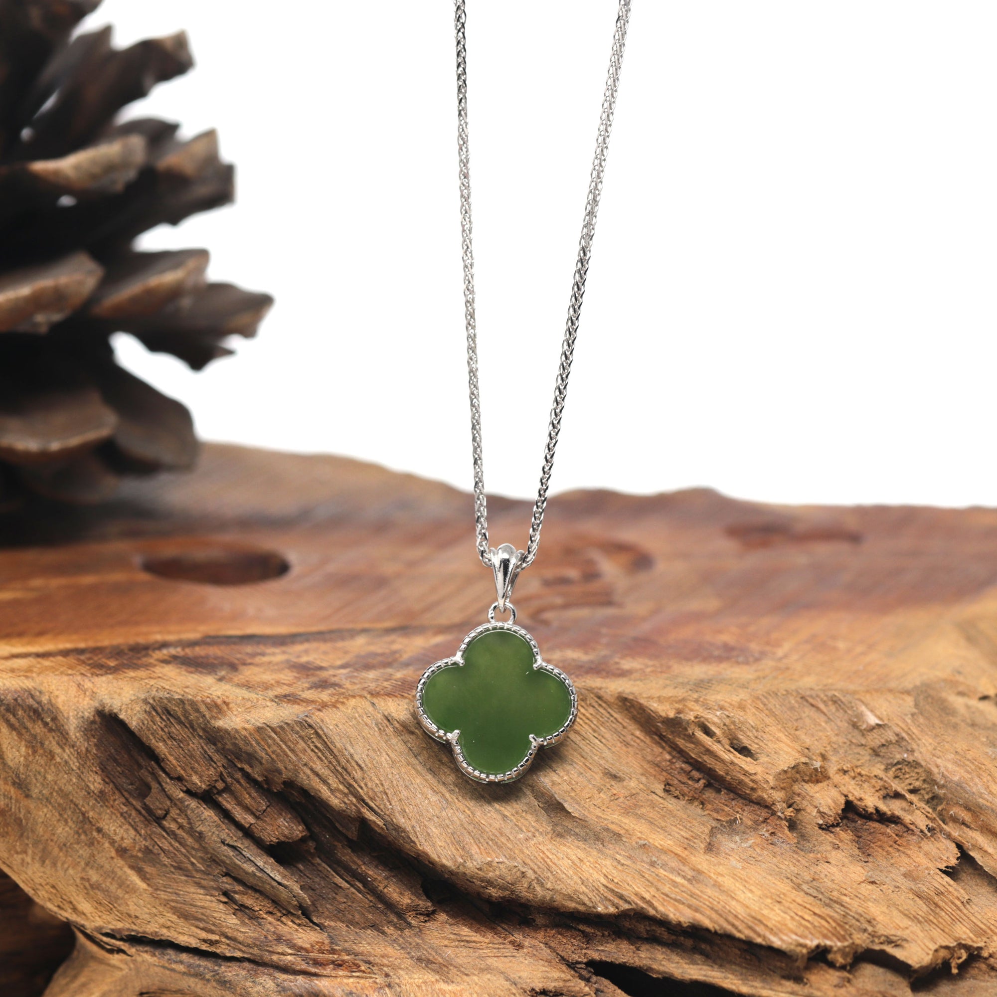 Baikalla™ Sterling Silver Real Green Nephrite Jade Four Leaf Clover Pendant Necklace