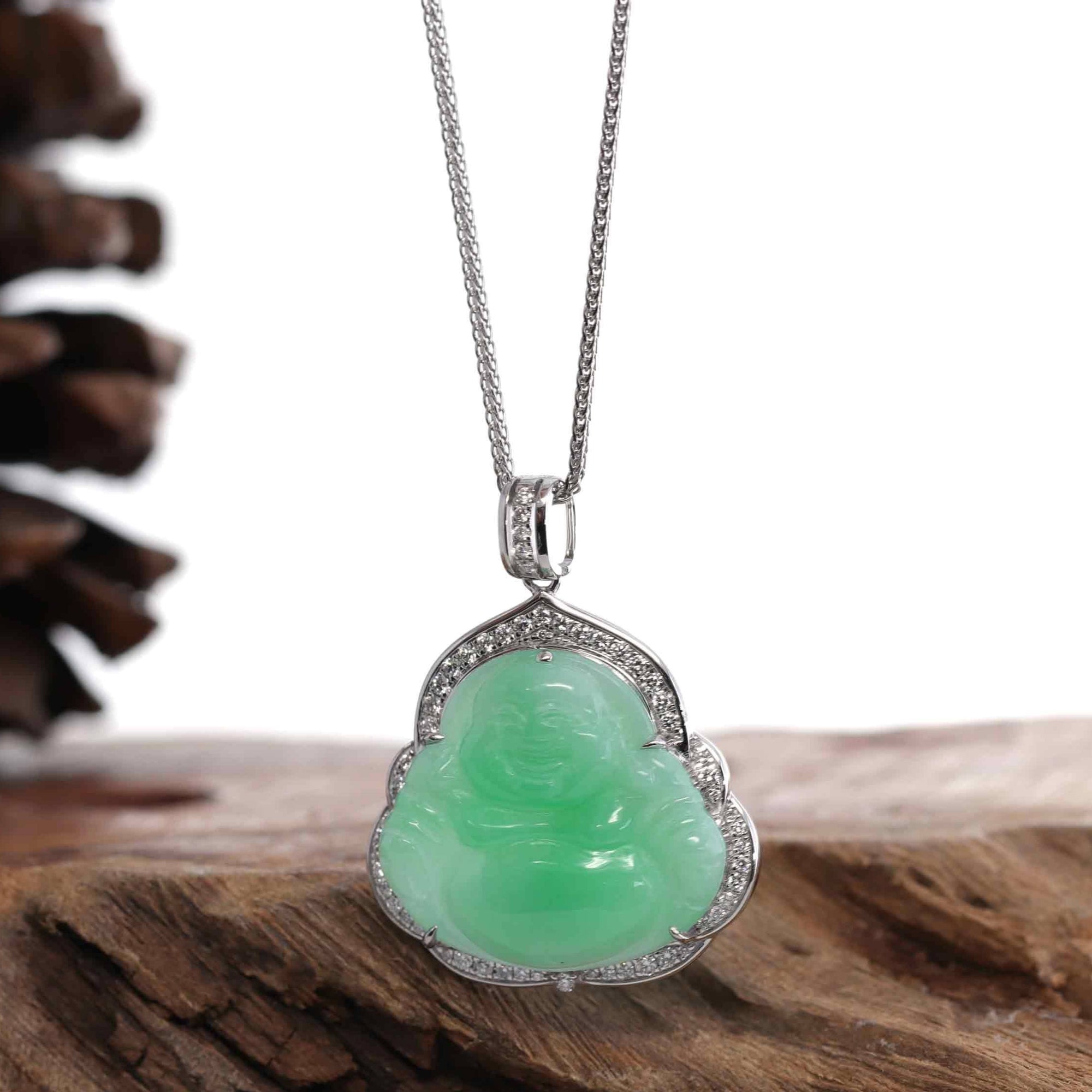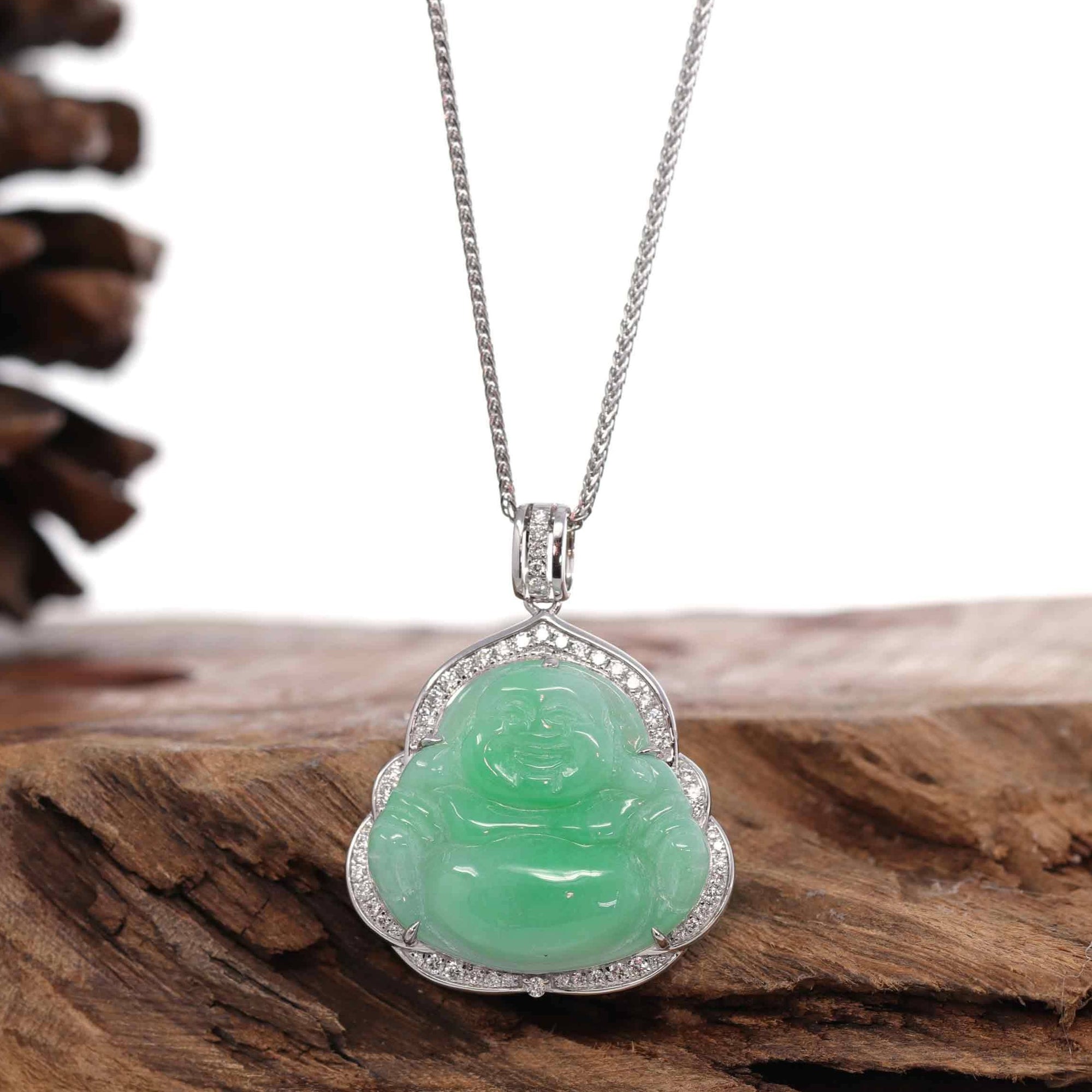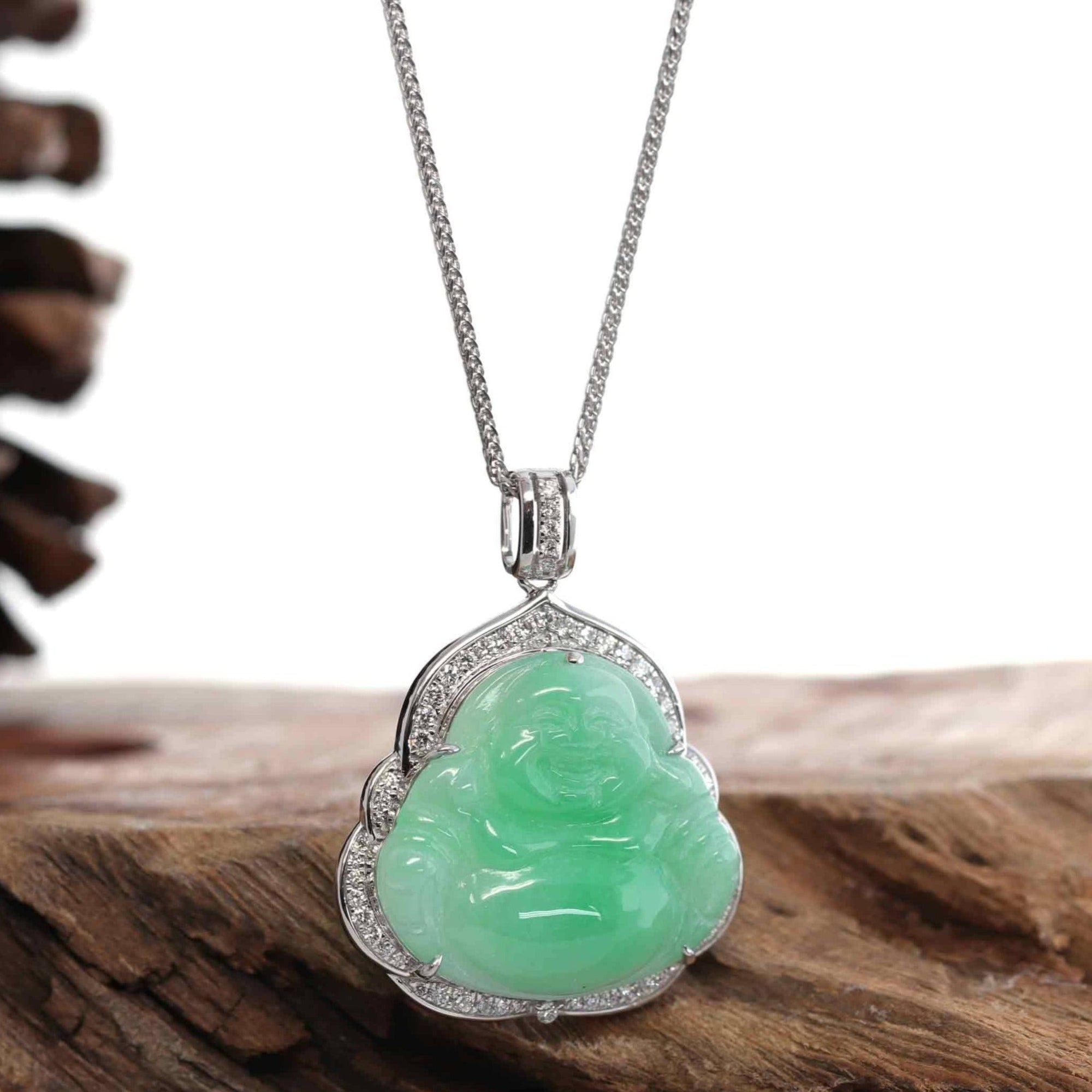* INTRODUCTION---14k White Gold & Genuine Green Jadeite Jade Buddha Pendant Necklace With VS1 Diamonds halo. The person who wears a Happy Buddha pendant around the neck attracts positive energy. They emit positive waves into the environment around them. The belief is all of the entire negativity is destroyed and a fighting spirit is generated within the person. The term Buddha literally means enlightened one, a knower to be a mentor to save and protect you. Representing prosperity, good luck, and wealth. Perfect everyday style.