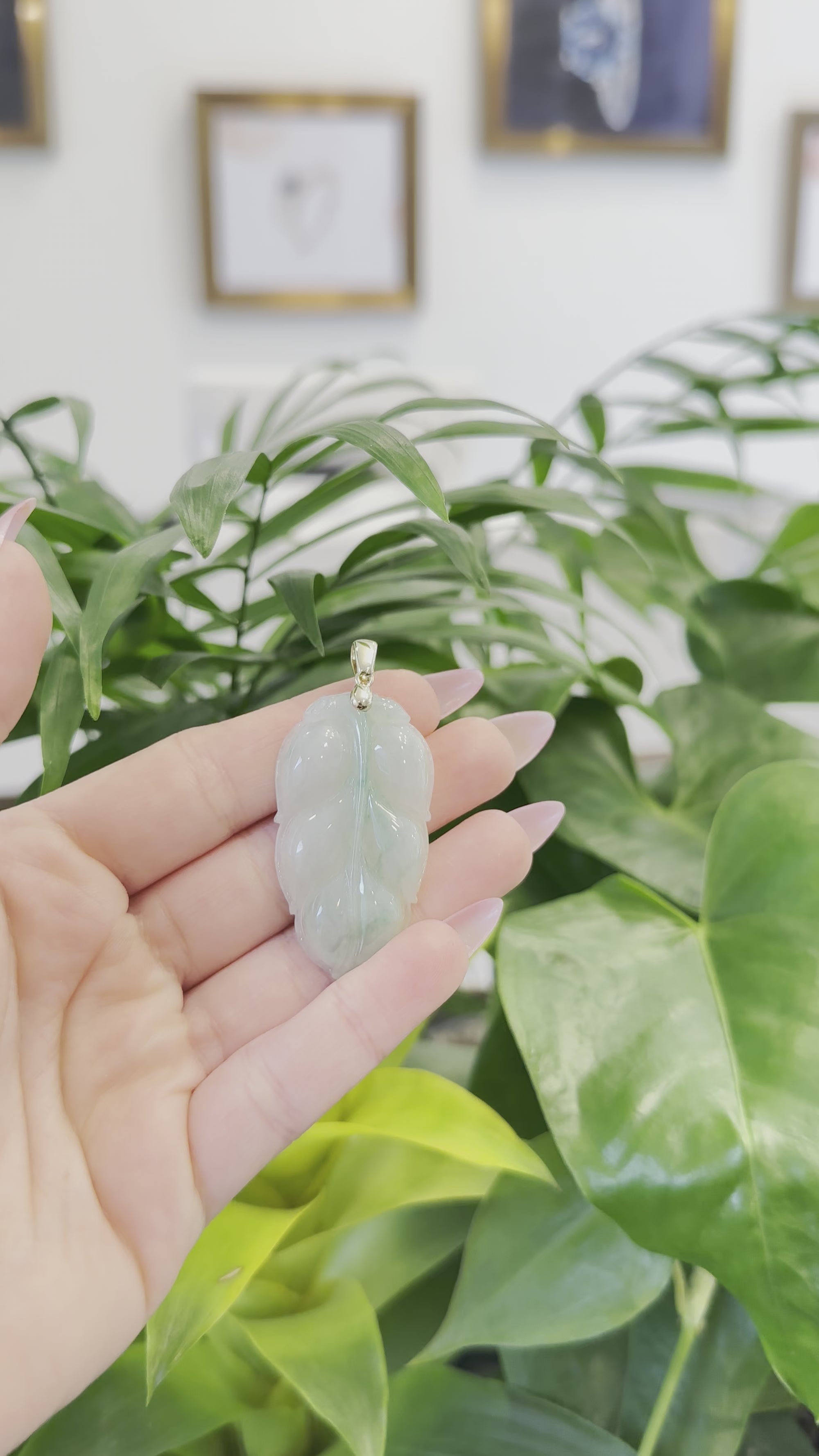 Genuine Ice Green Jadeite Jade Jin Zhi Yu Ye (Leaf) Necklace With 14k Yellow Gold Bail