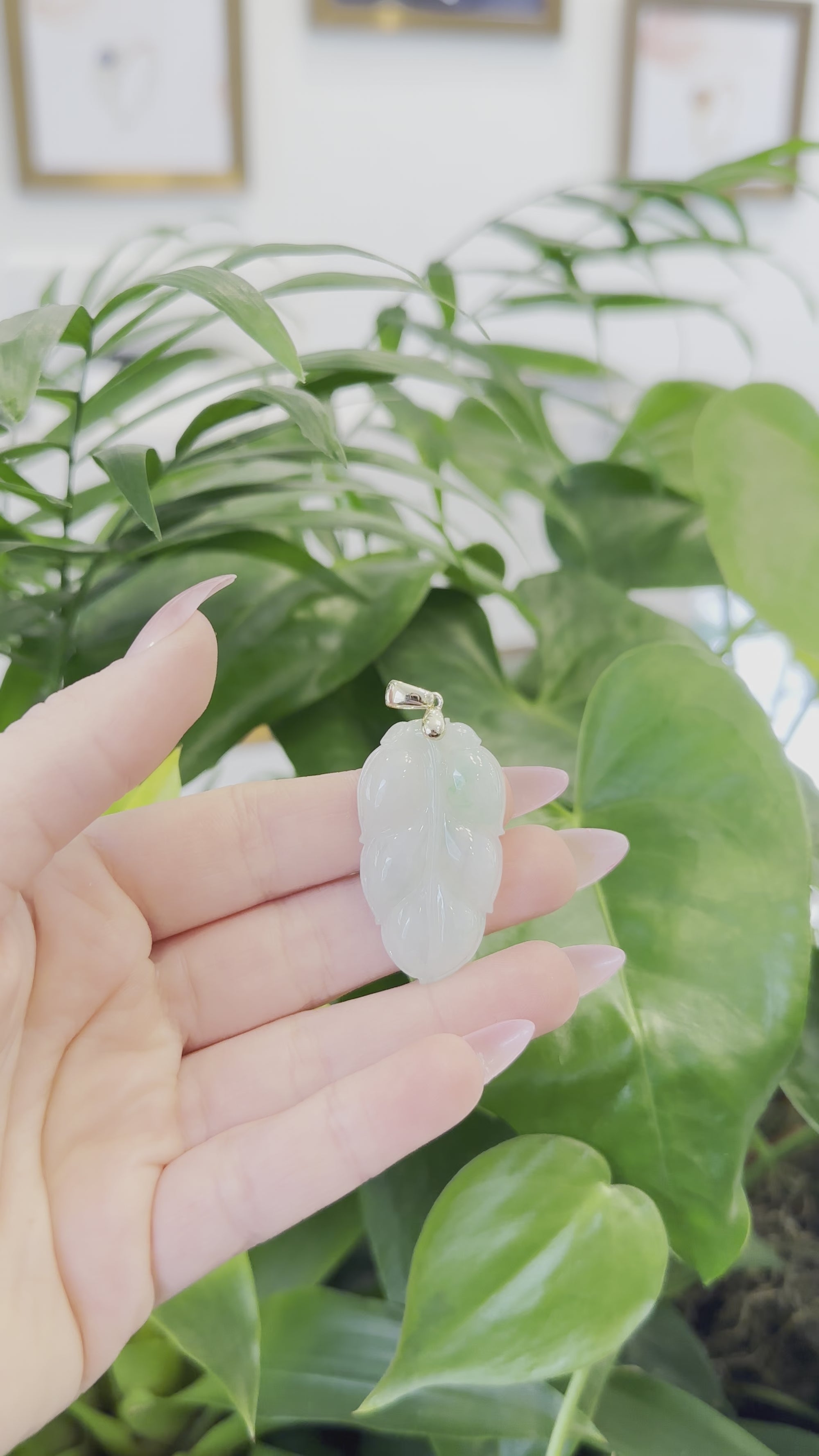 Genuine Ice Green Jadeite Jade Jin Zhi Yu Ye (Leaf) Necklace With 14k Yellow Gold Bail