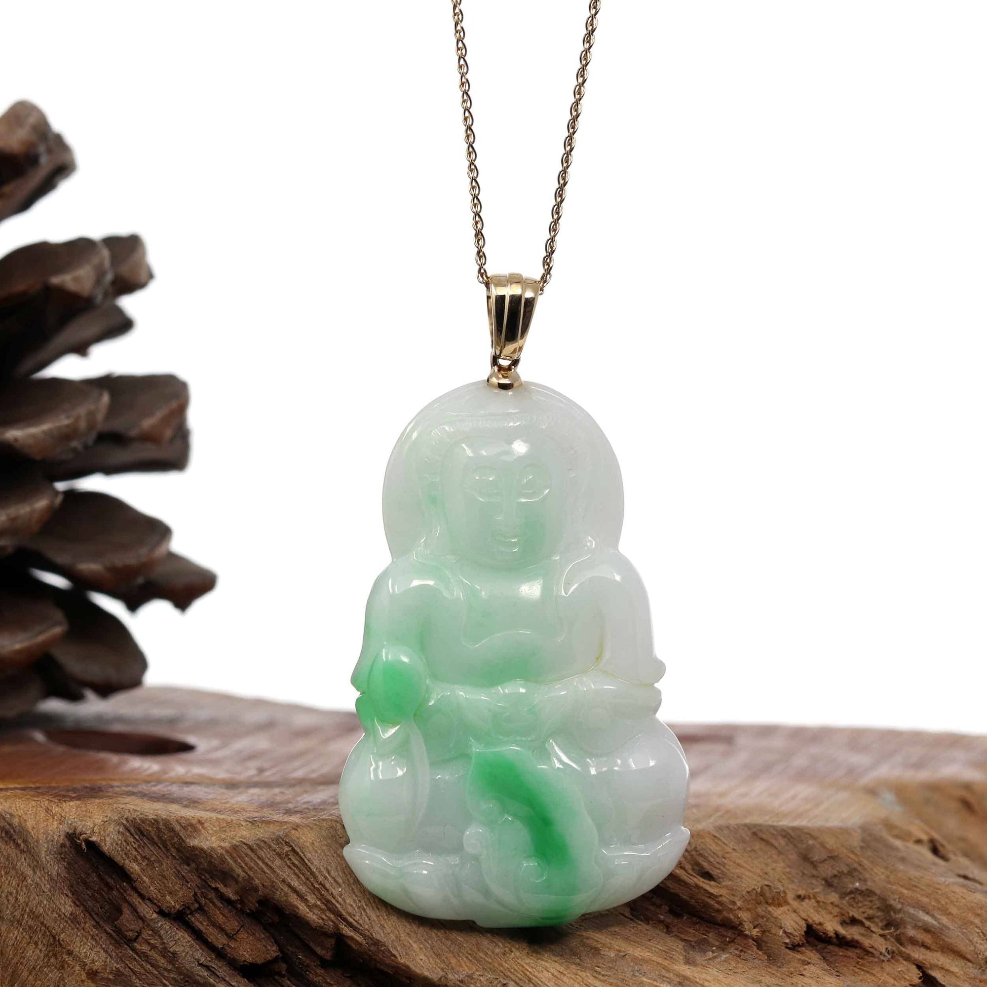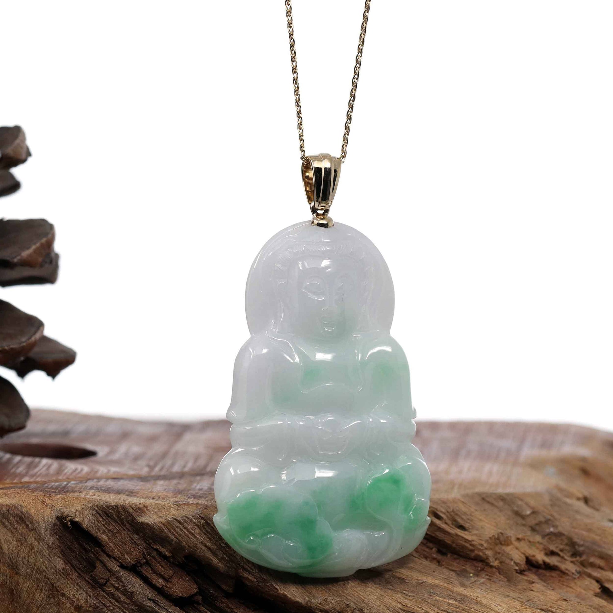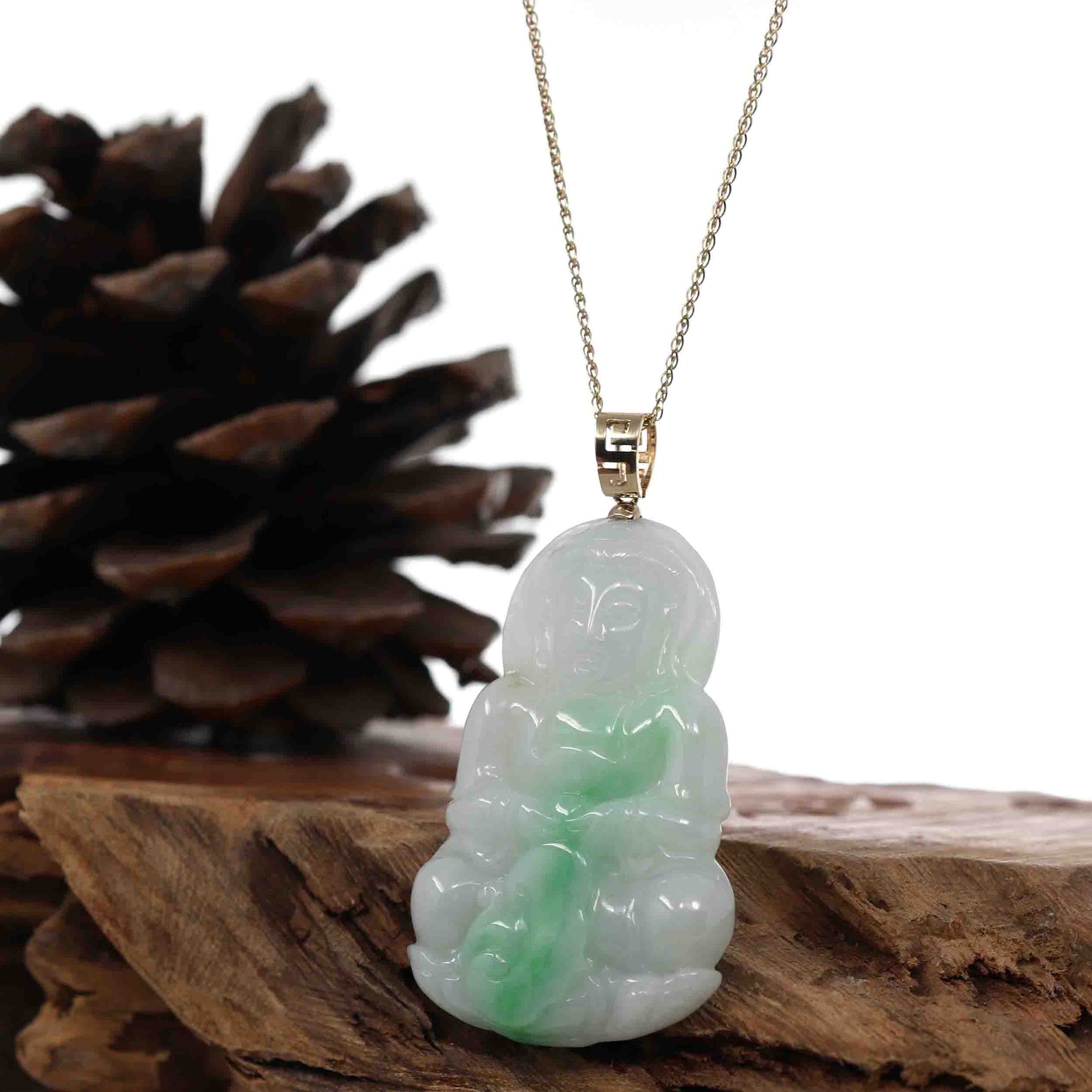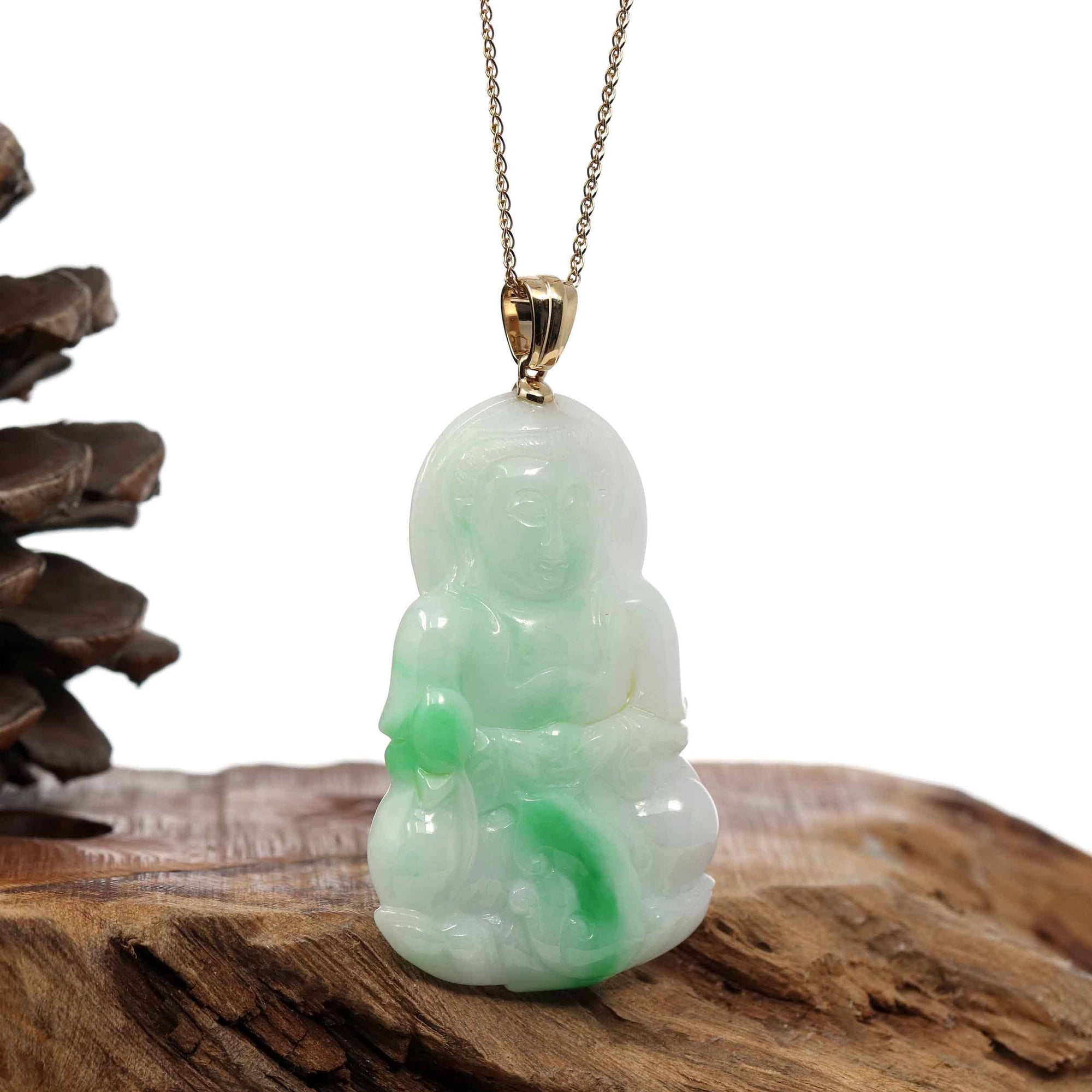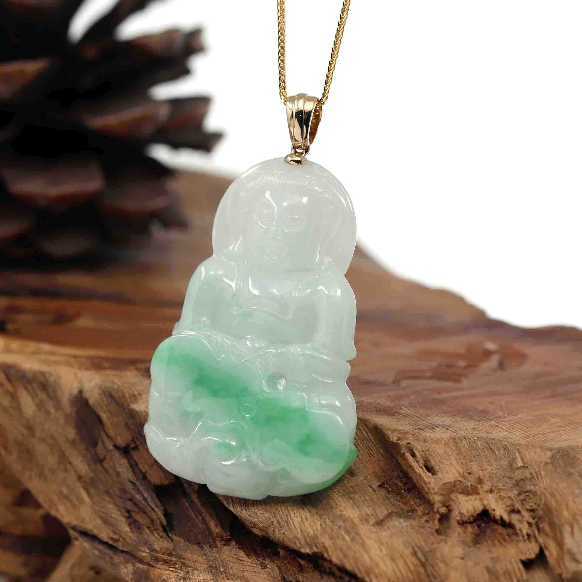 Goddess of Compassion" 14k Yellow Gold Genuine Burmese Jadeite Jade Guanyin Necklace With Good Luck Design