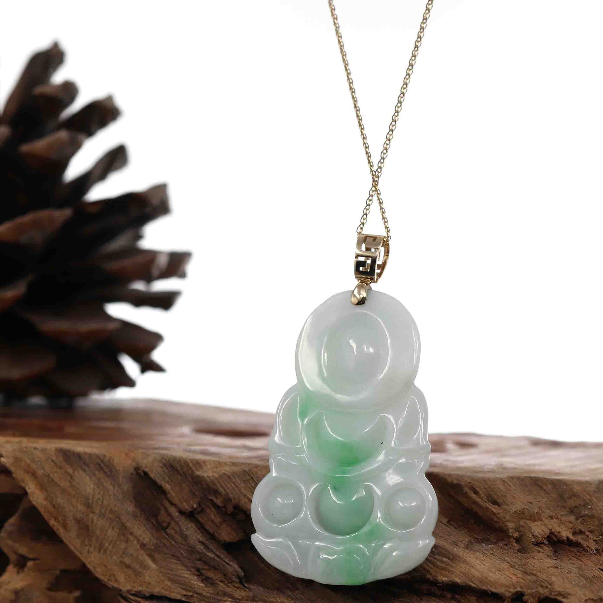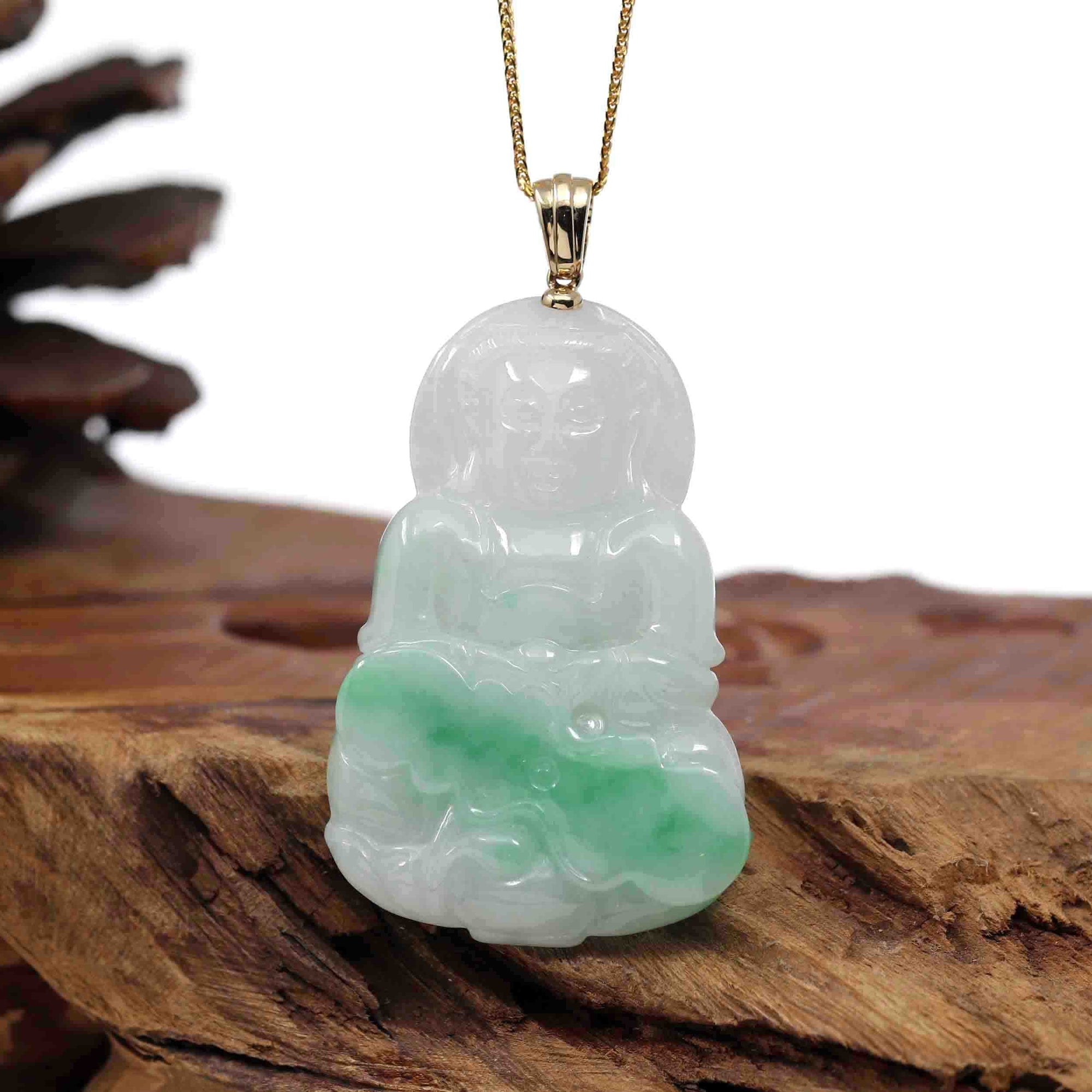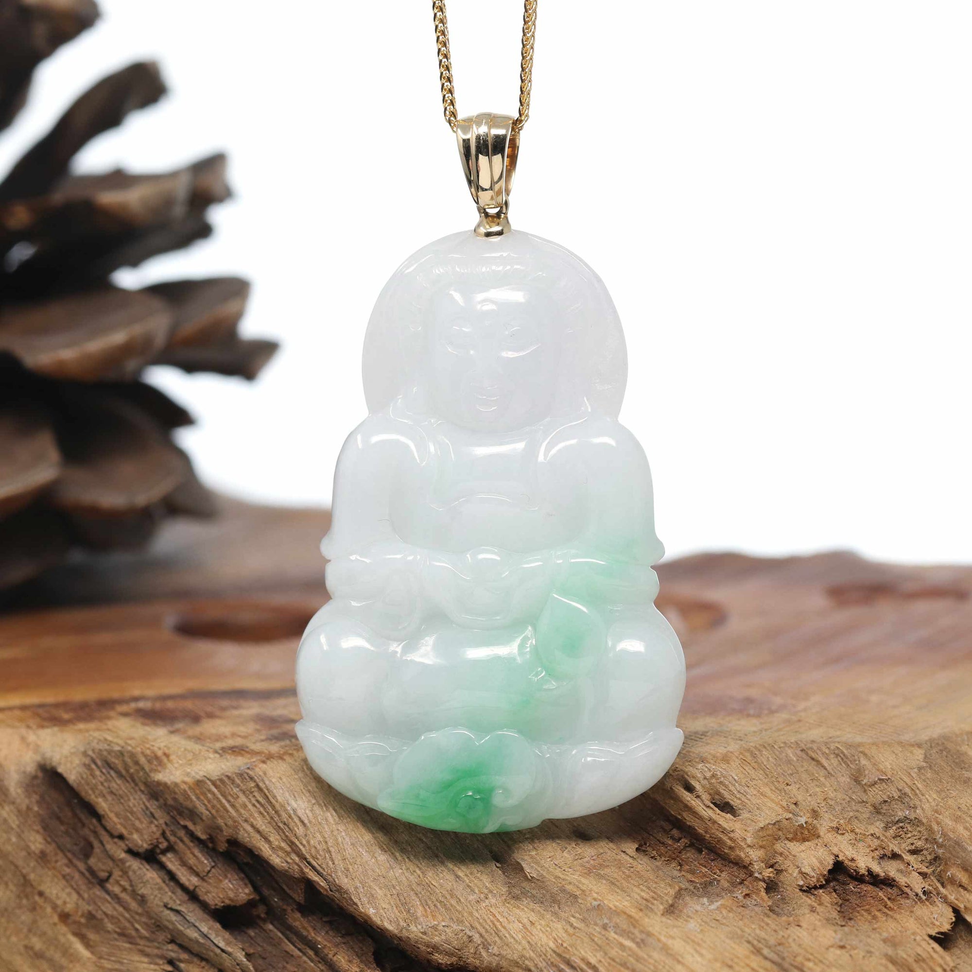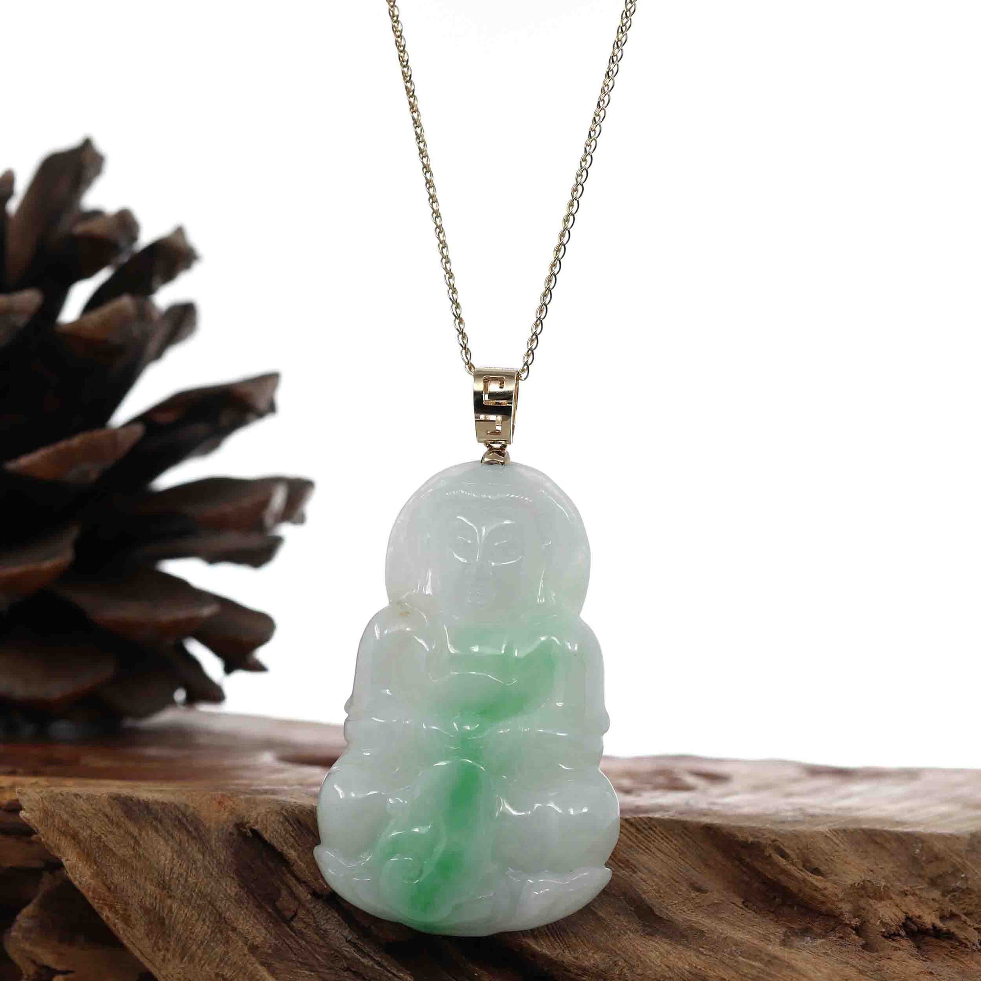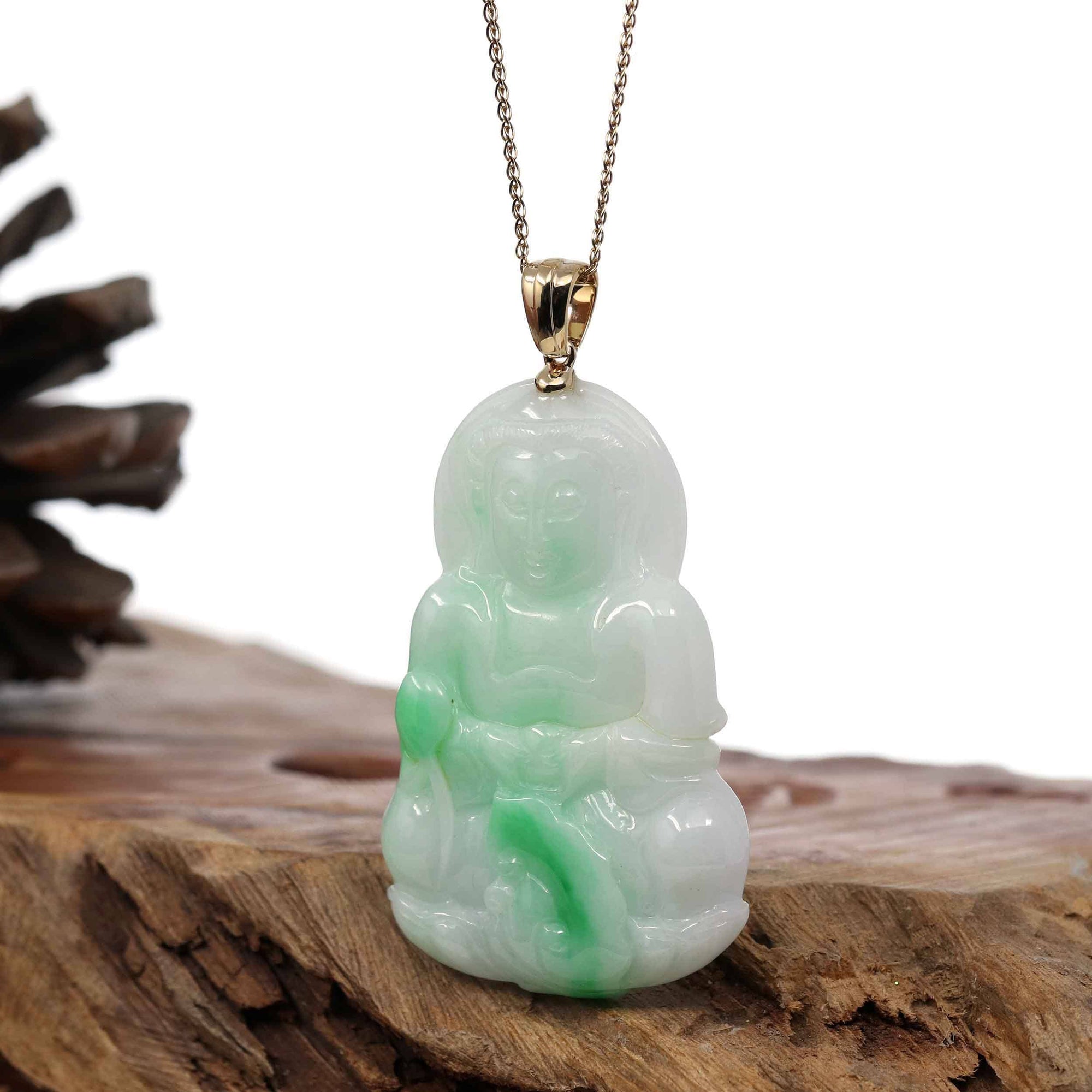 Goddess of Compassion" 14k Yellow Gold Genuine Burmese Jadeite Jade Guanyin Necklace With Good Luck Design
