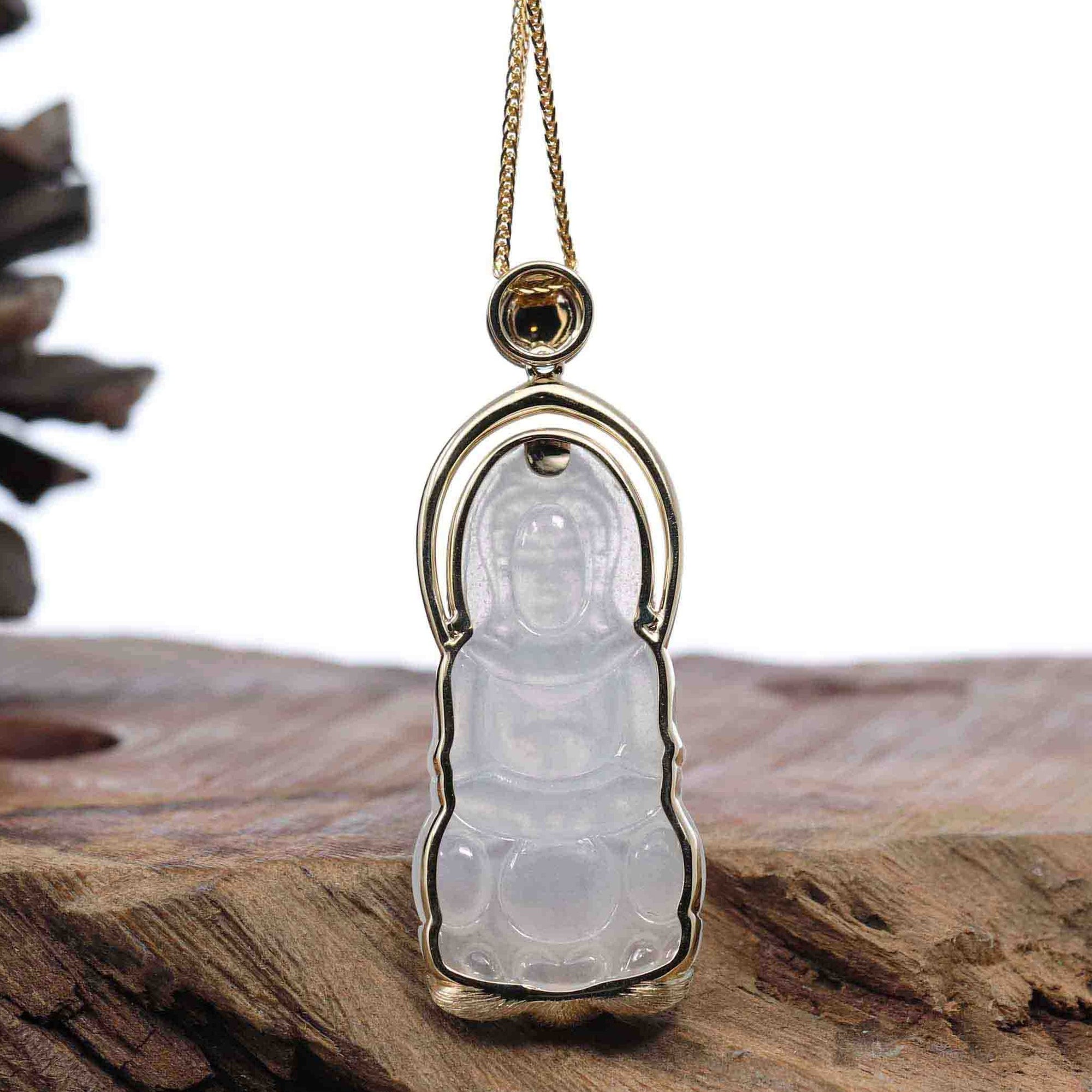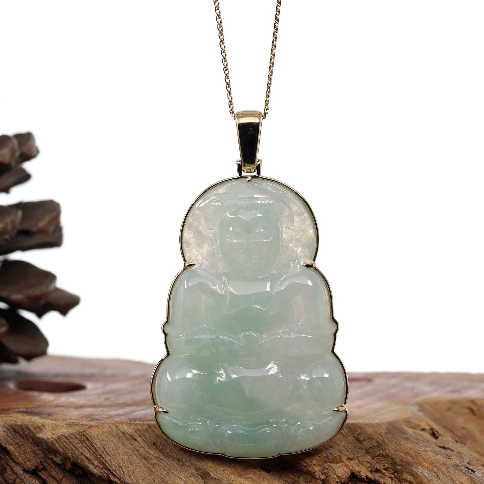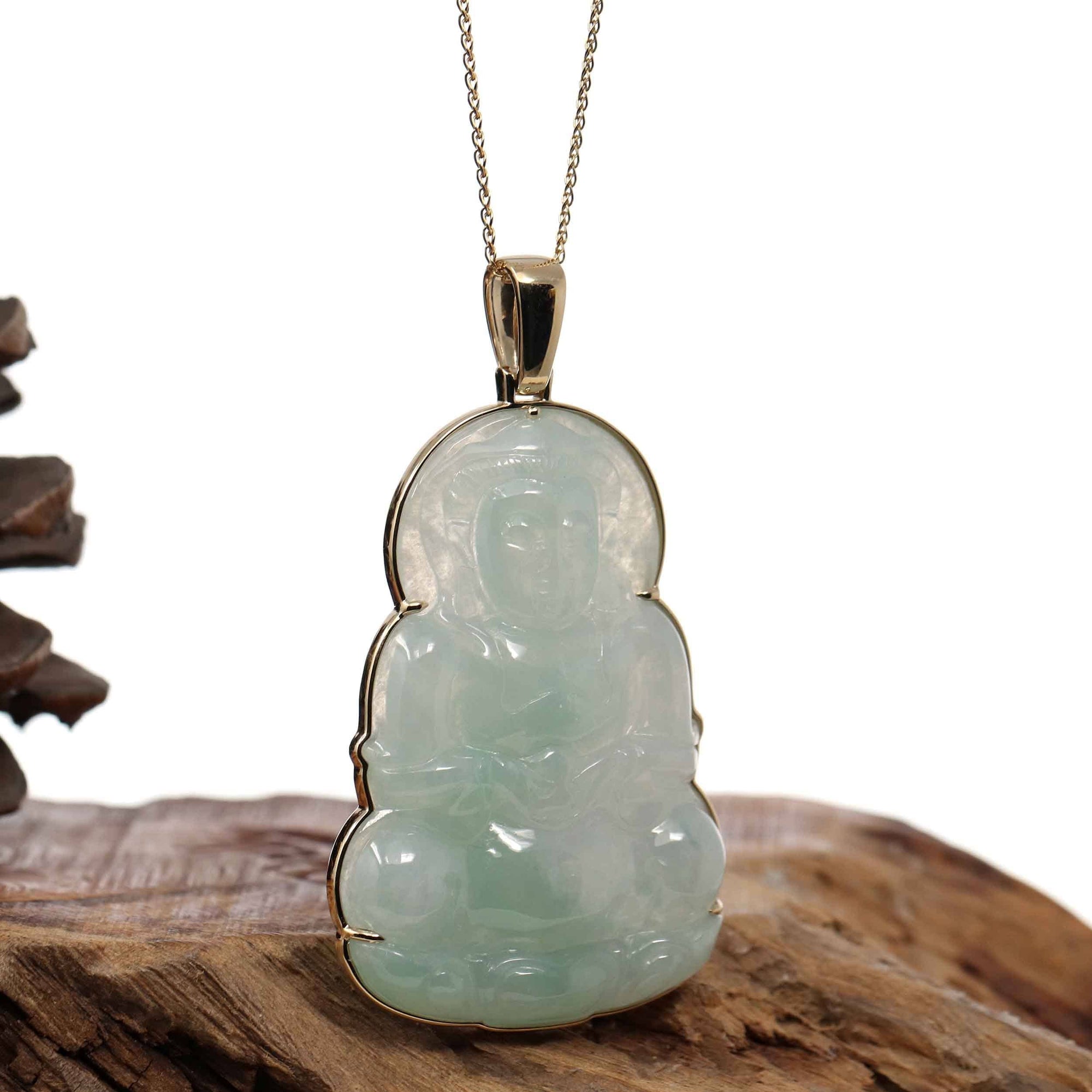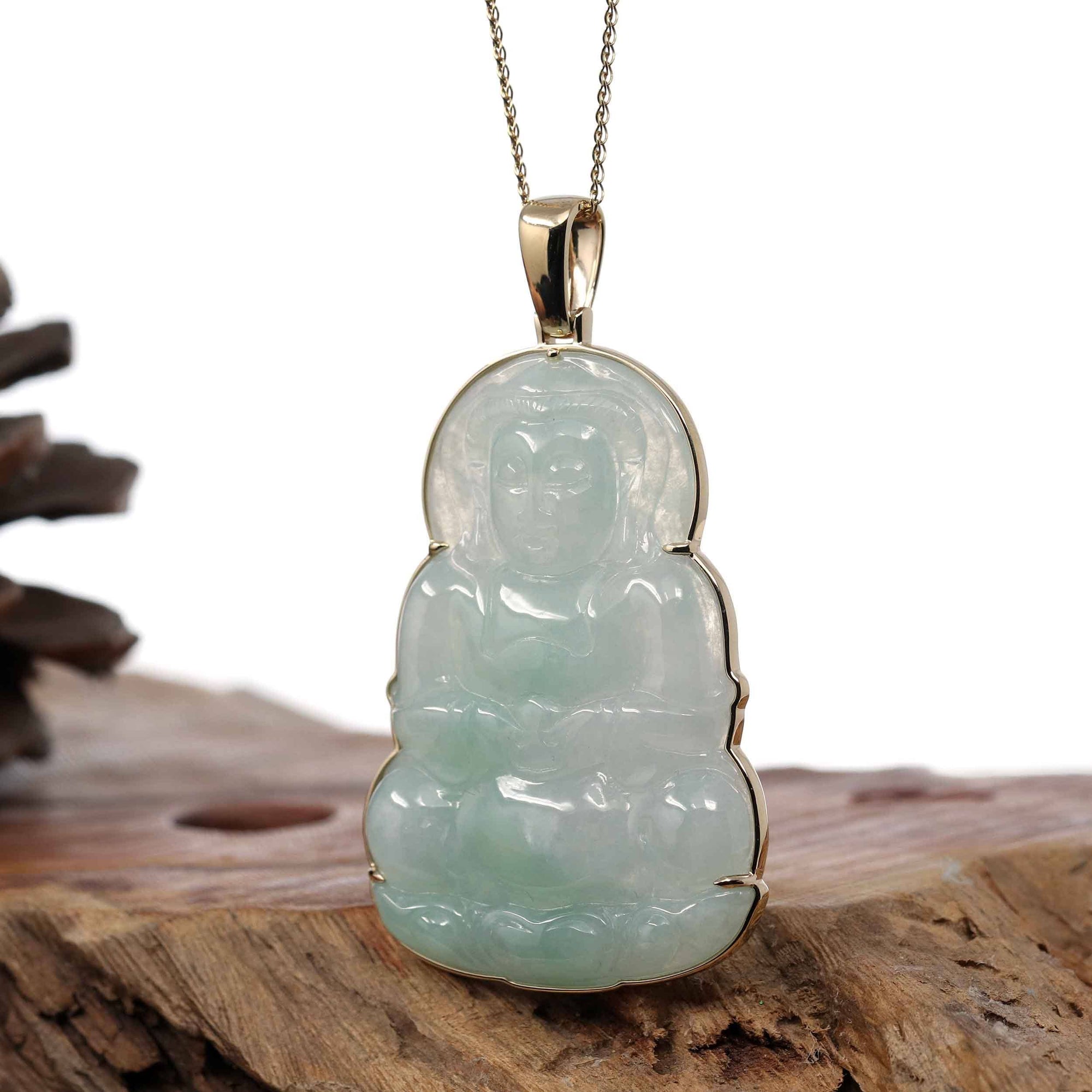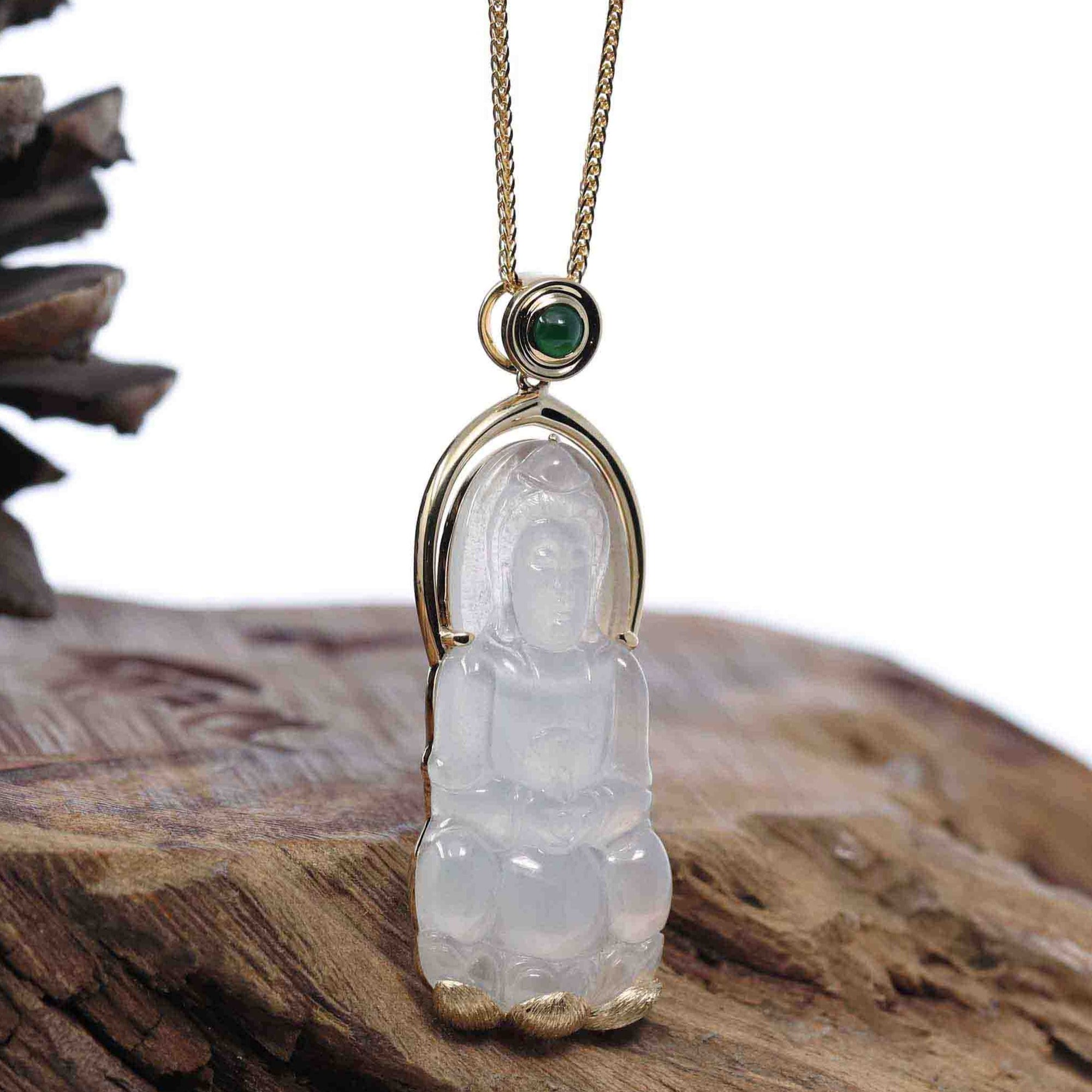 Baikalla 14k Yellow Gold "Goddess of Compassion" Genuine Ice Burmese Jadeite Jade Guanyin Necklace With Gold Bail