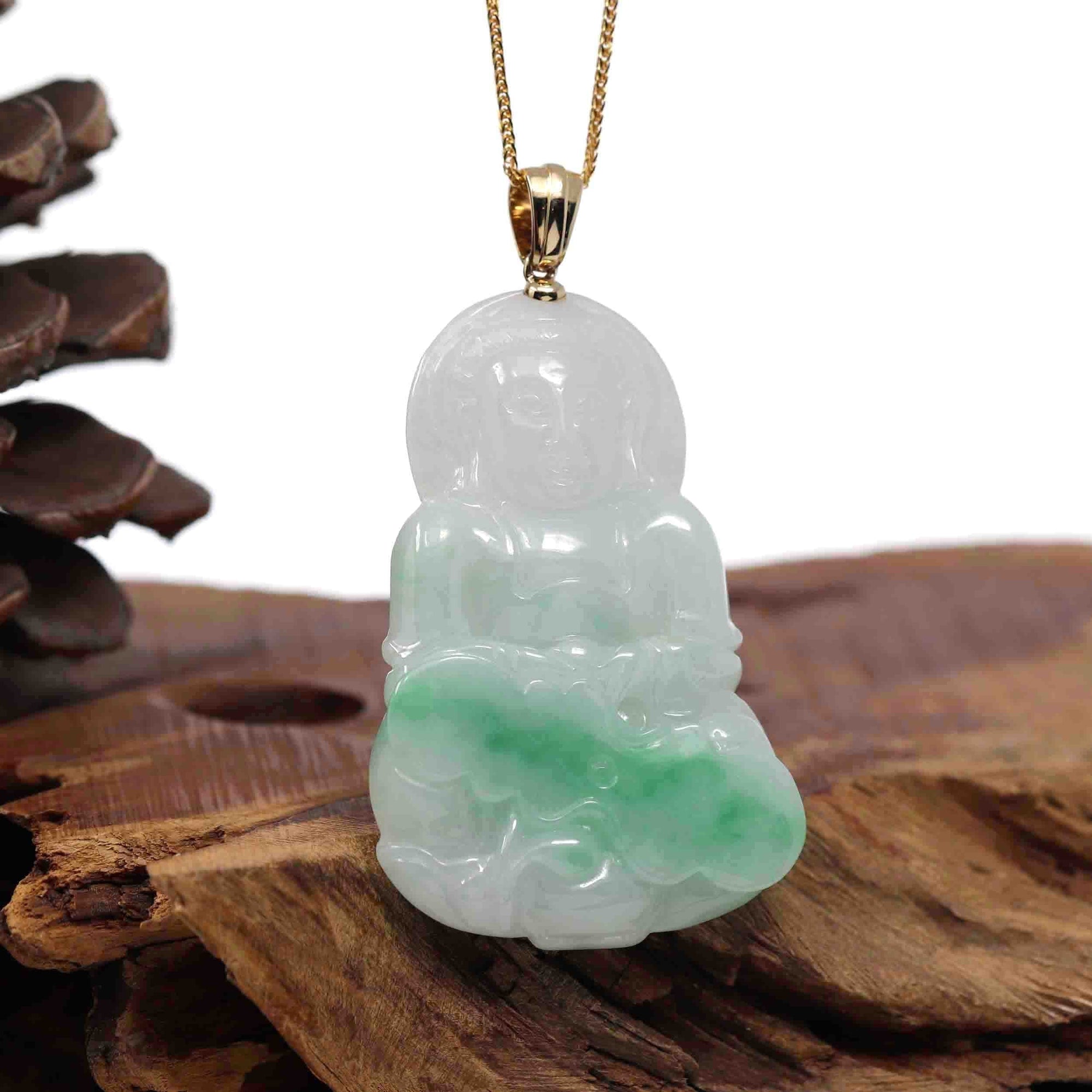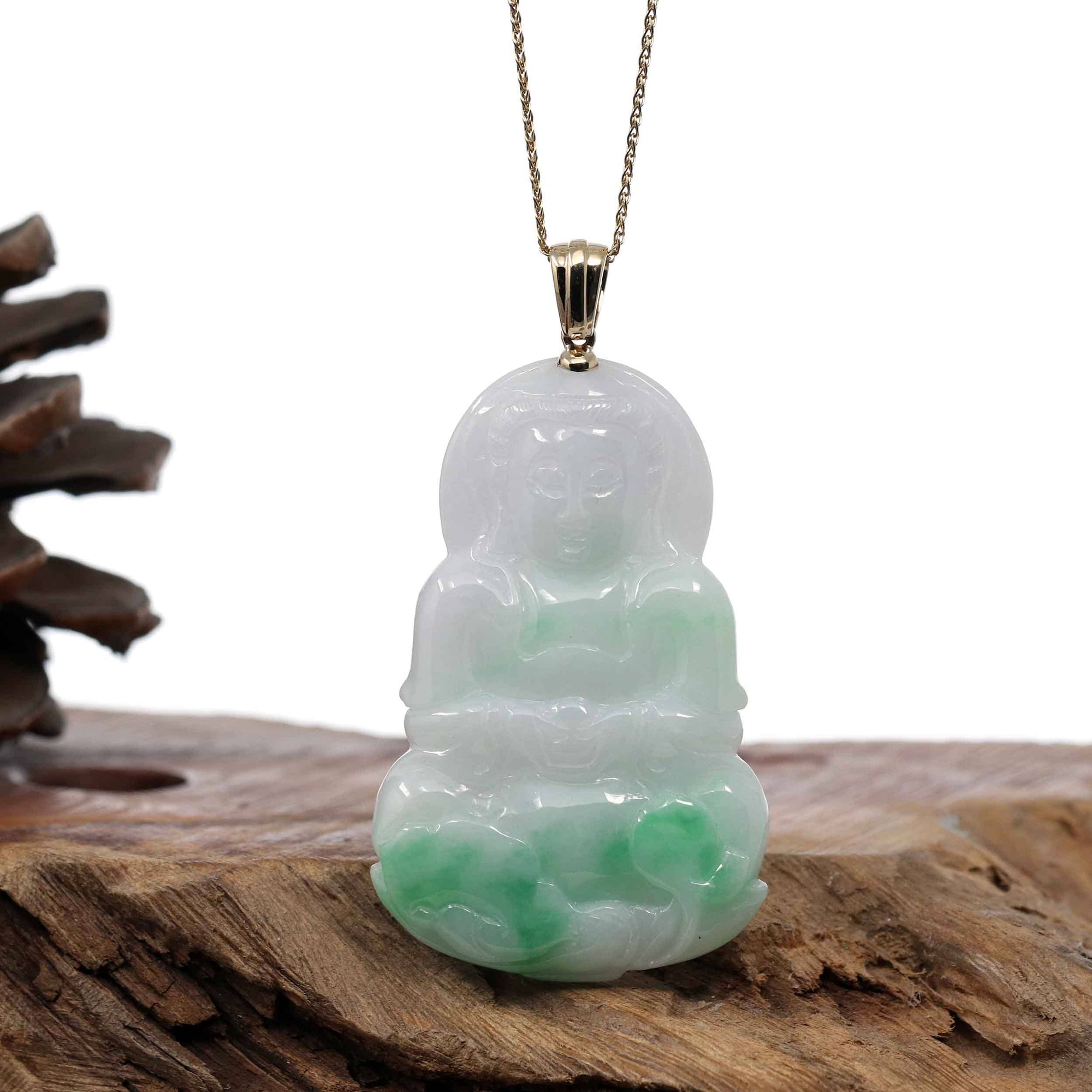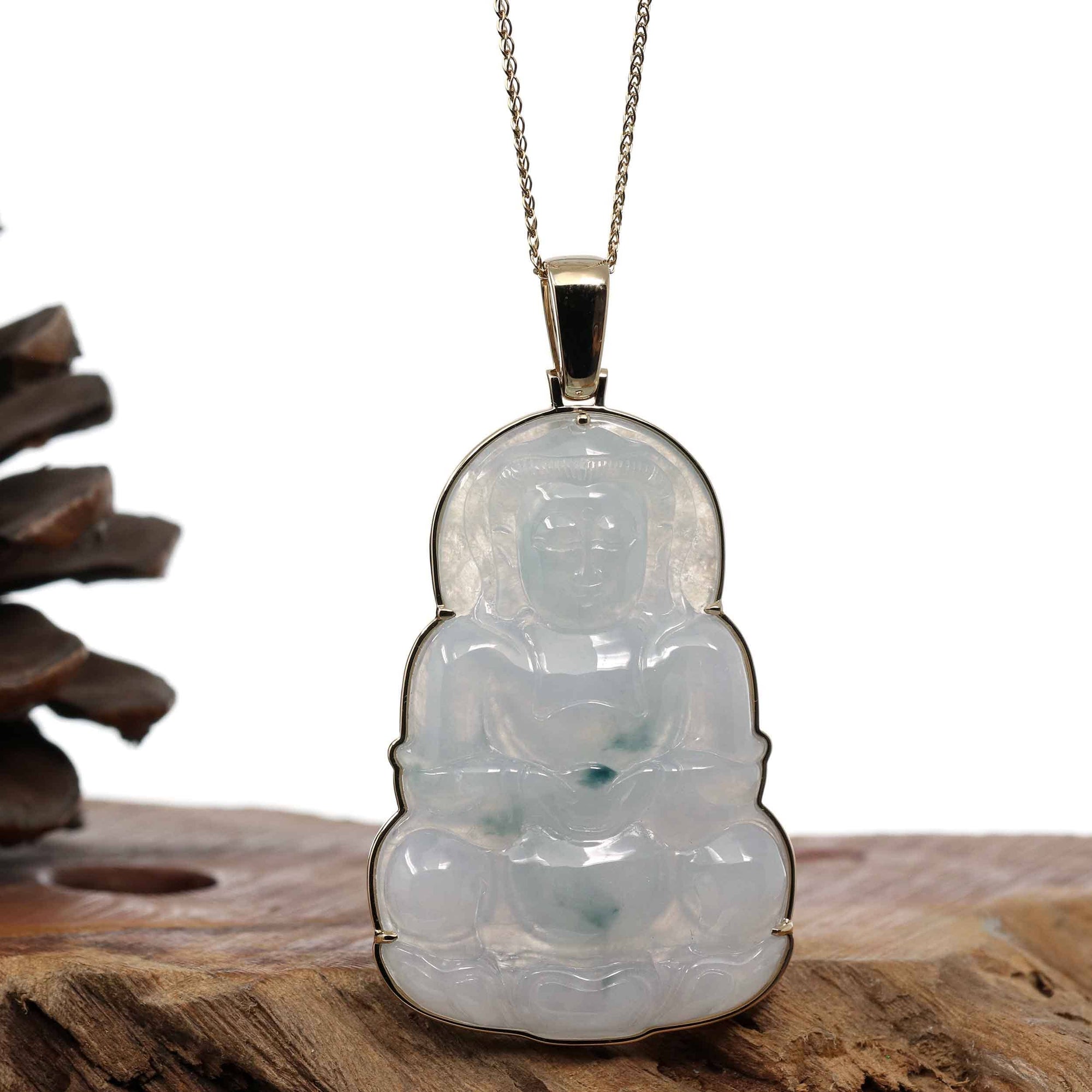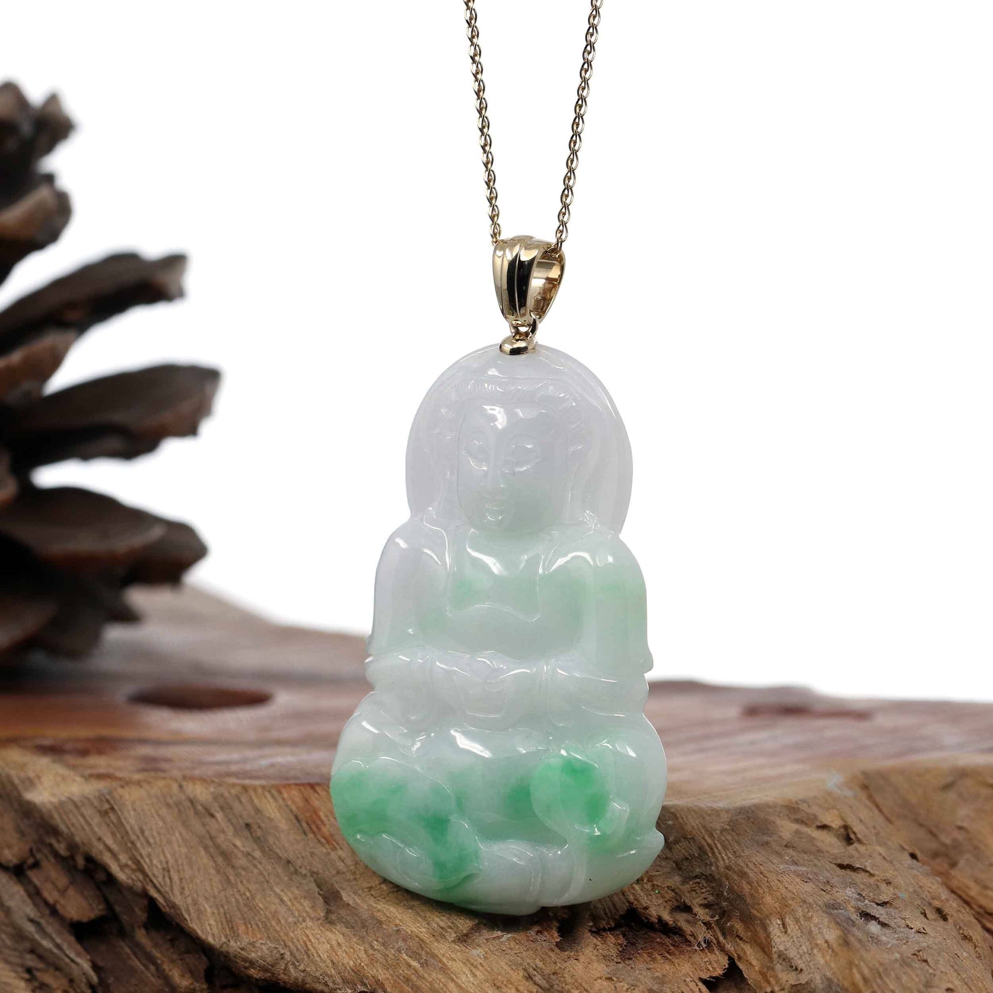 Baikalla 14k Yellow Gold "Goddess of Compassion" Genuine Ice Burmese Jadeite Jade Guanyin Necklace With Gold Bail