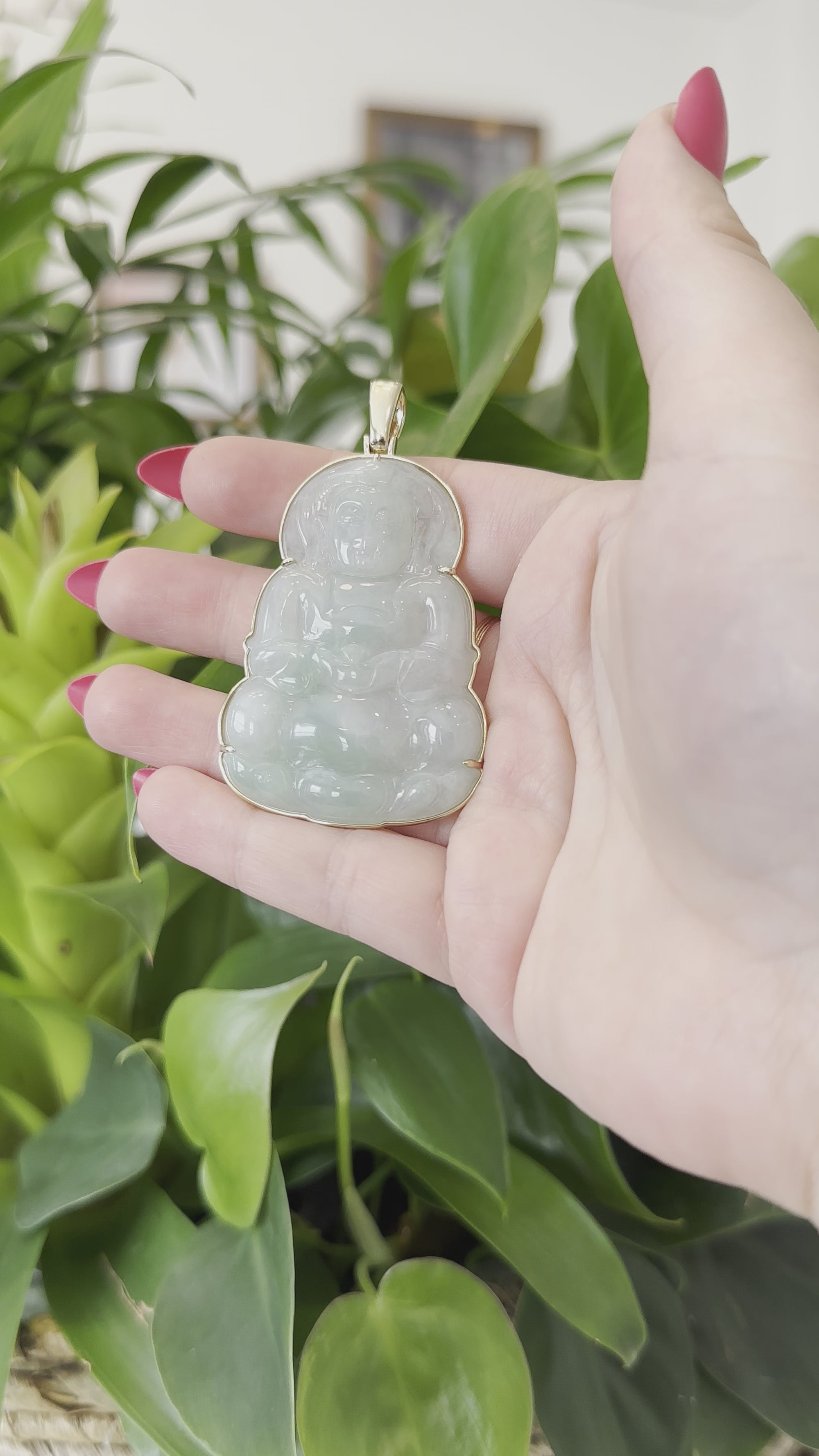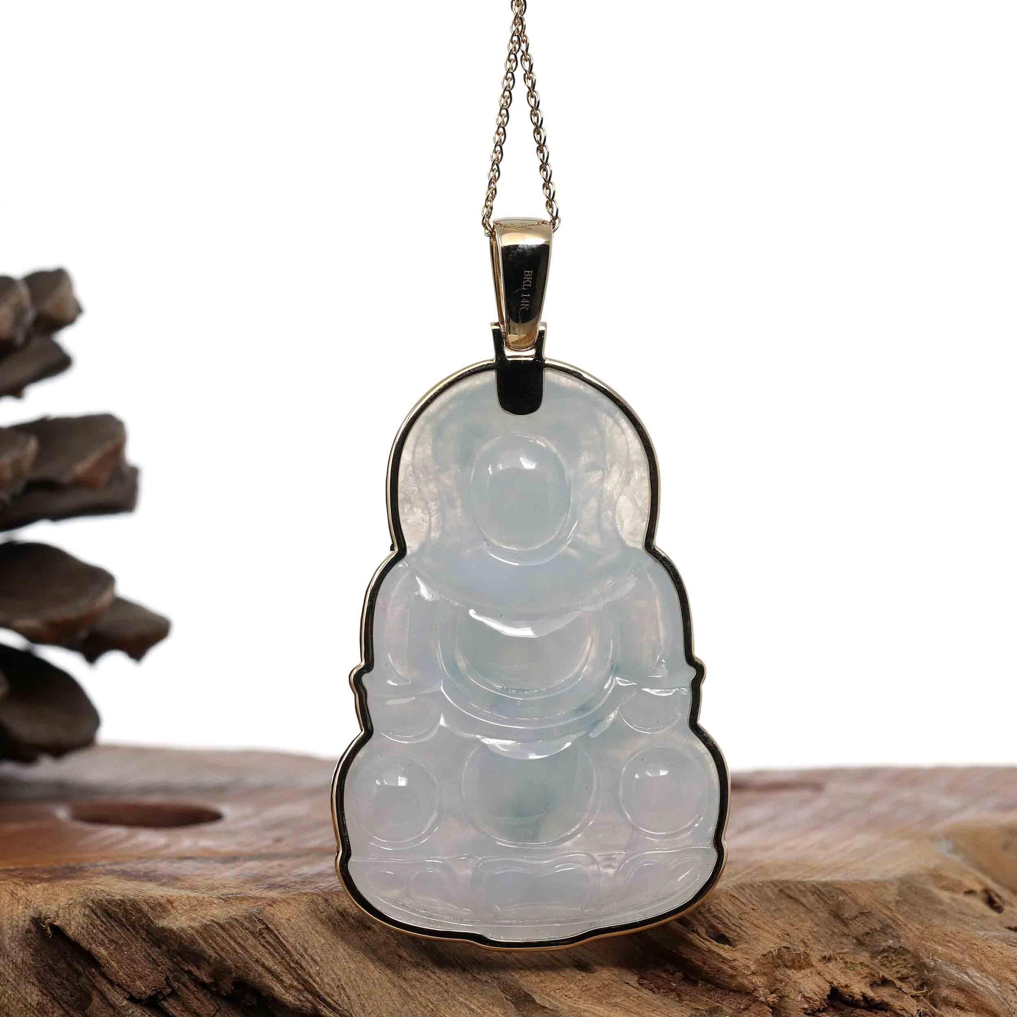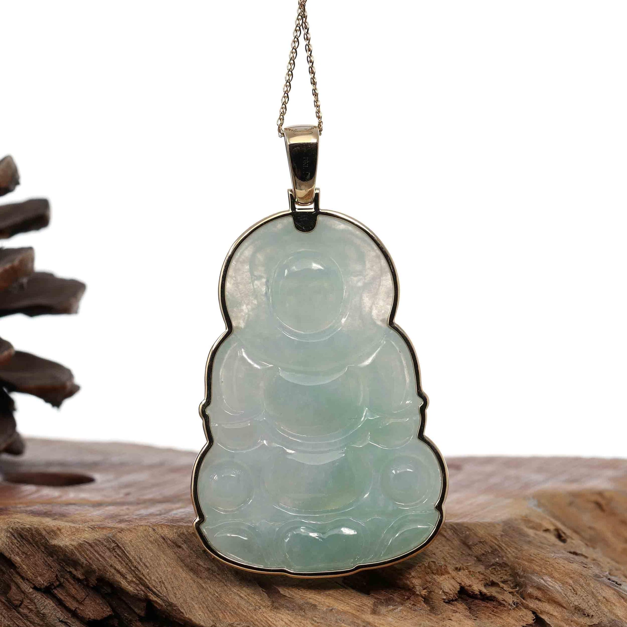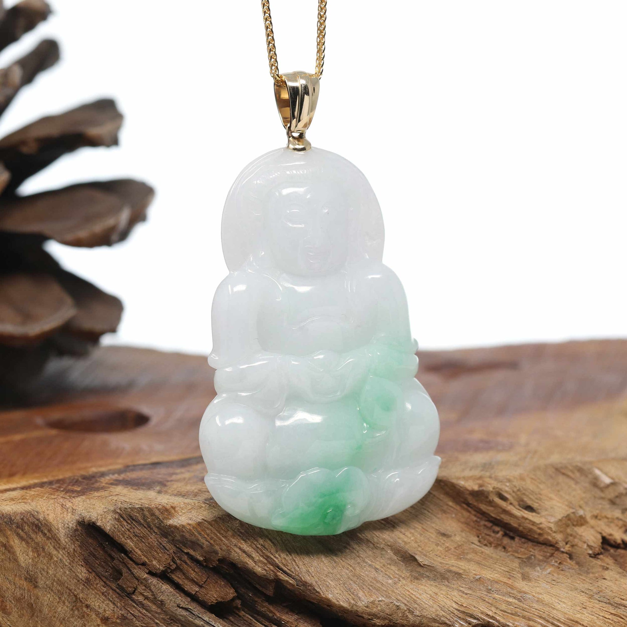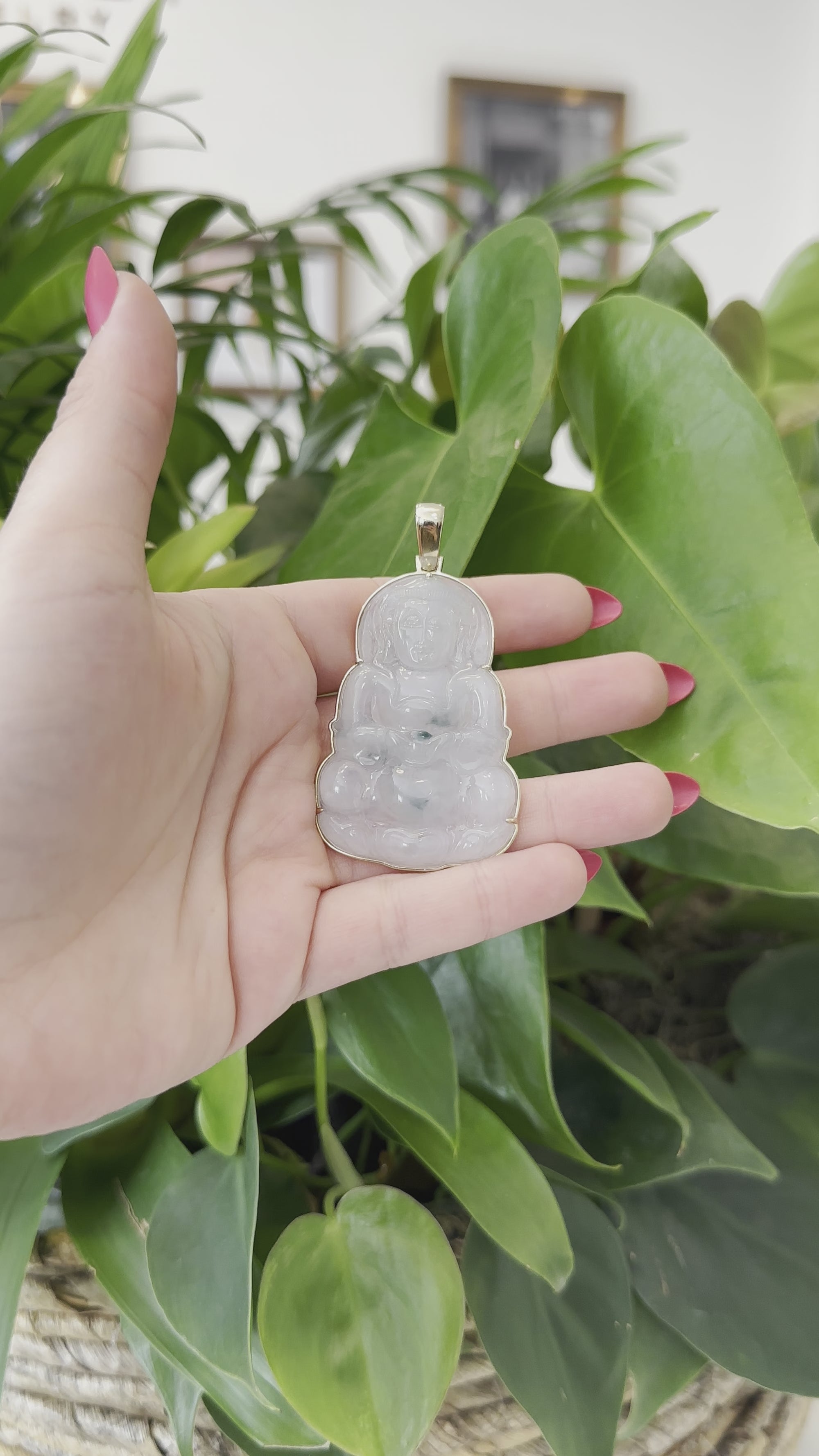 Baikalla 14k Yellow Gold "Goddess of Compassion" Genuine Ice Burmese Jadeite Jade Guanyin Necklace With Gold Bail