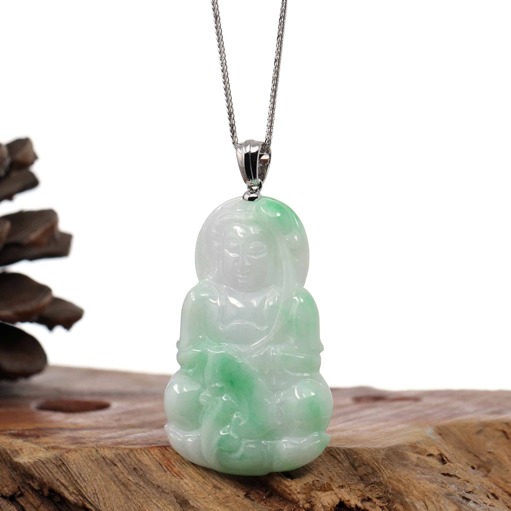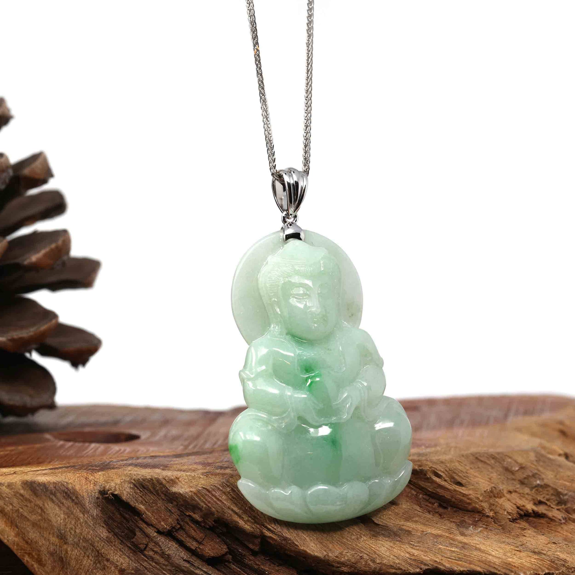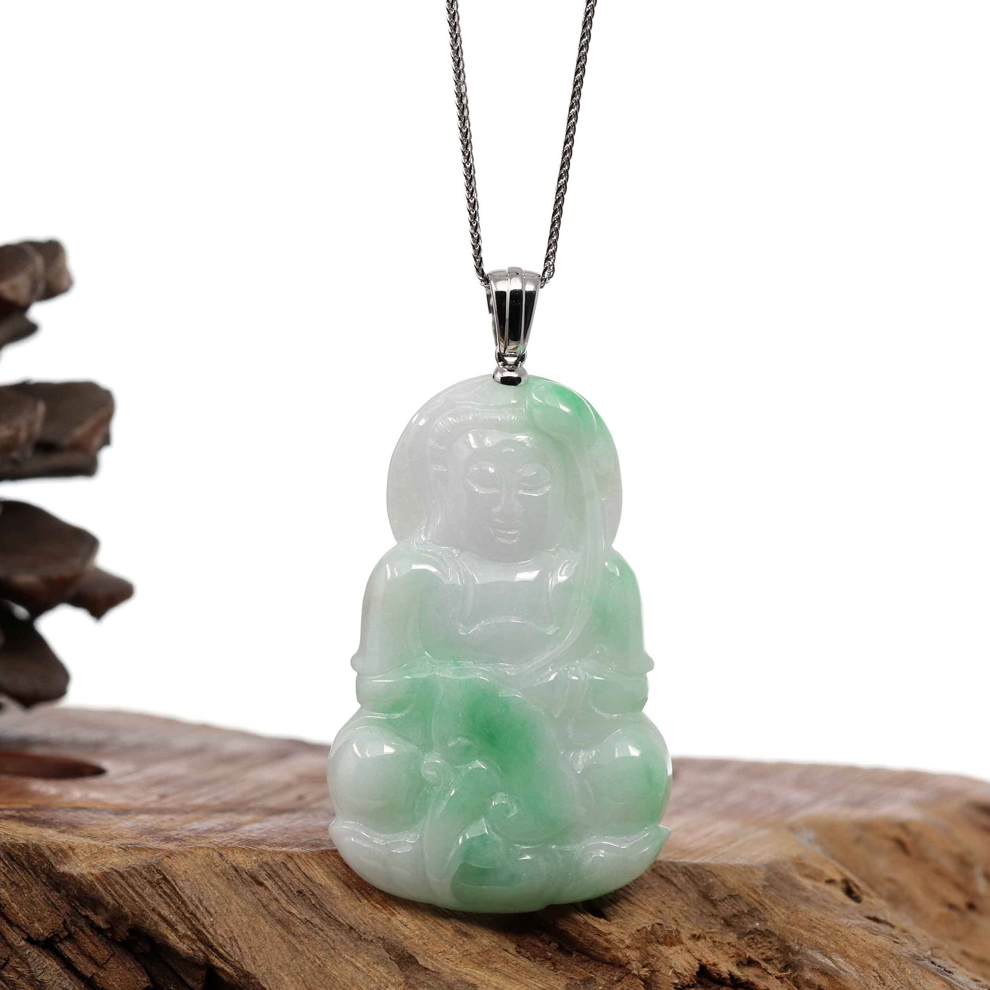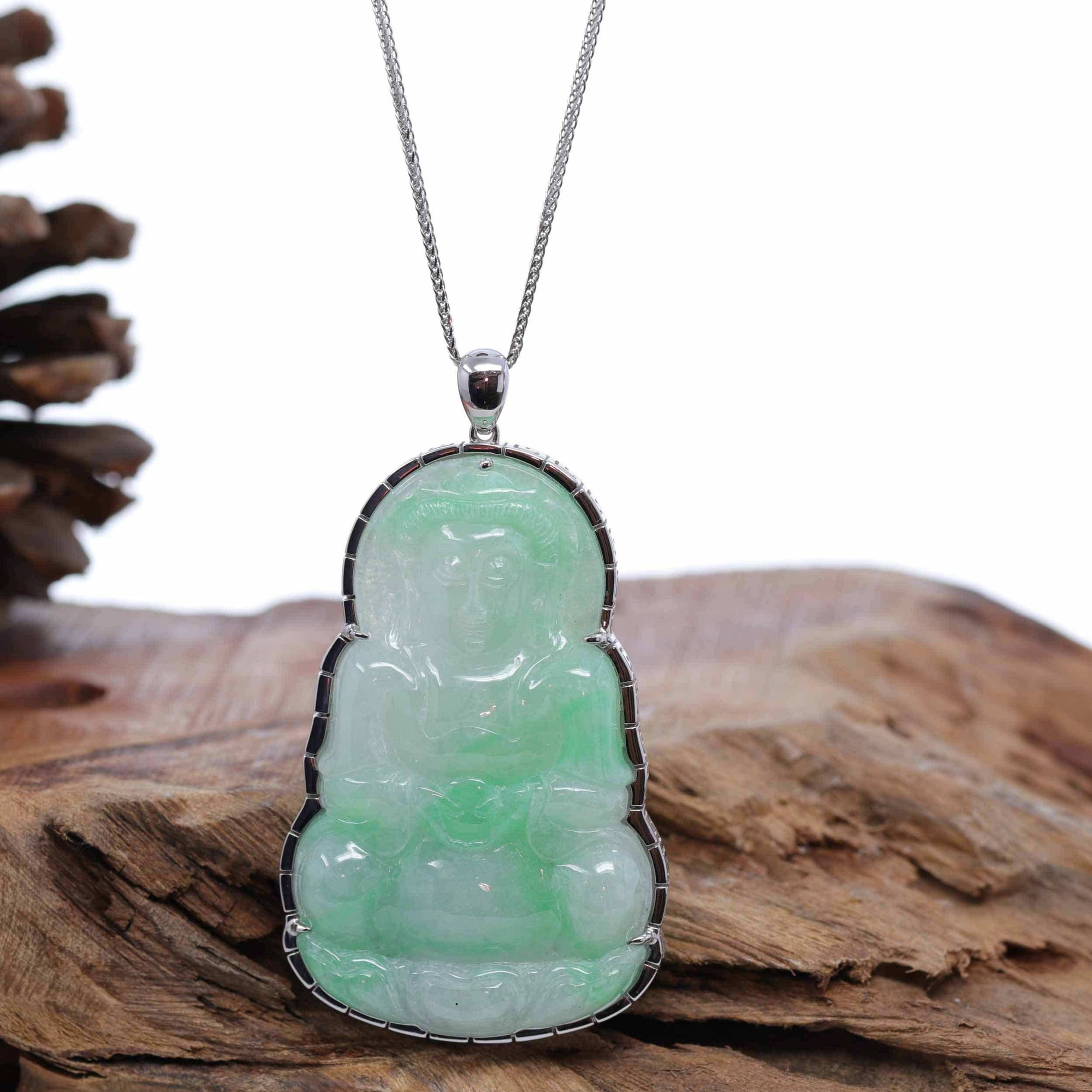 Baikalla Jewelry Jade Guanyin Pendant Necklace 14k White Gold "Goddess of Compassion" Genuine Green Jadeite Jade Guanyin Necklace With Gold Diamond Bail