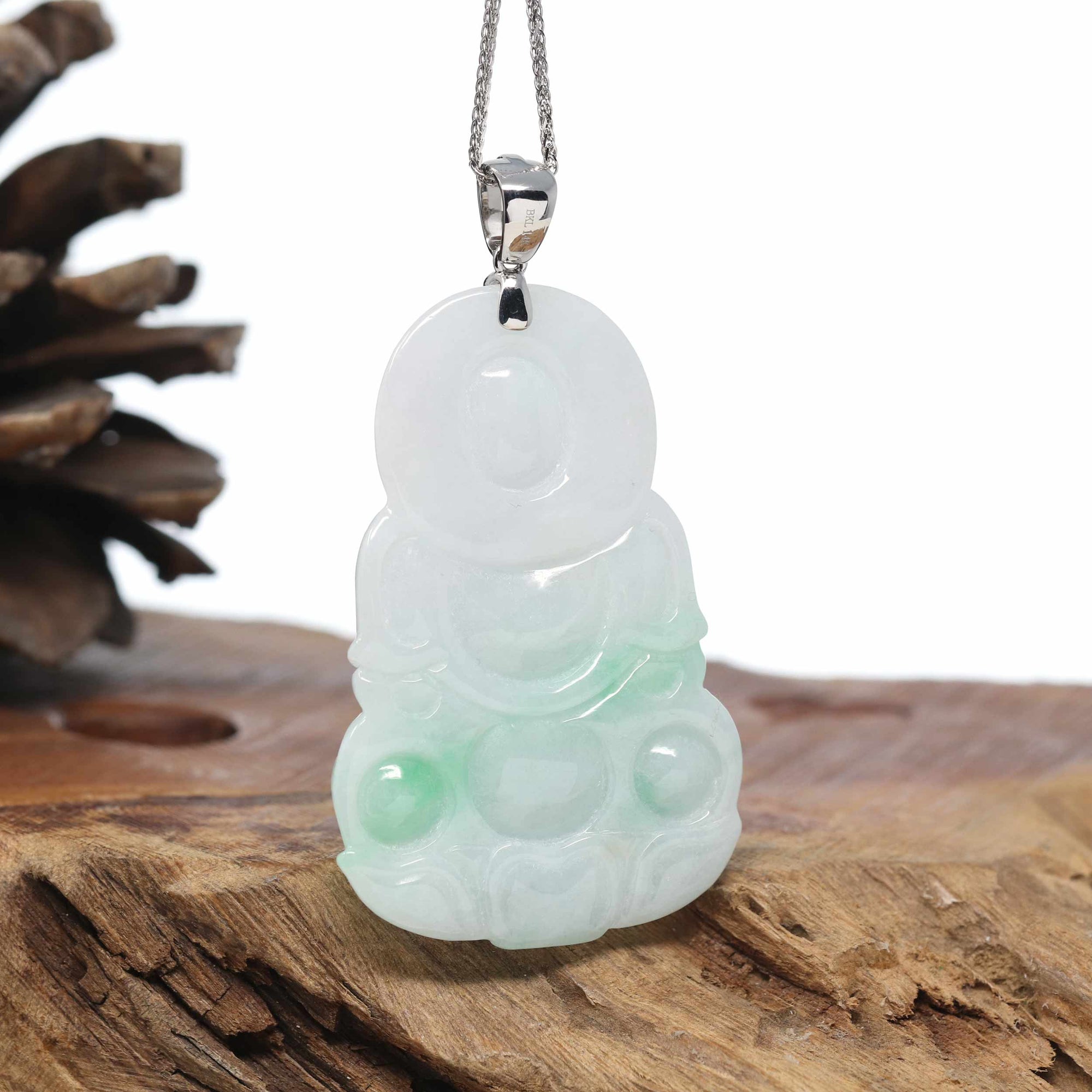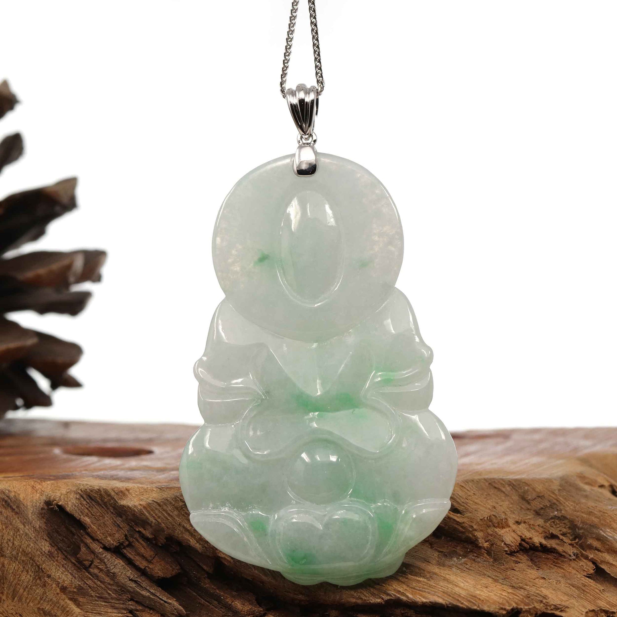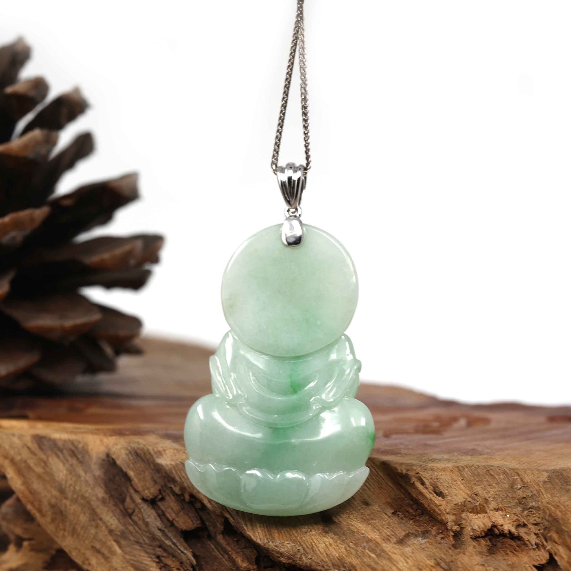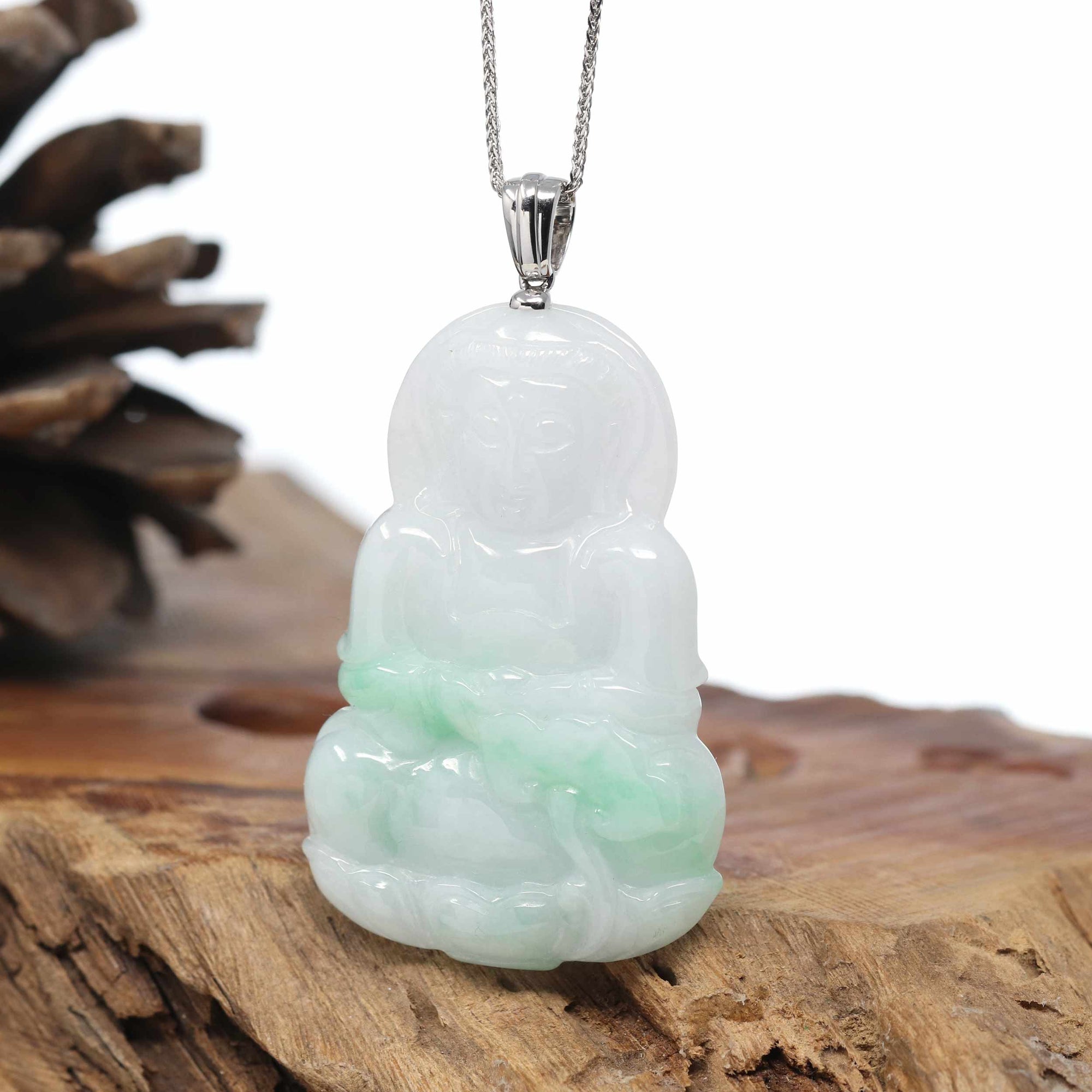 Baikalla Jewelry Jade Guanyin Pendant Necklace 14k White Gold "Goddess of Compassion" Genuine Green Jadeite Jade Guanyin Necklace With Gold Diamond Bail