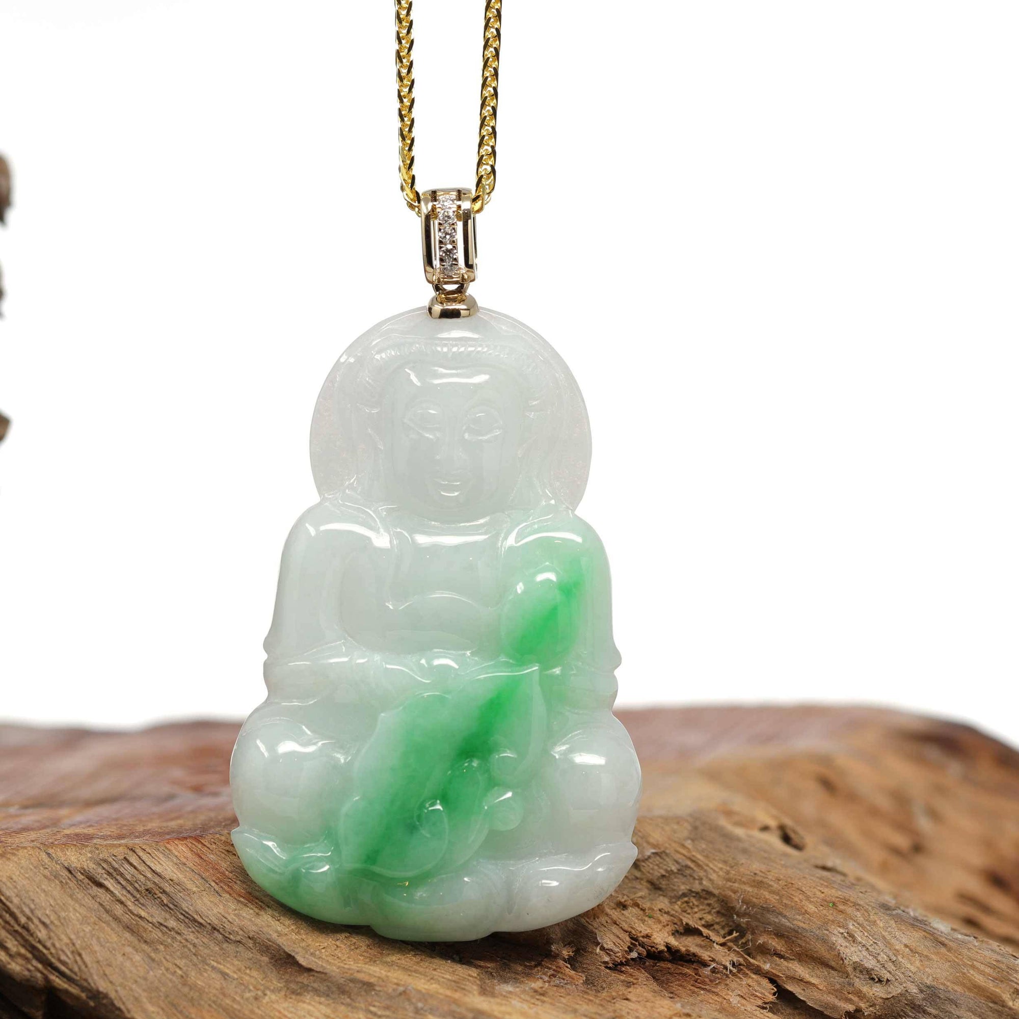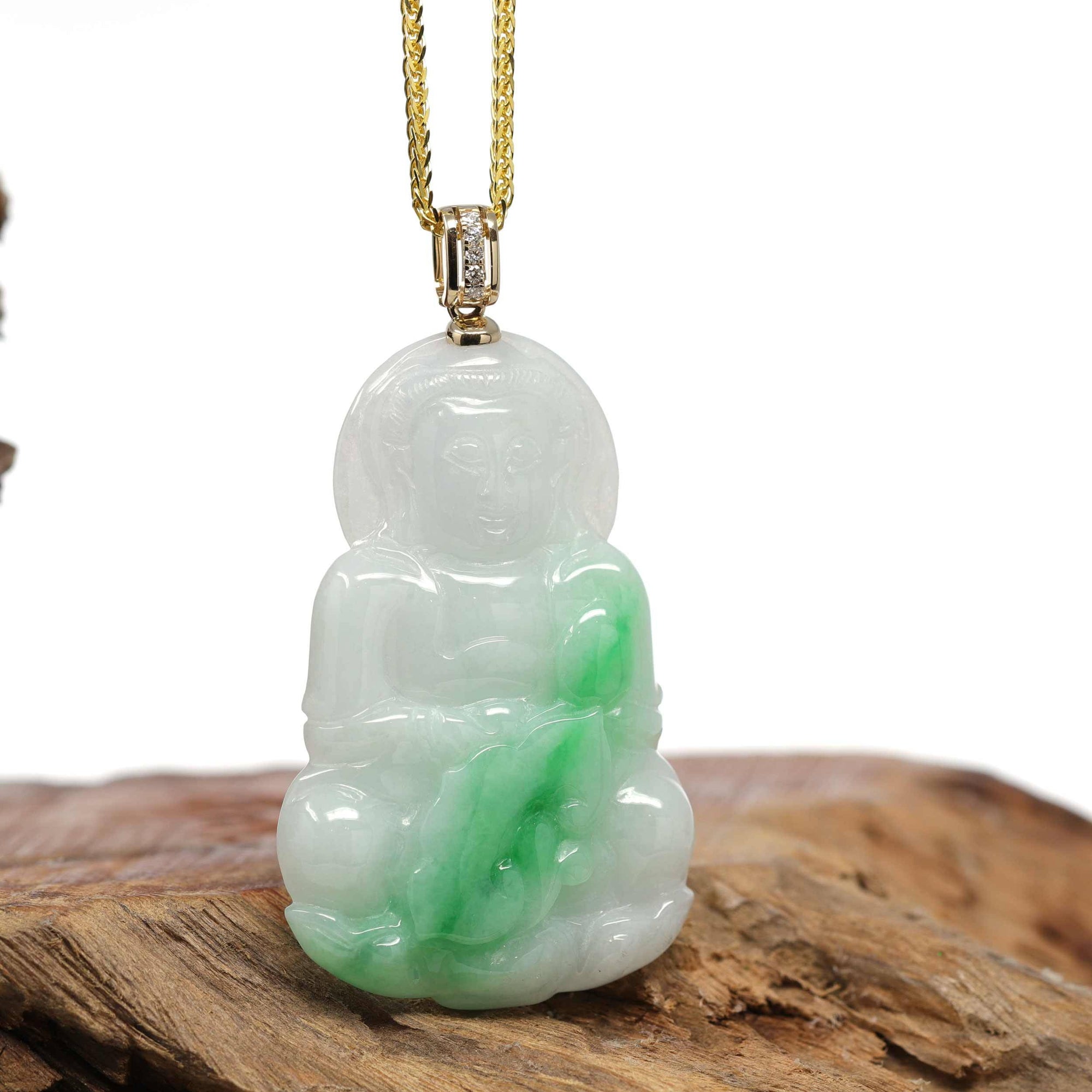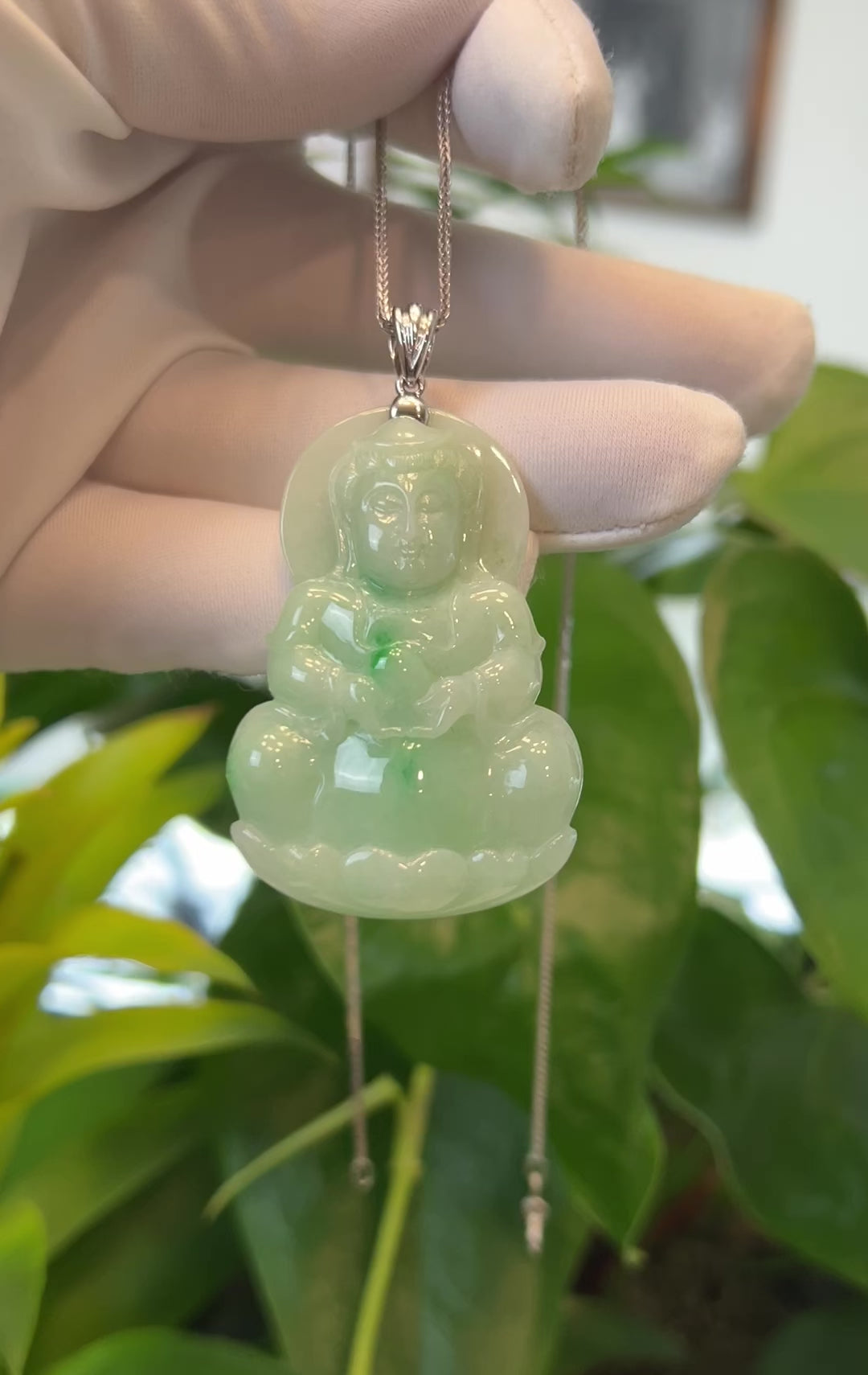 14k White Gold "Goddess of Compassion" Genuine Green Jadeite Jade Guanyin Necklace With Gold Diamond Bail