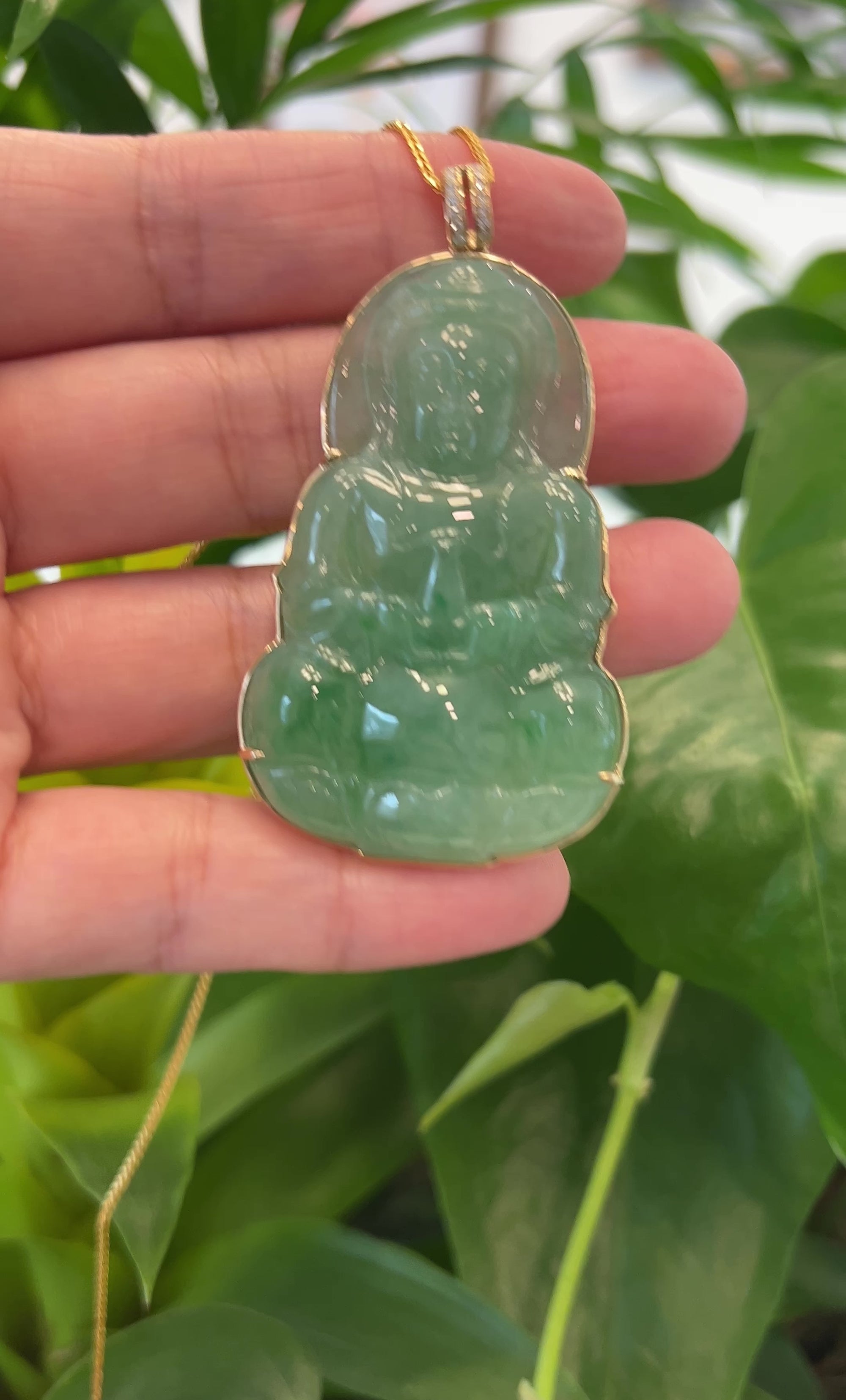 14k White Gold "Goddess of Compassion" Genuine Green Jadeite Jade Guanyin Necklace With Gold Diamond Bail