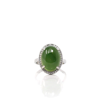 Baikalla™ Sterling Silver Natural Imperial Green Oval Jadeite Jade Ring With White Sapphire