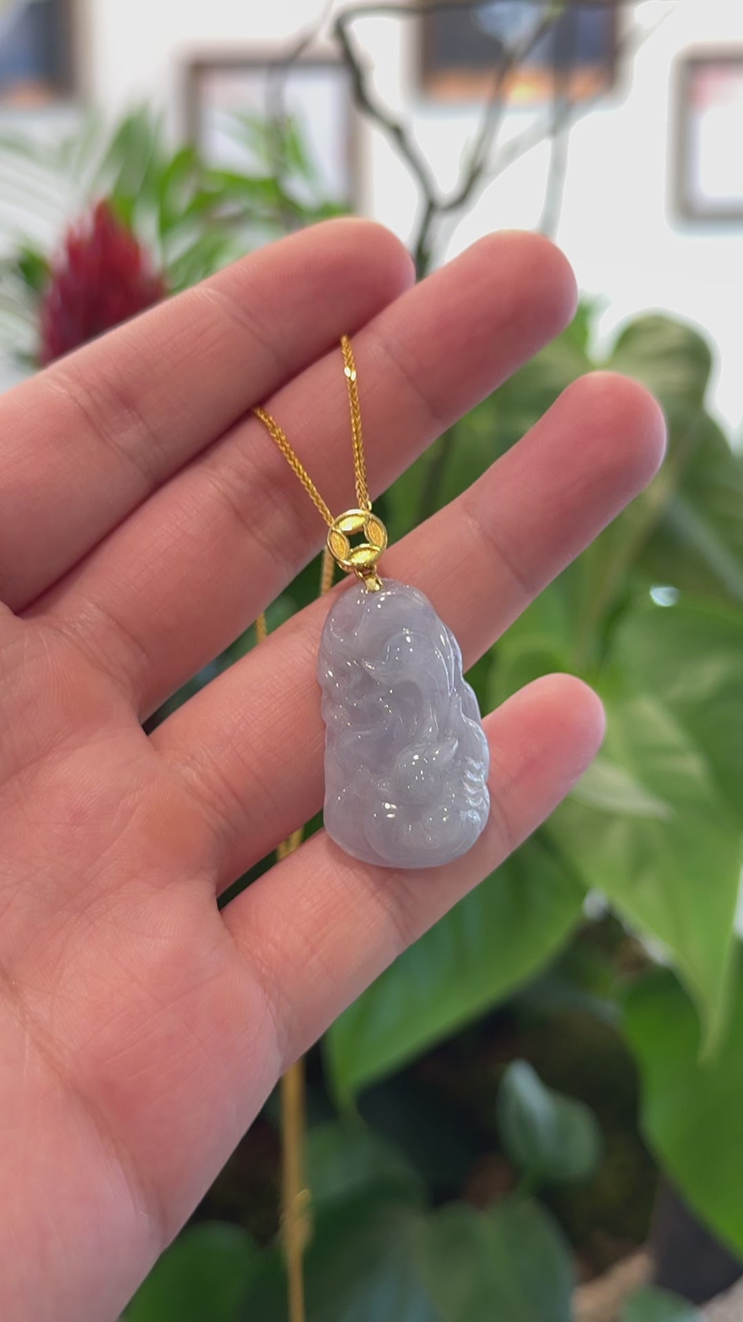 Genuine Burmese Lavender Jadeite Jade Nine Tailed Fox Pendant Necklace With 18K Gold Bail
