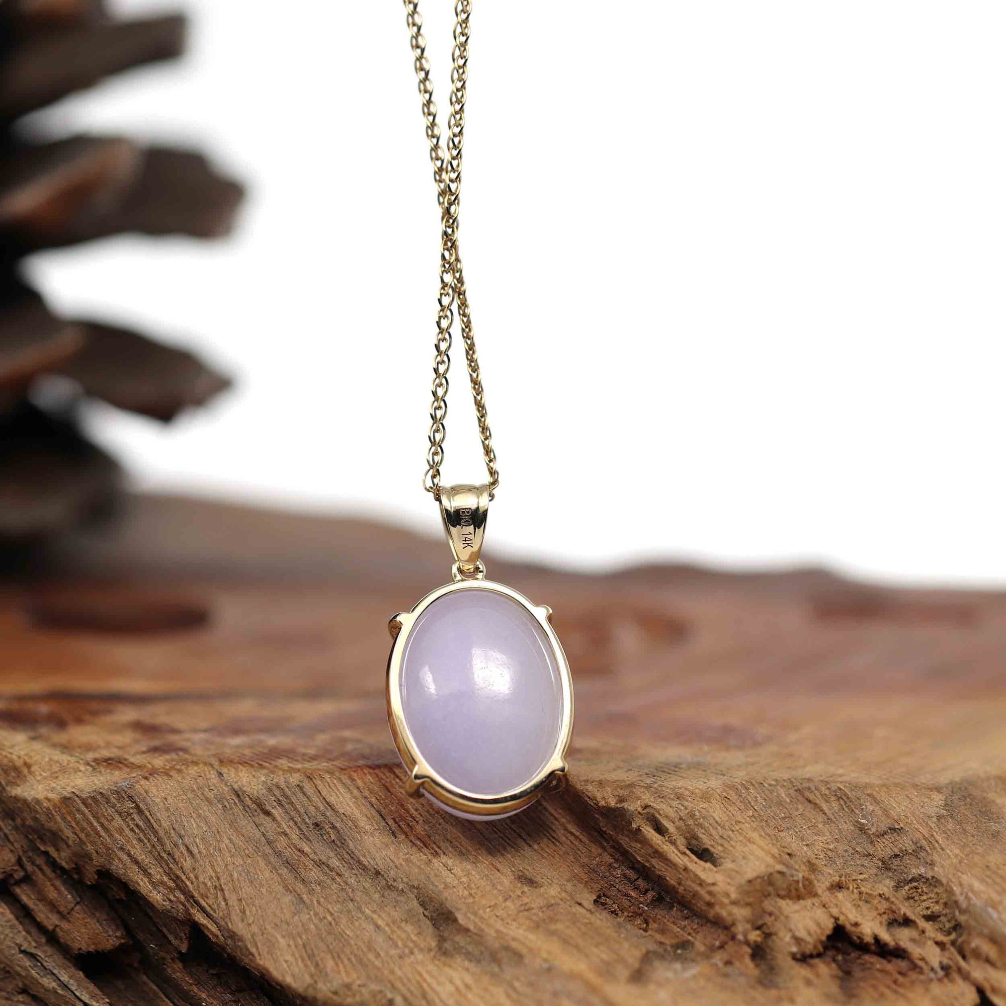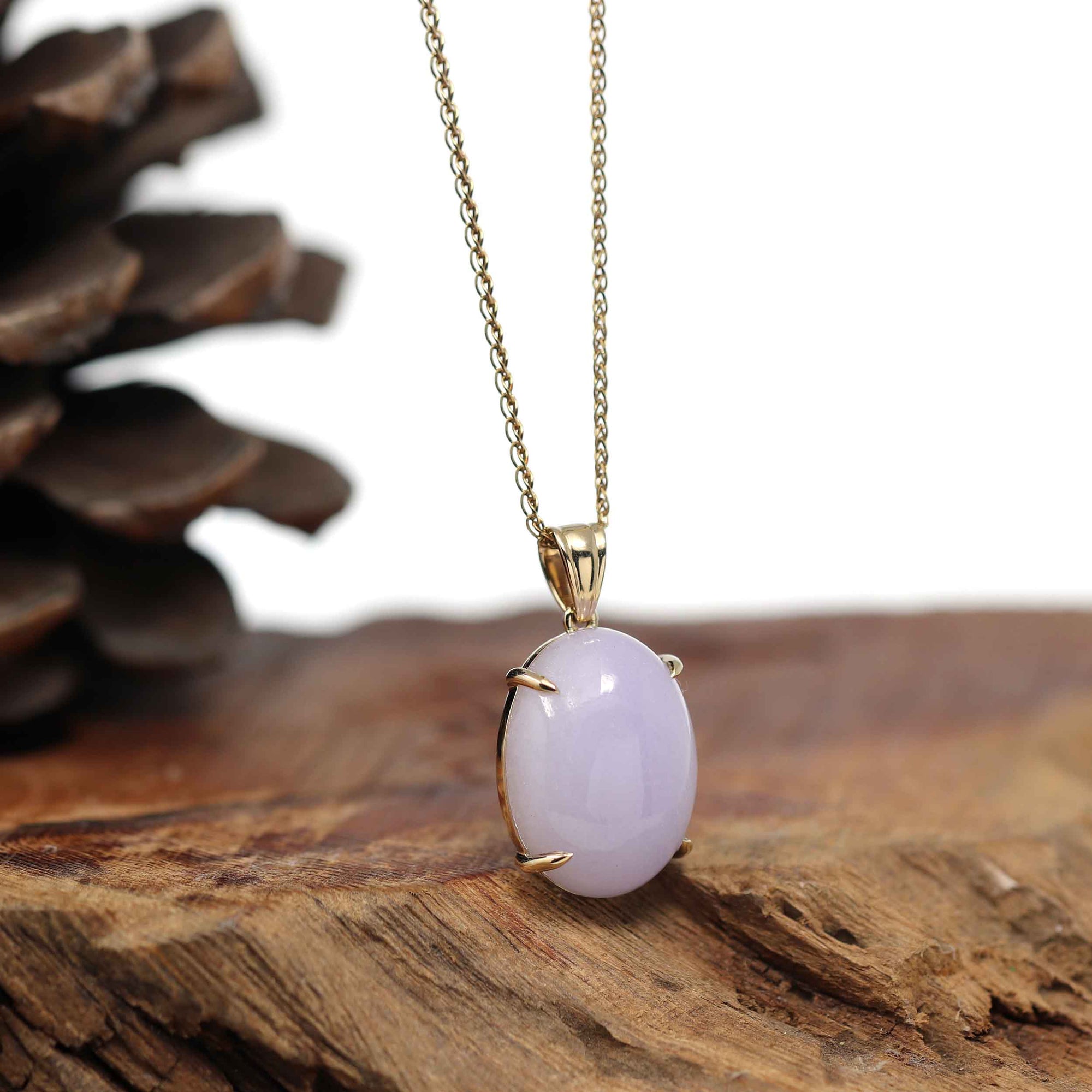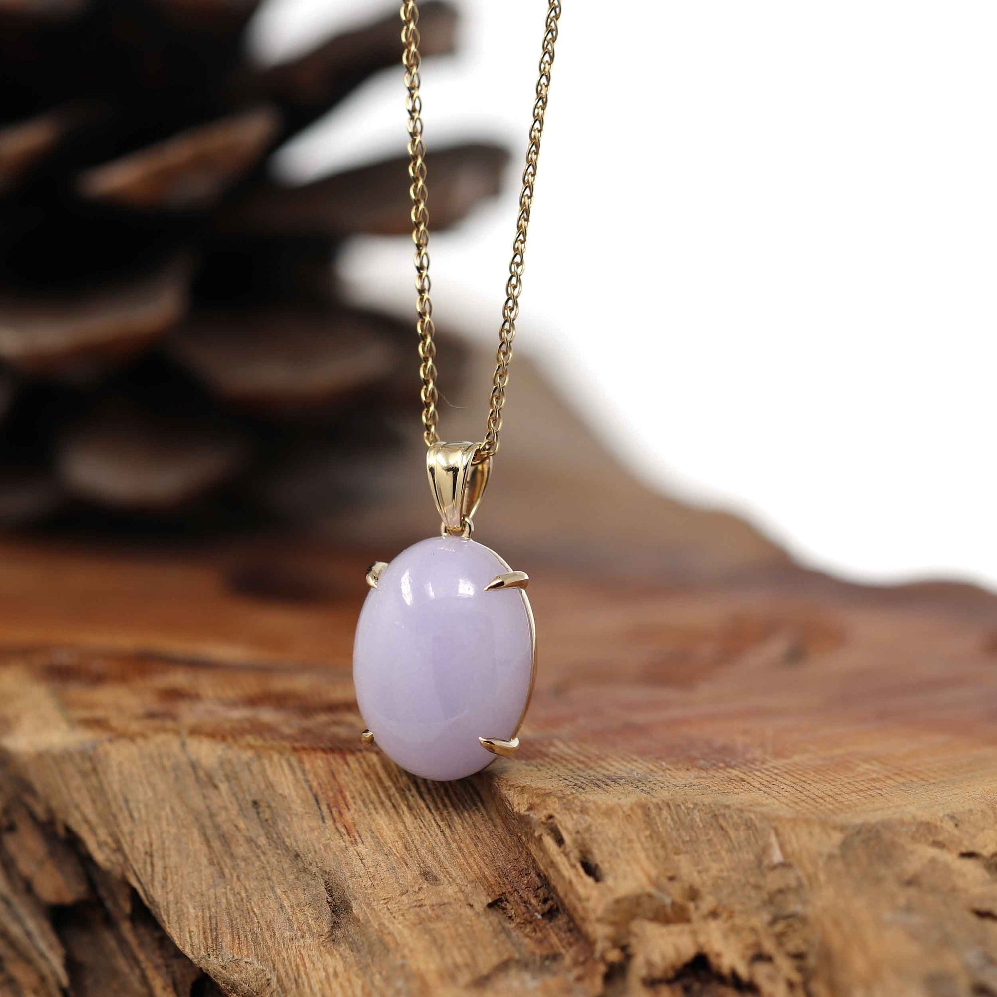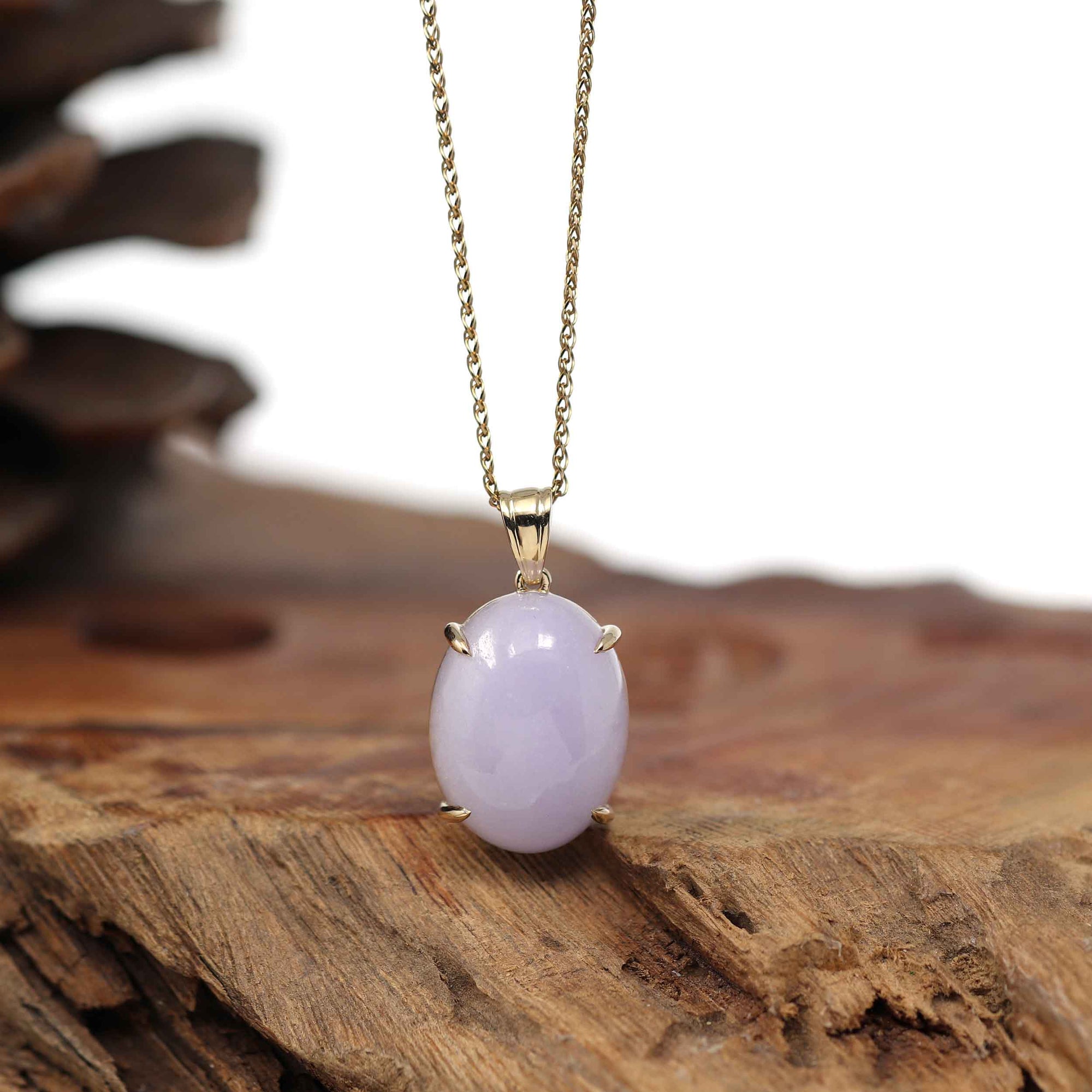 * DESIGN CONCEPT--- Introducing our exquisite 14K Gold Natural Lavender Burmese Jadeite Cabochon Necklace, a true embodiment of elegance and sophistication. Surrounded in a classic four prong 14k gold setting, the jades beautiful vibrant lavender hue is displayed stunningly. Purple Jadeite represents good luck, wealth, and safety for whoever wears it. Whether you're looking for a meaningful gift or a timeless piece for yourself, our 14K Gold Natural Lavender Burmese Jadeite Cabochon Necklace is a testament to the enduring allure of fine jewelry.
