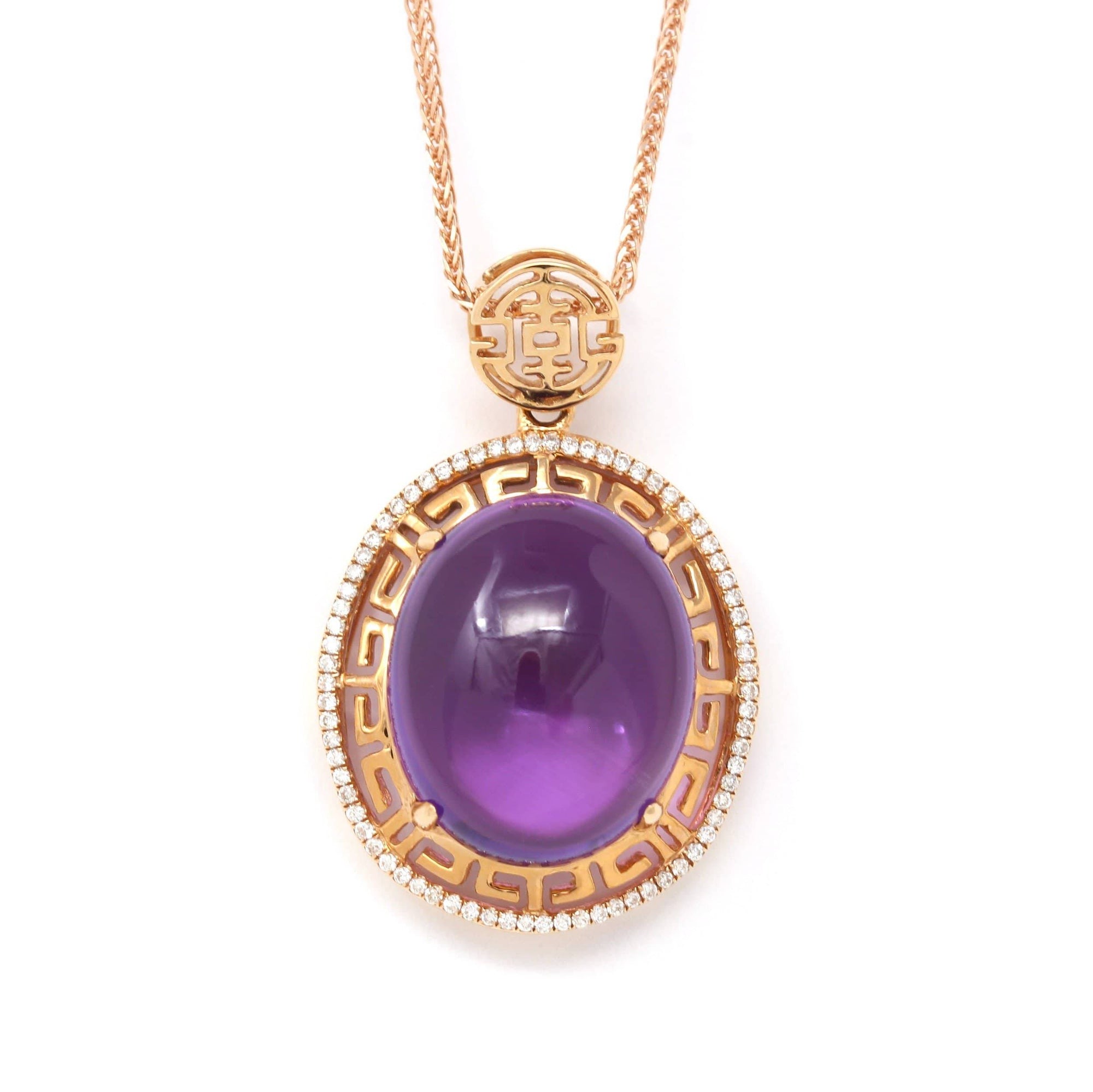 * INTRODUCTION----- This pendant made with high-quality genuine AAA nice purple amethyst & SI genuine diamonds. It looks so royal and exquisite. The luxury purple color stands out like no other. And the whole amethyst is so vibrant. The style is simple and classic with diamonds halo. The pattern of culture is exquisite. Every angles and line are so beautiful. It's a perfect gift for yourself and your love.