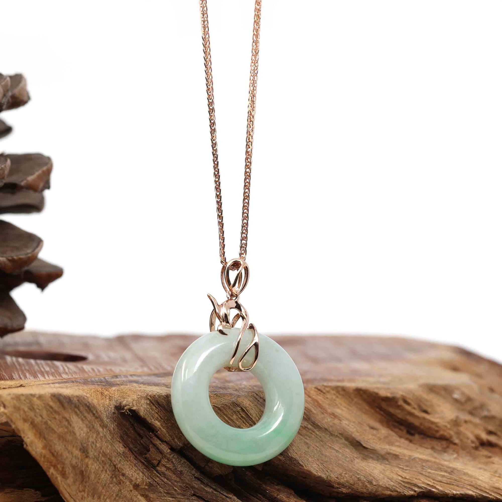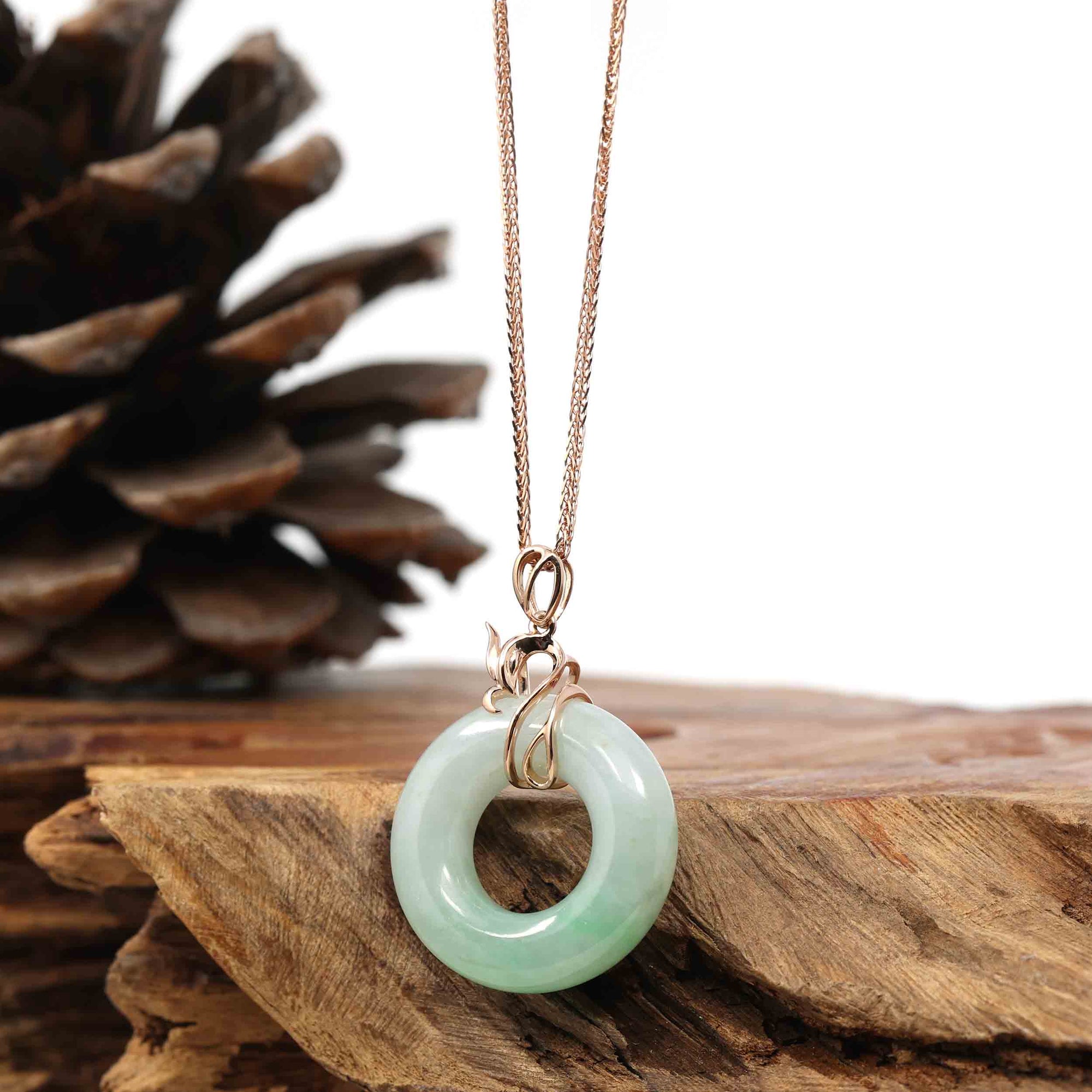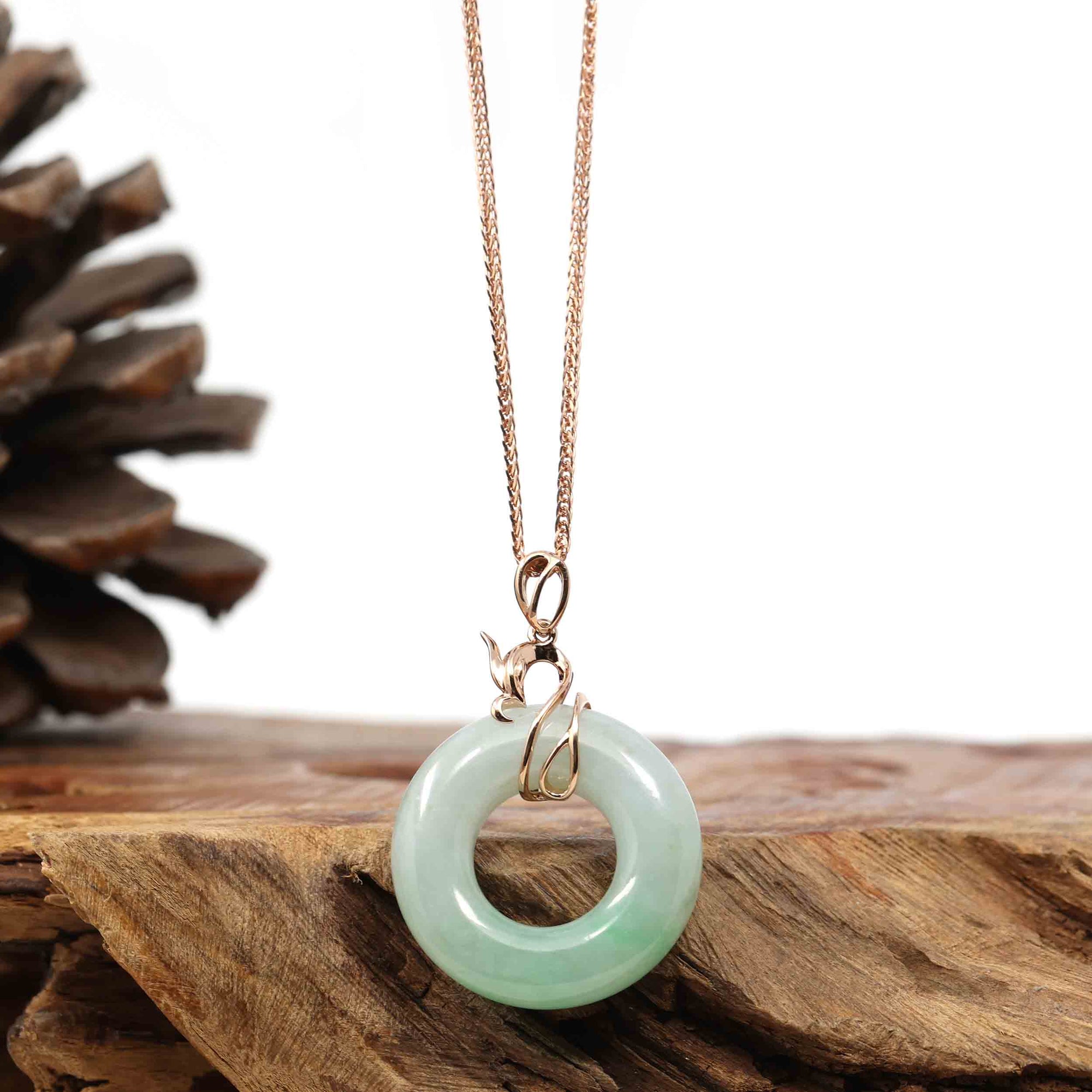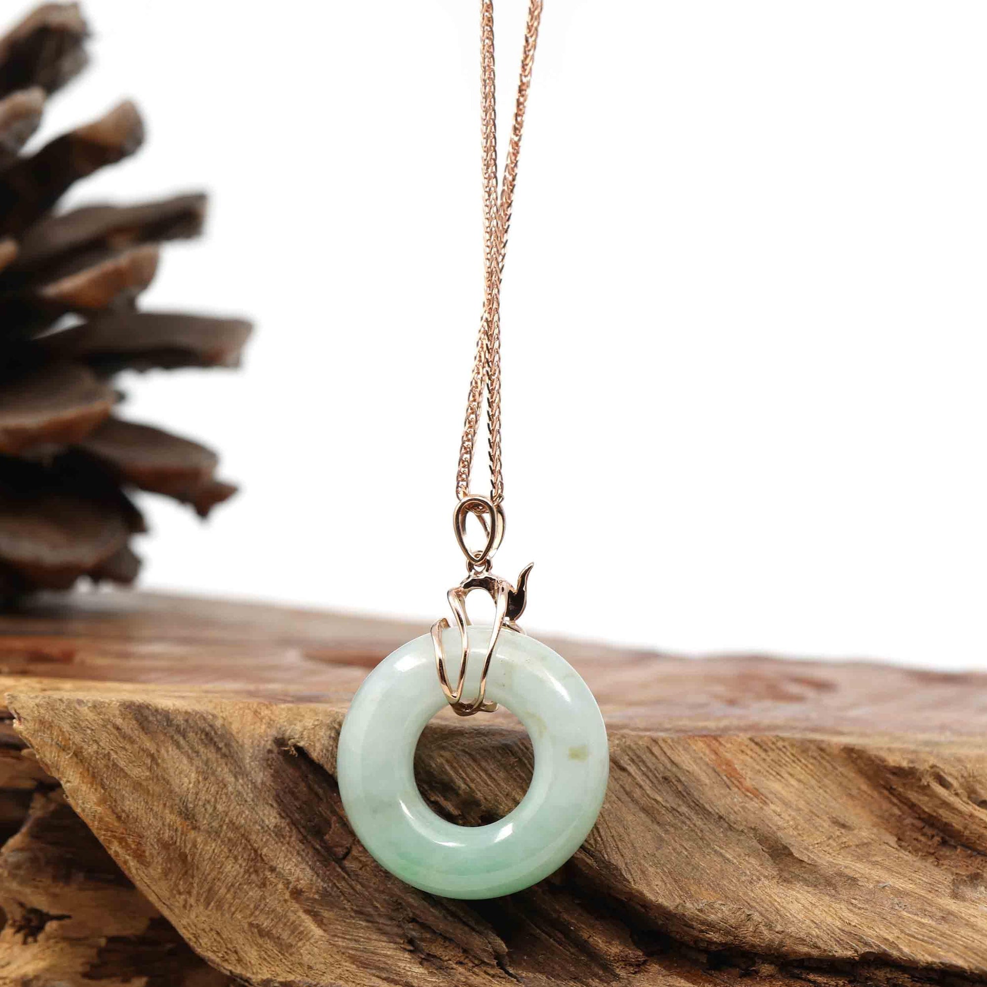 * DESIGN CONCEPT--- 18k Rose Gold & Genuine Burmese Jadeite Pendant Necklace. This pendant is made with high-quality genuine jadeite with some green, The jadeite piece looks so clean and smooth without any clouds or cracks or any dirty spots. And it's translucent like there is water inside. The jadeite pendant's style is a good luck bird standing on the lucky "Circle Of Heaven". It means prosperity, good luck, and safety. The pendant looks so lovely and exquisite. It's a perfect gift for yourself and your love.