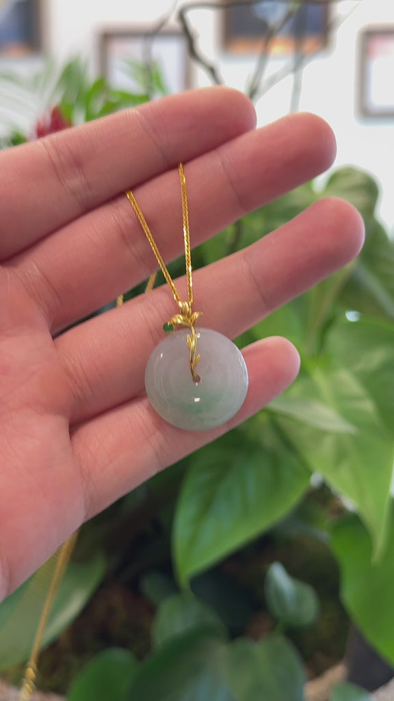 * Design Concept--- The simple shape of a circle represents things such as happiness, wholeness, and prosperity. This necklace is made with very high-quality genuine Burmese lavender green jadeite jade. and made with a simple 18K yellow solid gold flower bail. The texture is very translucent. looks very clear and lovely. Gifting one of these is like wishing the best of luck to your family or loved ones. It's a significant gift.