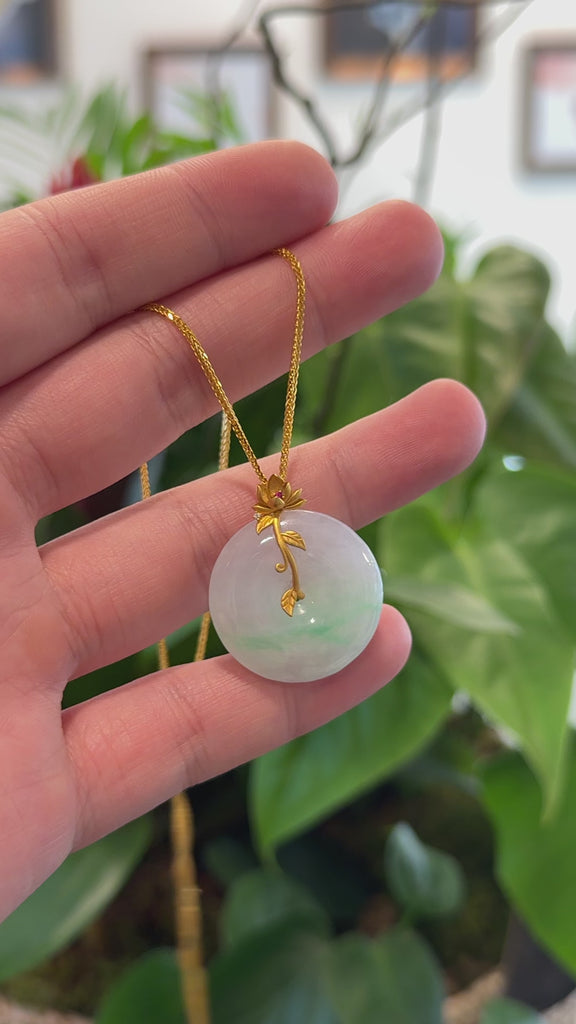 * Design Concept--- The simple shape of a circle represents things such as happiness, wholeness, and prosperity. This necklace is made with very high-quality genuine Burmese lavender green jadeite jade. and made with a simple 18K yellow solid gold flower bail. The texture is very translucent. looks very clear and lovely.  Gifting one of these is like wishing the best of luck to your family or loved ones. It's a significant gift.