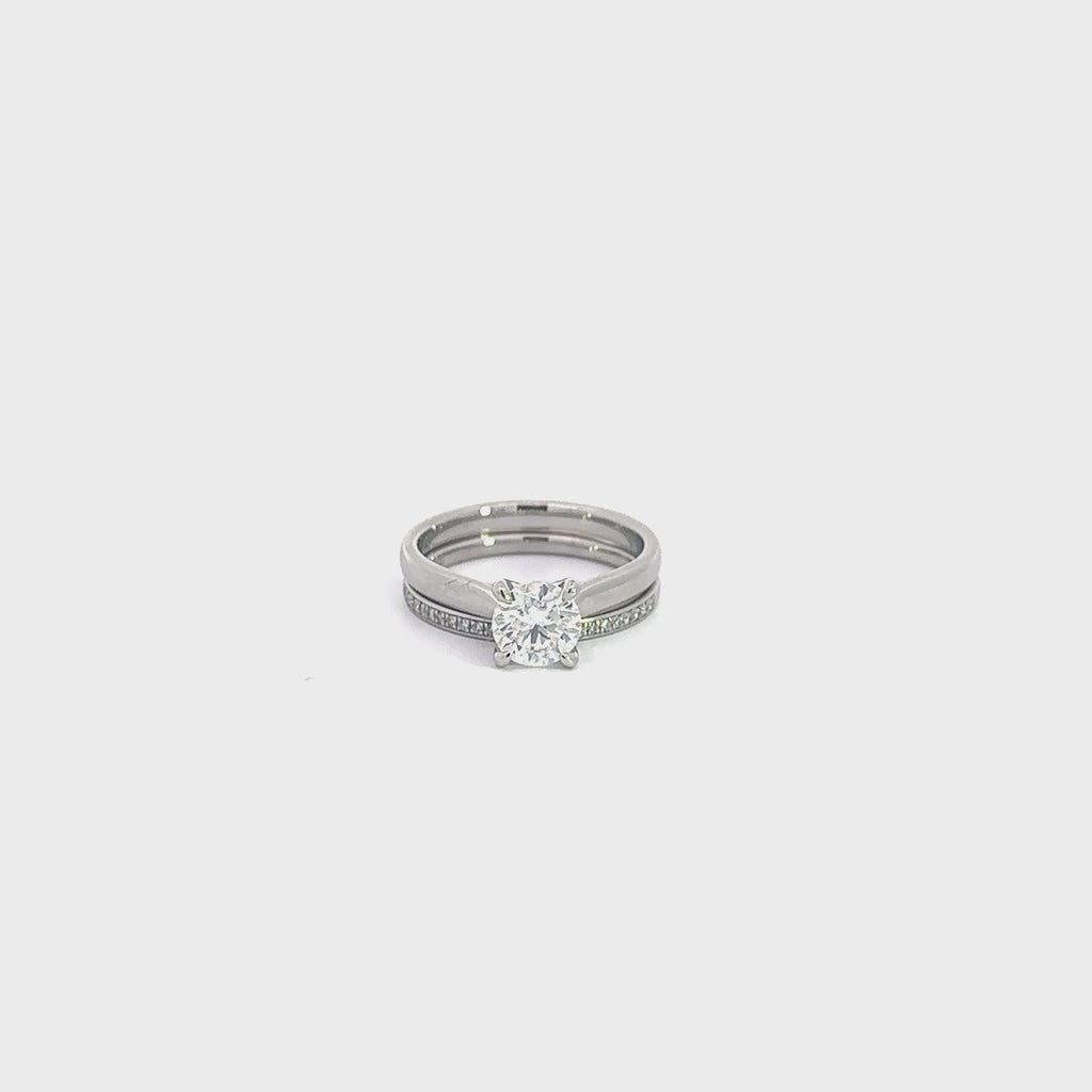 a captivating moissanite, its brilliance rivaling the finest diamonds, set against the purity of platinum. Highlighting this stunning engagement ring is the wedding band decorated in the finest dazzling diamonds. Let these two rings be