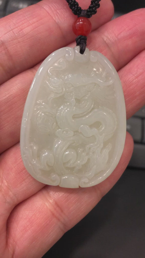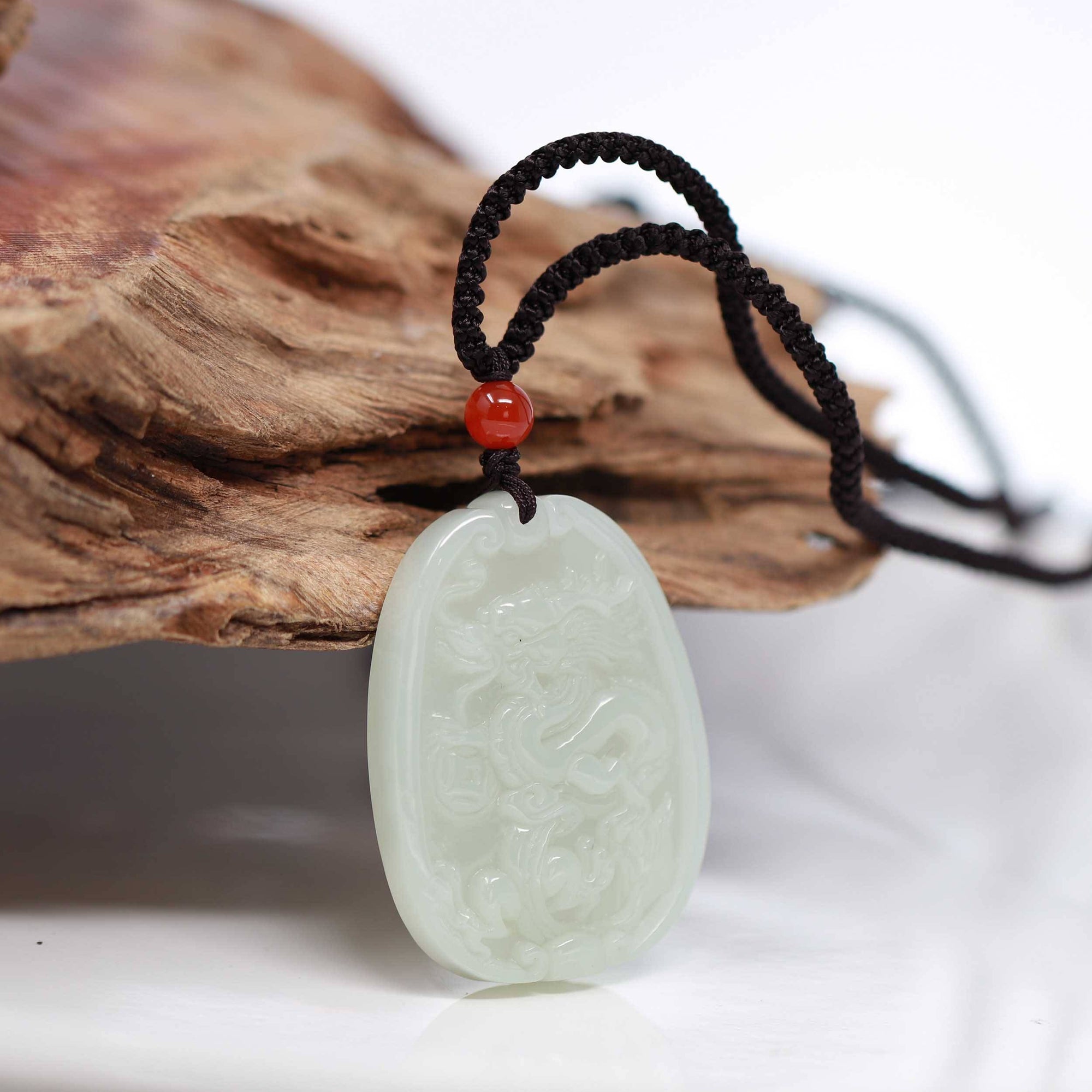 *Design concept--- Meaning of Dragons: The symbol of dragon has been a sign on power, protection and wealth for many many years. This necklace is carved with natural He Tian Nephrite Jade. It is believed that the person who bares the the necklace will attract wealth, good fortune and safety. Which makes this a perfect gift for a business man or a good friend going on a journey or just a normal good wish gift!