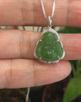 Baikalla™ "Laughing Buddha" 14k White Gold Genuine Nephrite Green Jade with Moissanite