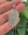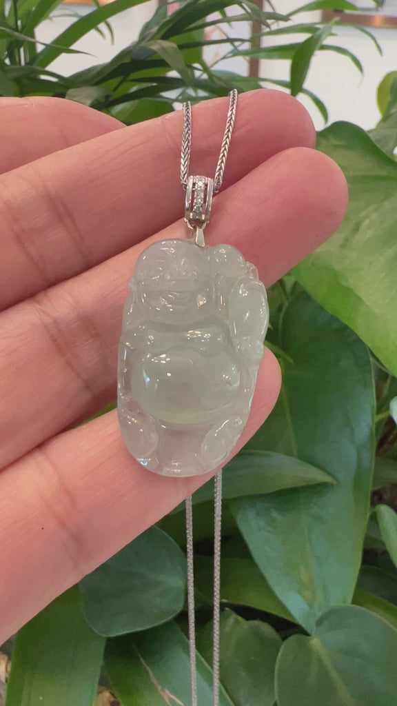 Baikalla™ "Laughing Buddha" Genuine Vibrant Green Jadeite Buddha Pendant Necklace With 14k White Gold Diamond  Bail