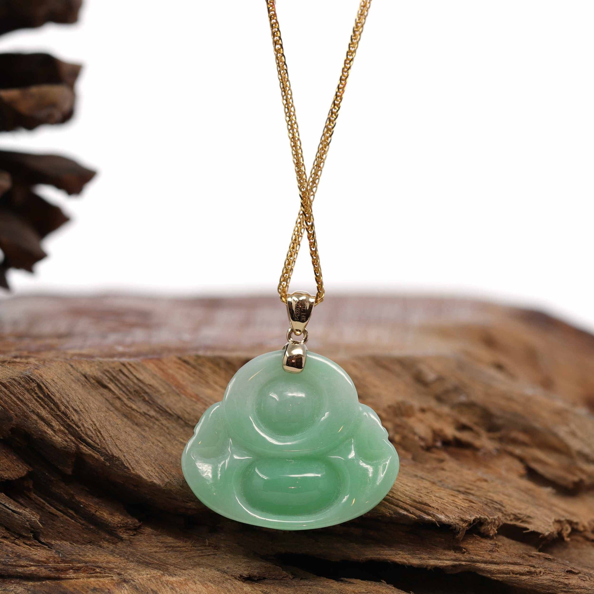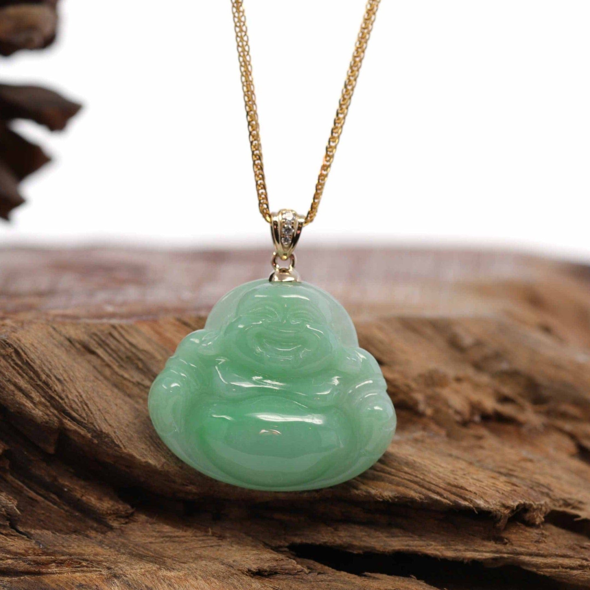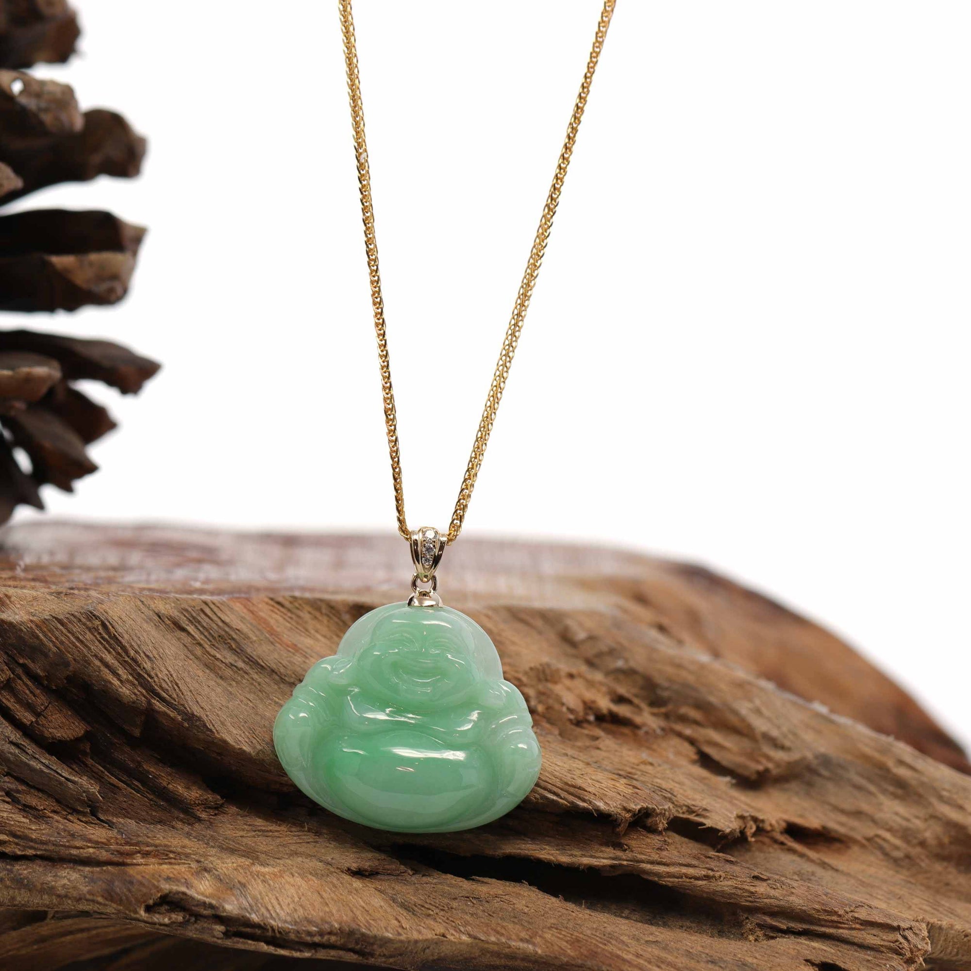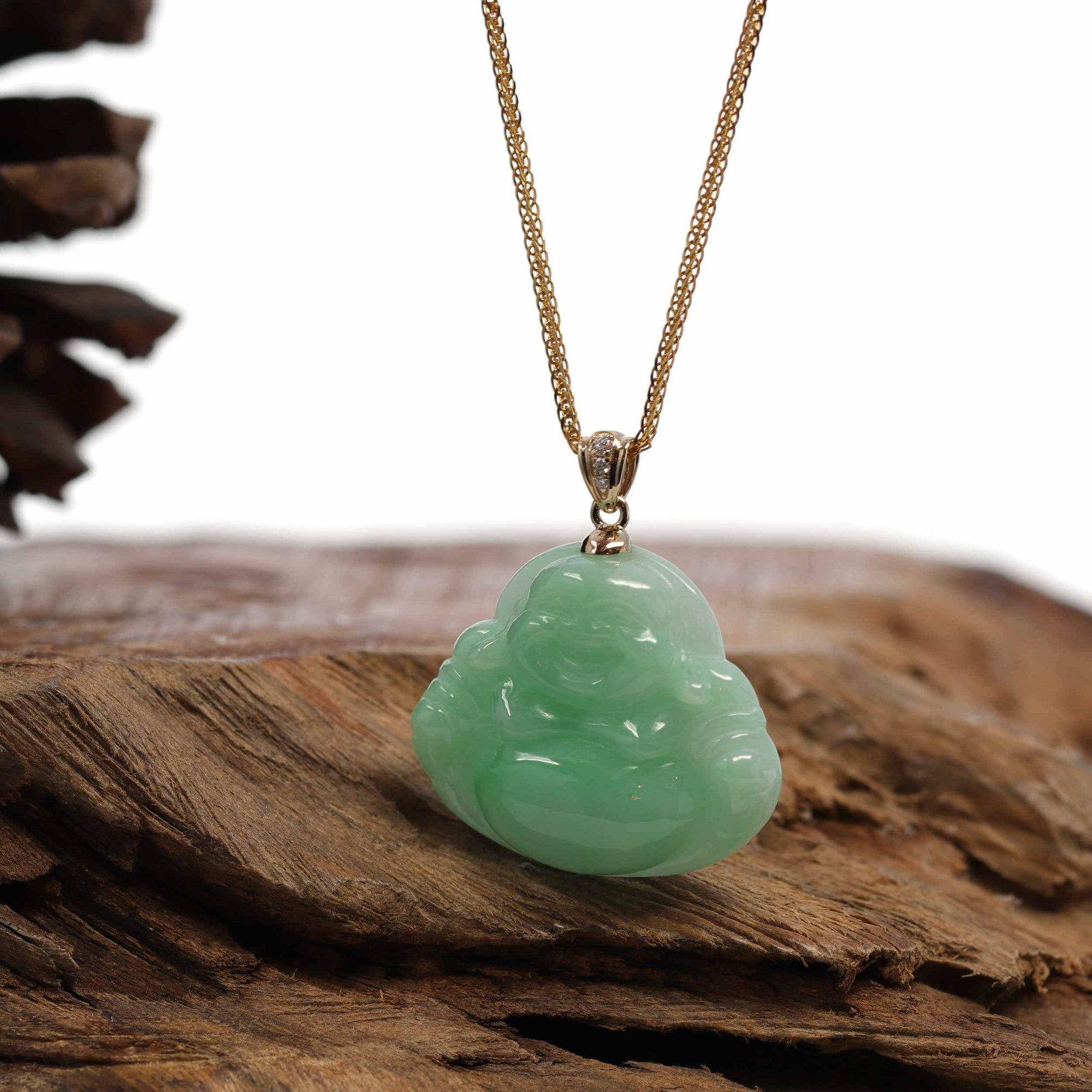Baikalla™ "Laughing Buddha" Genuine Vibrant Green Jadeite Buddha Pendant Necklace With 14k Yellow Gold Diamond Bail